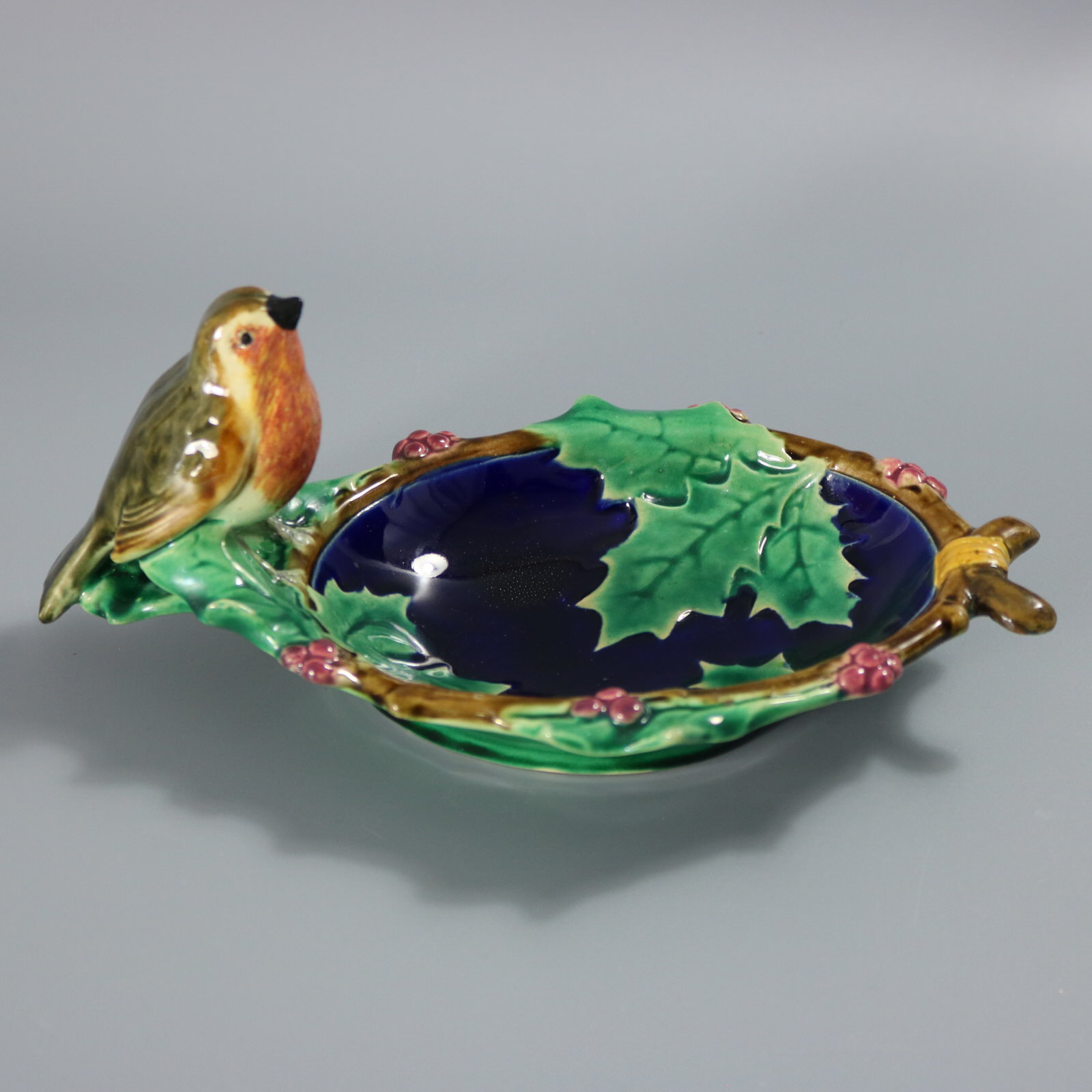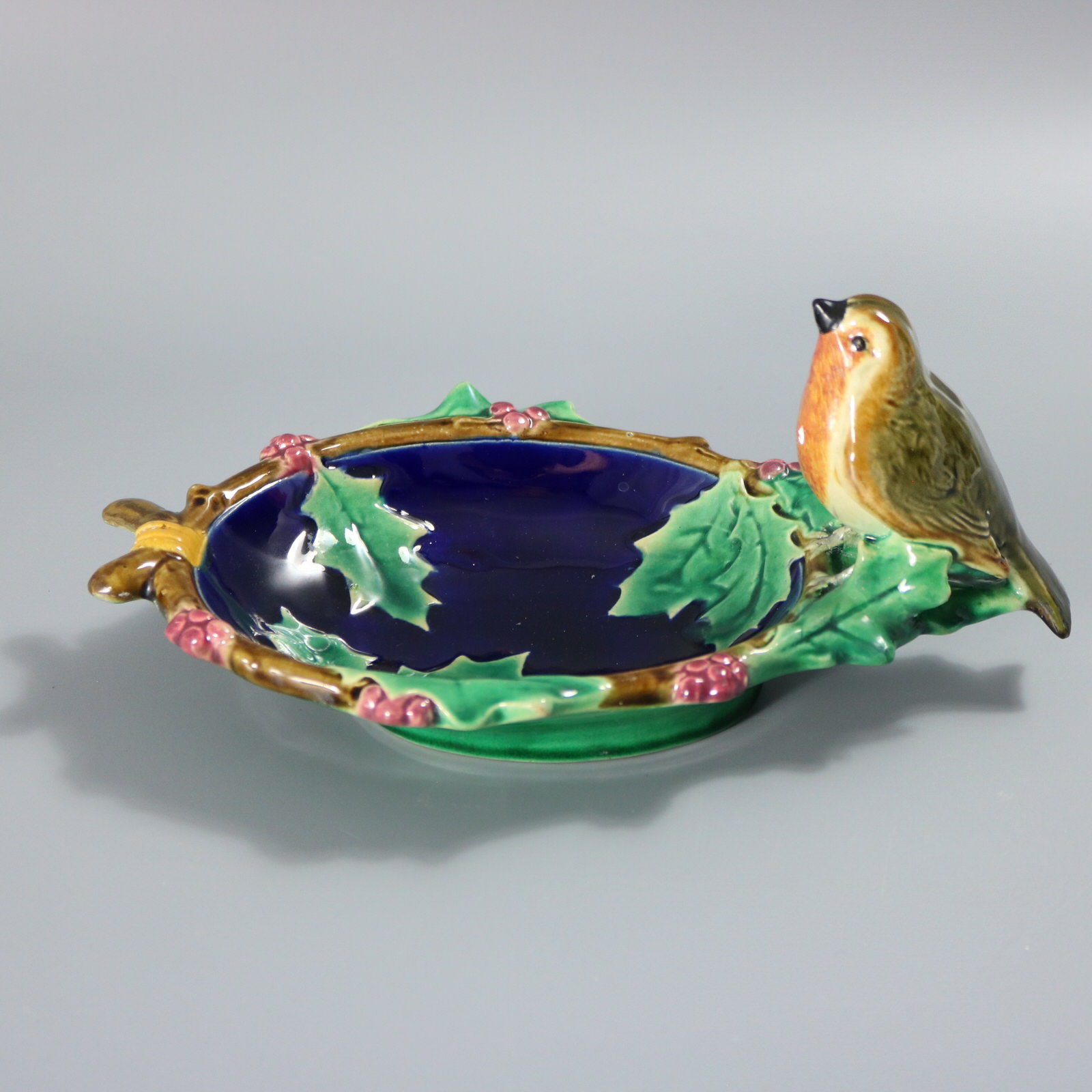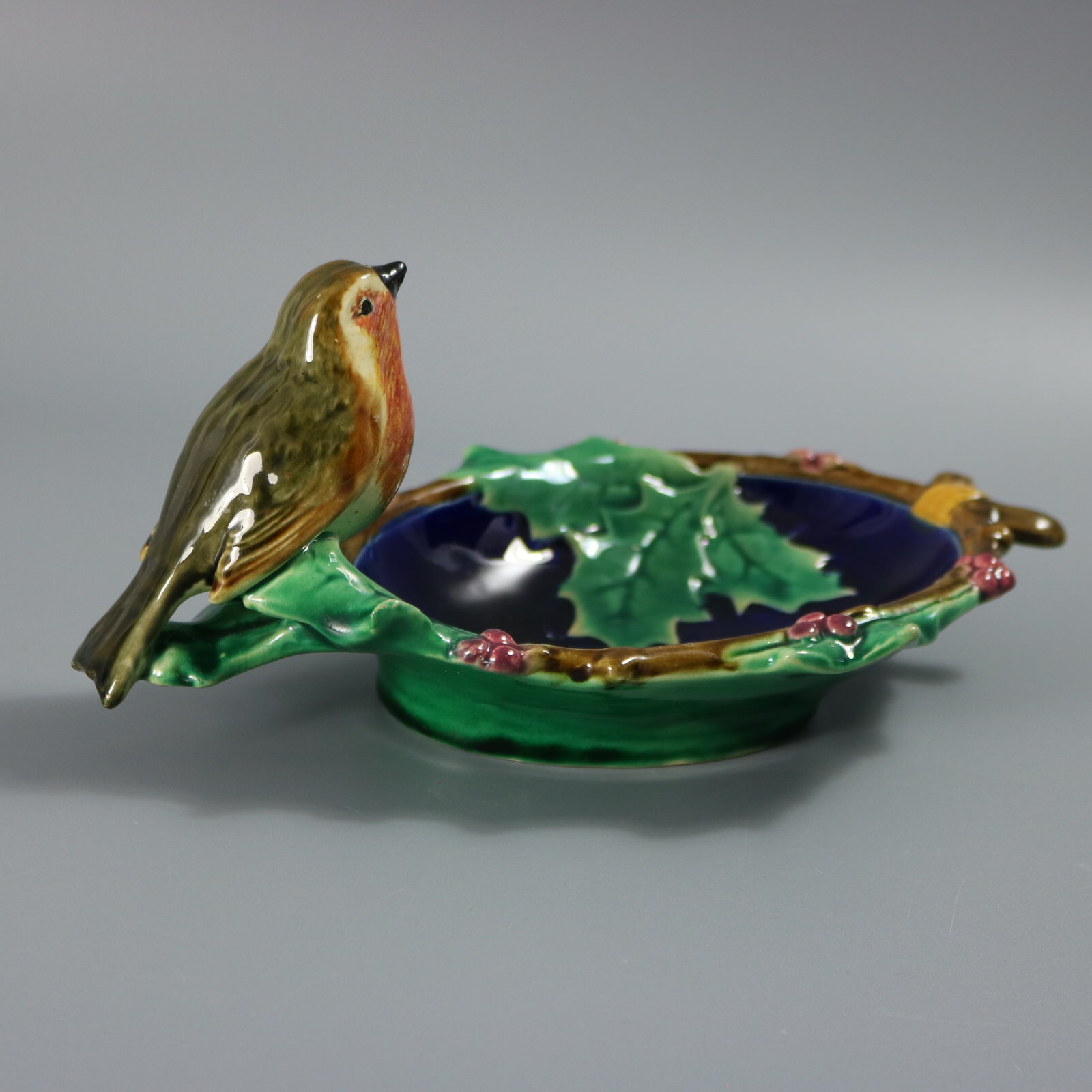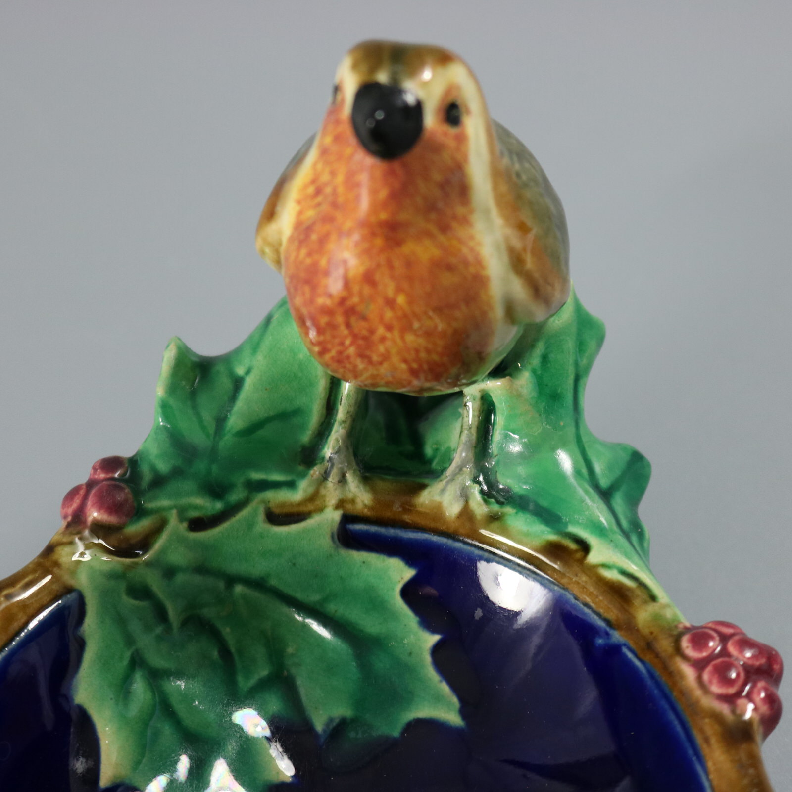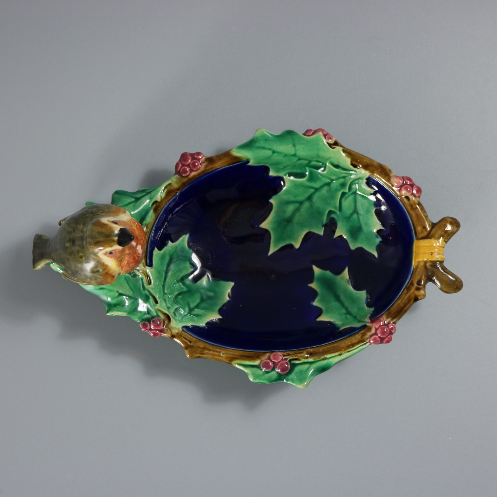 Victorian, circa 1876. 3.7ins high, 8.3ins wide, 4.9ins depth. Minton Majolica tray which features a robin sat on a twig with holly leaves and berry decoration.