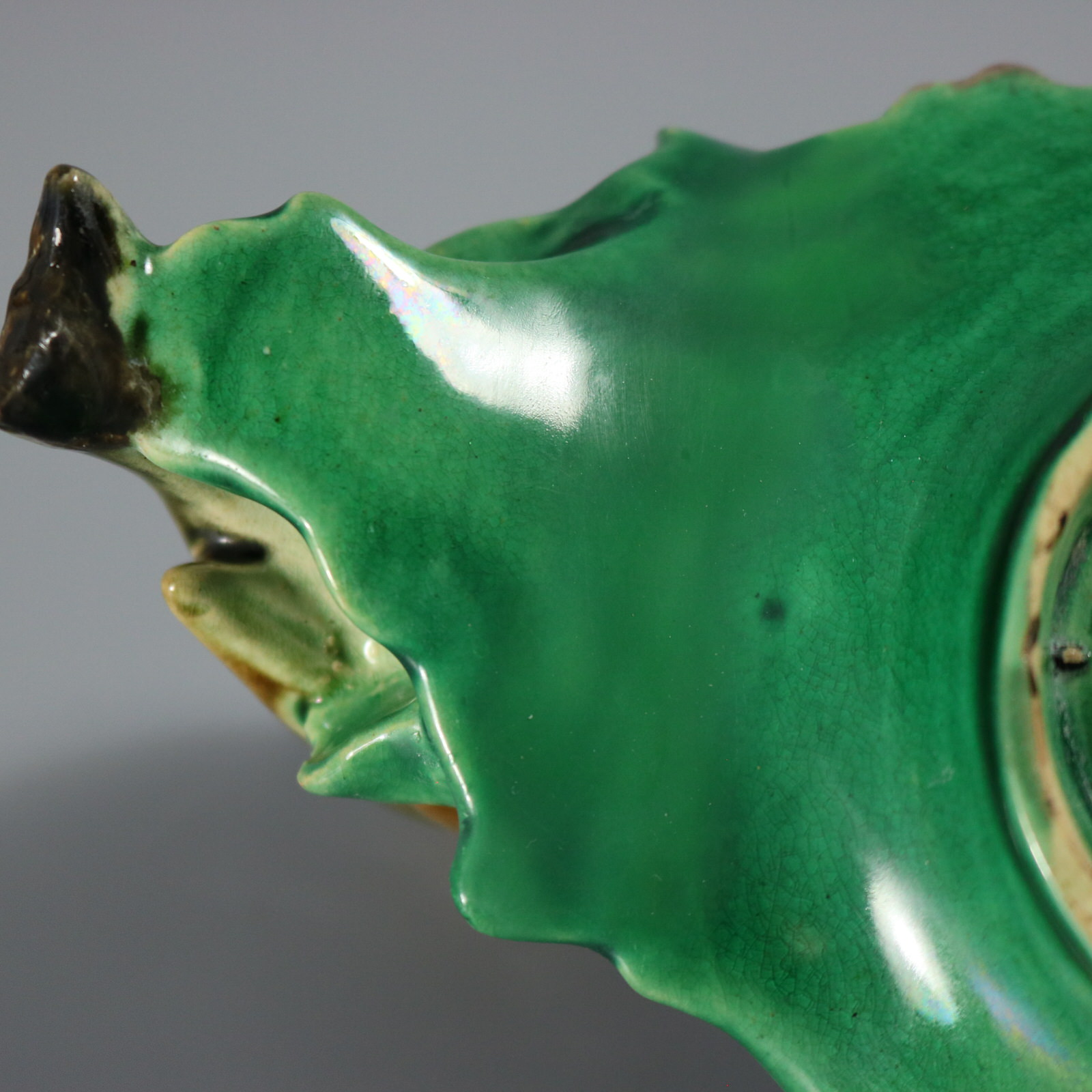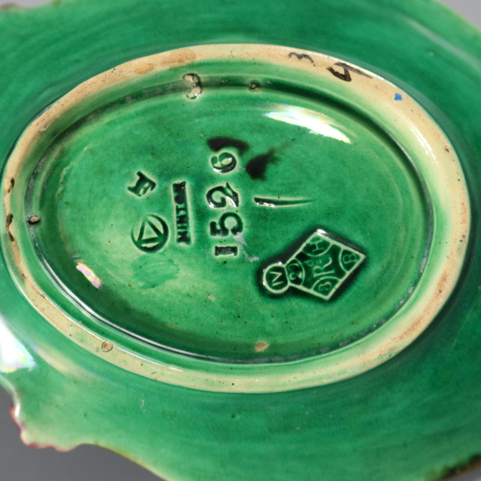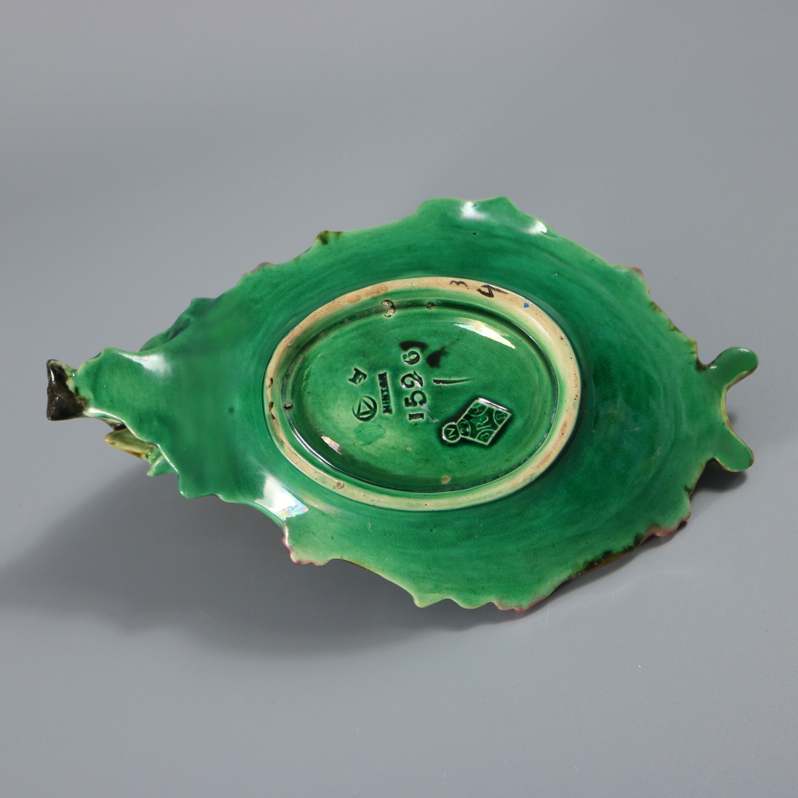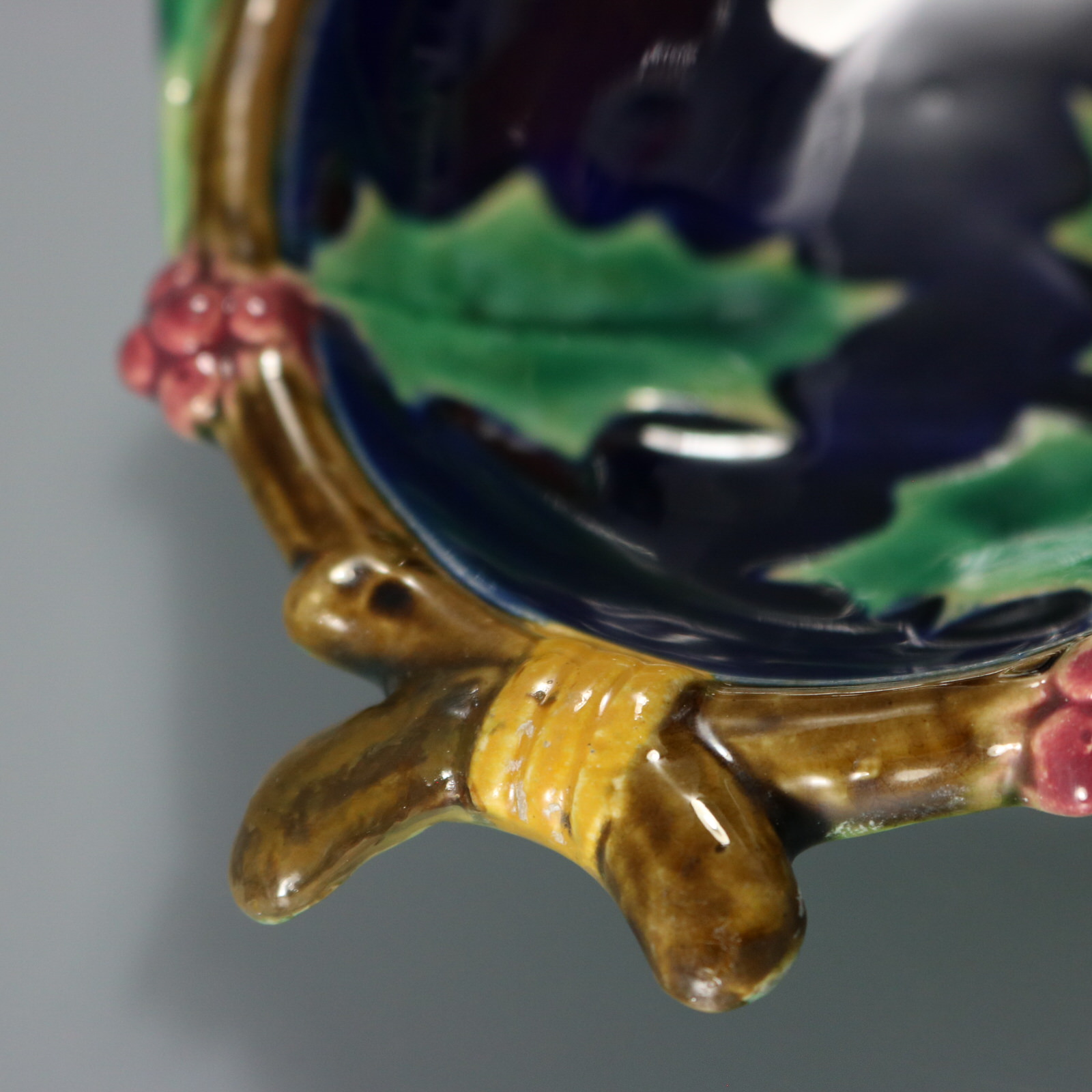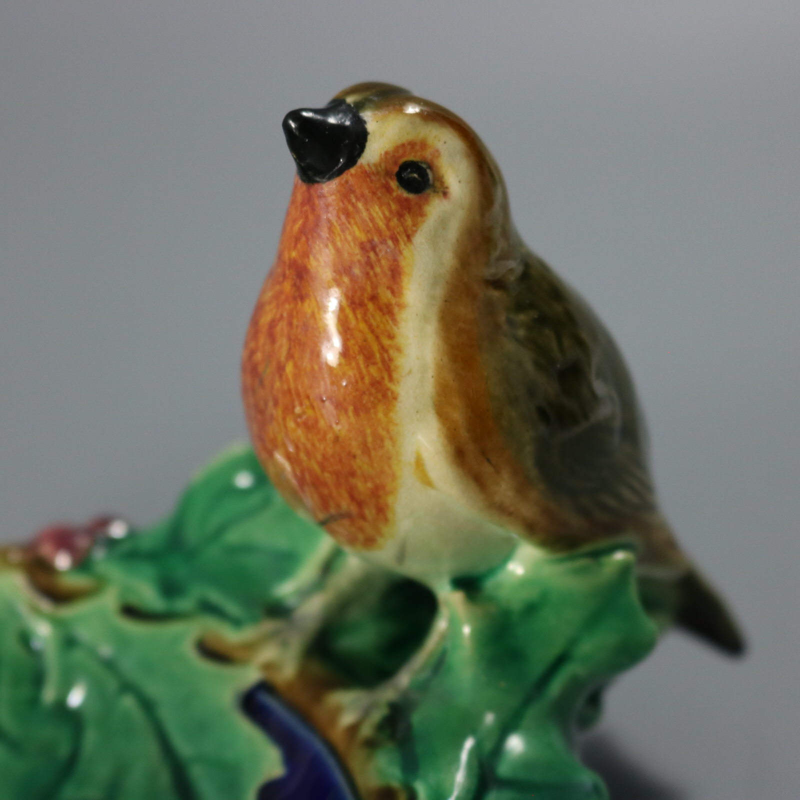 Victorian, circa 1876. 3.7ins high, 8.3ins wide, 4.9ins depth. Minton Majolica tray which features a robin sat on a twig with holly leaves and berry decoration.