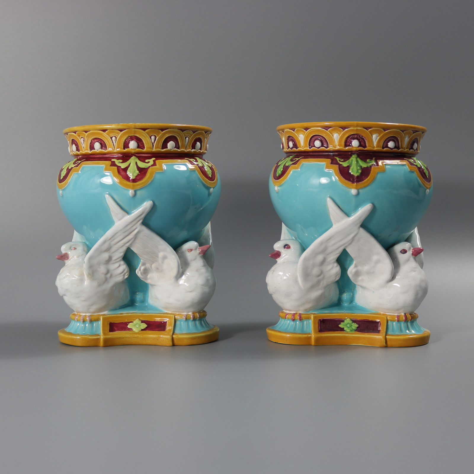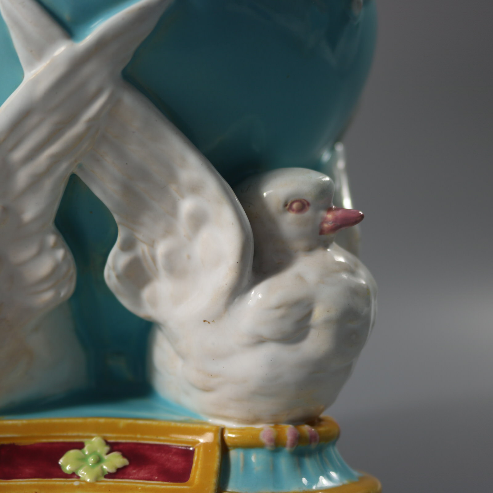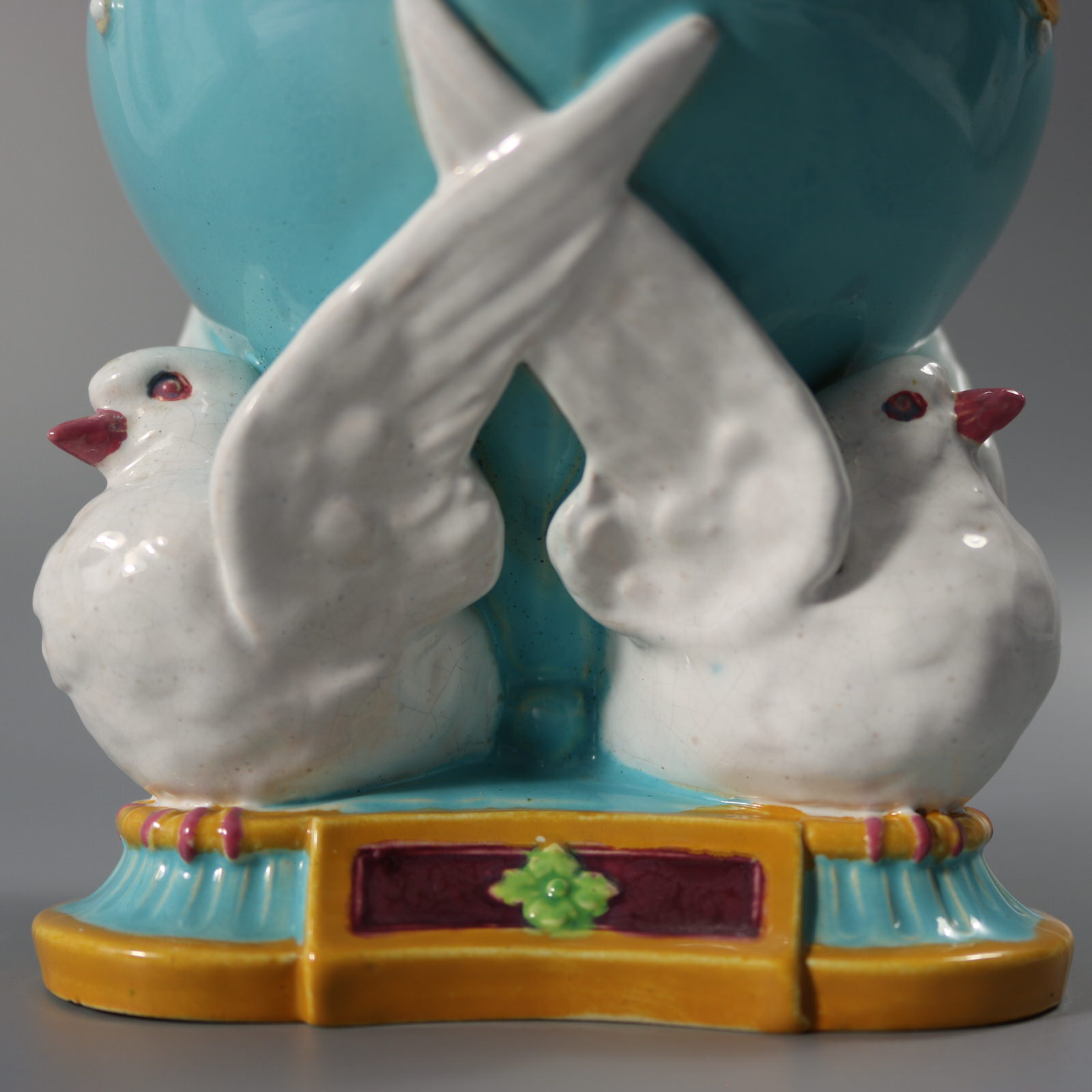 Victorian, circa 1873. 6.1ins high, 4.7ins wide, 4.7ins depth. Minton Majolica vase which features three fantail pigeons with wings raised, supporting a bulbous vase.