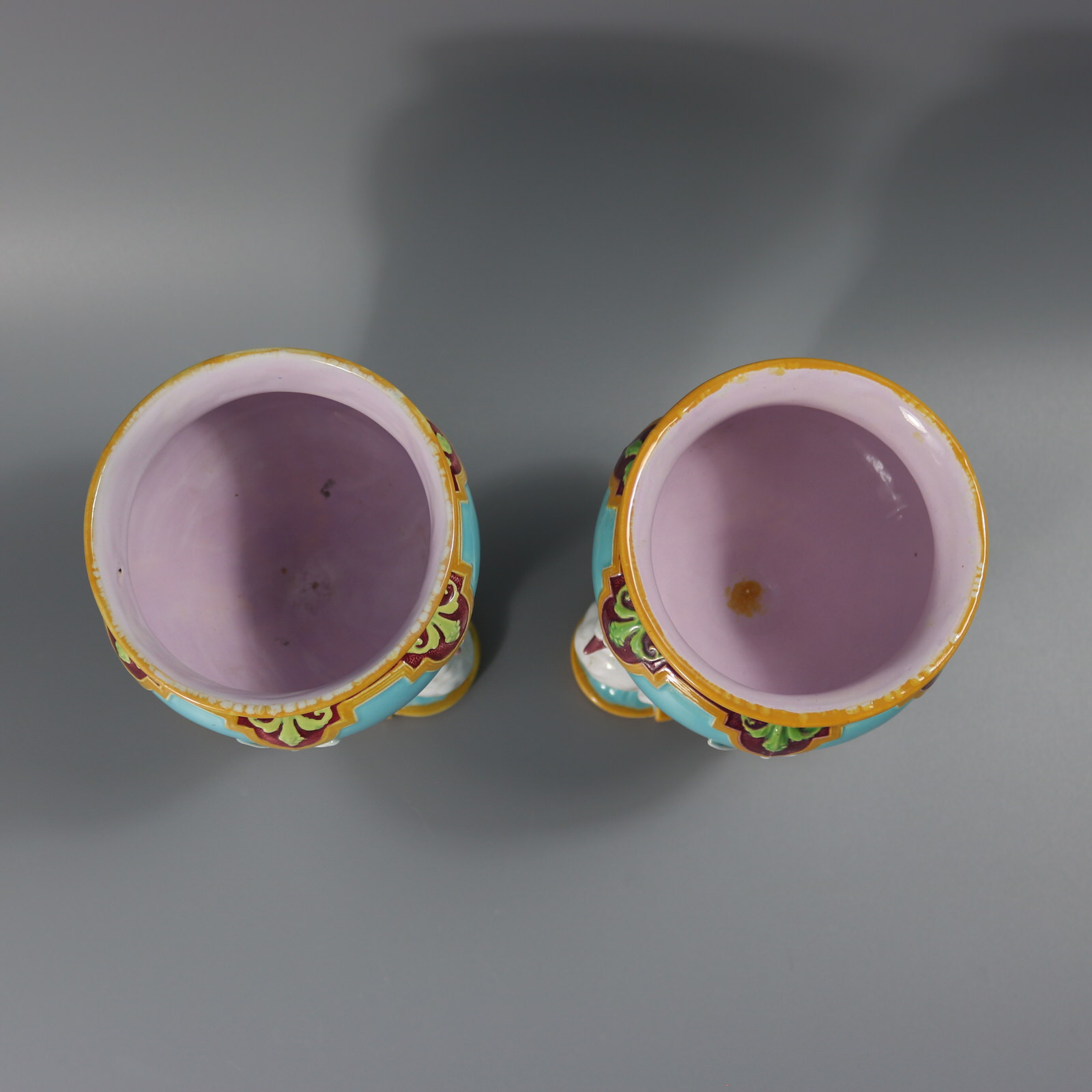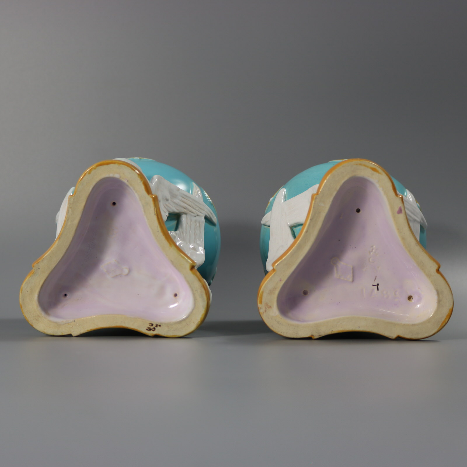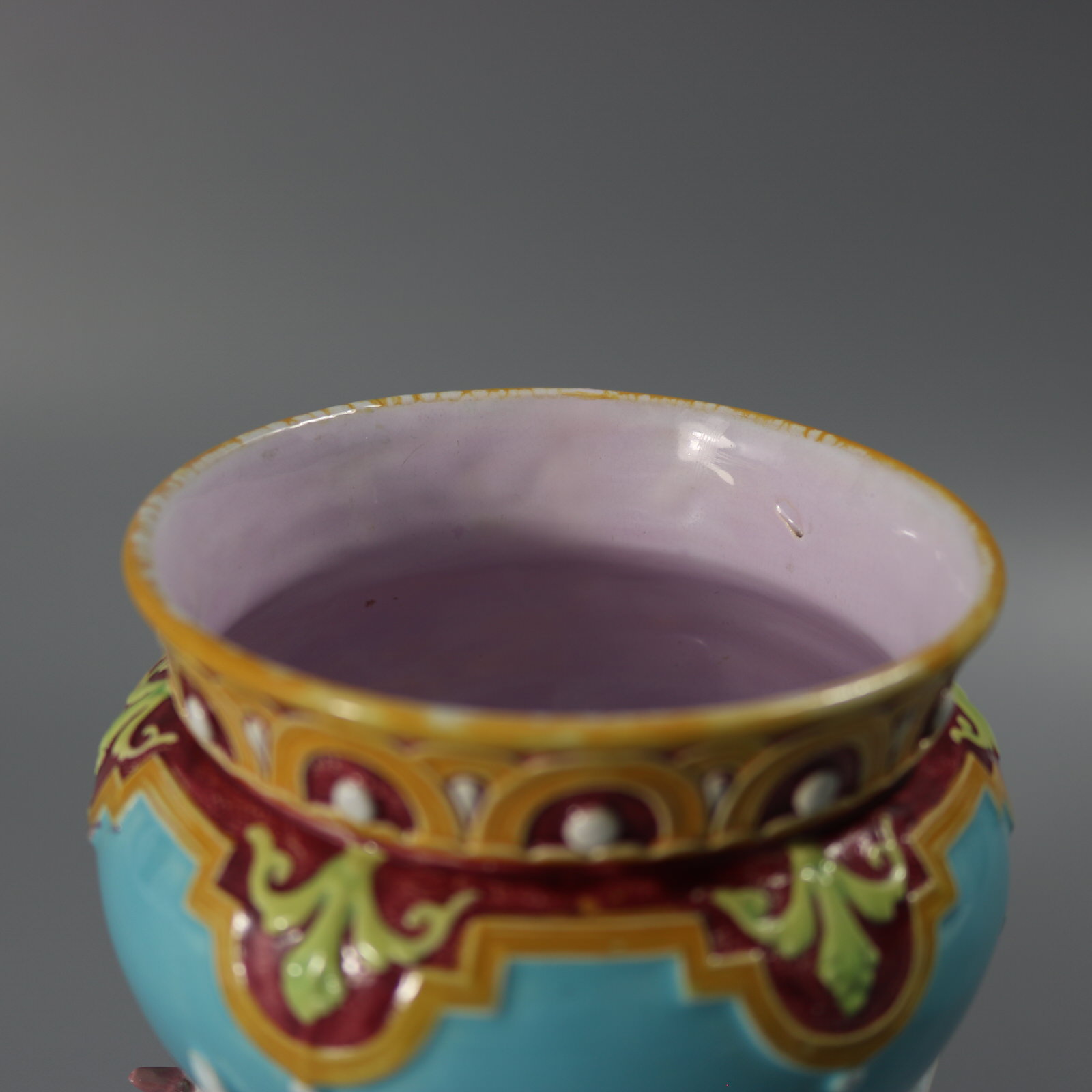 Victorian, circa 1873. 6.1ins high, 4.7ins wide, 4.7ins depth. Minton Majolica vase which features three fantail pigeons with wings raised, supporting a bulbous vase.