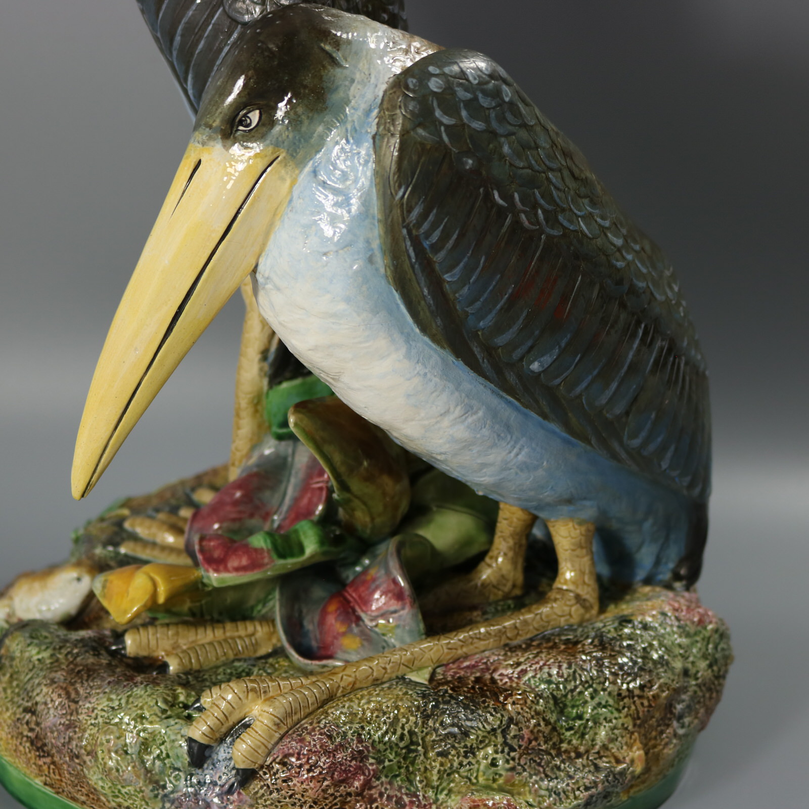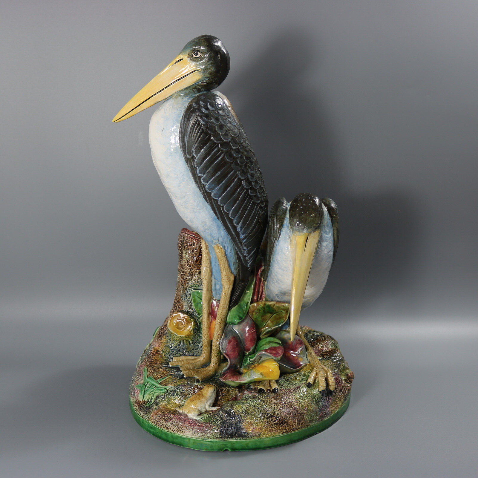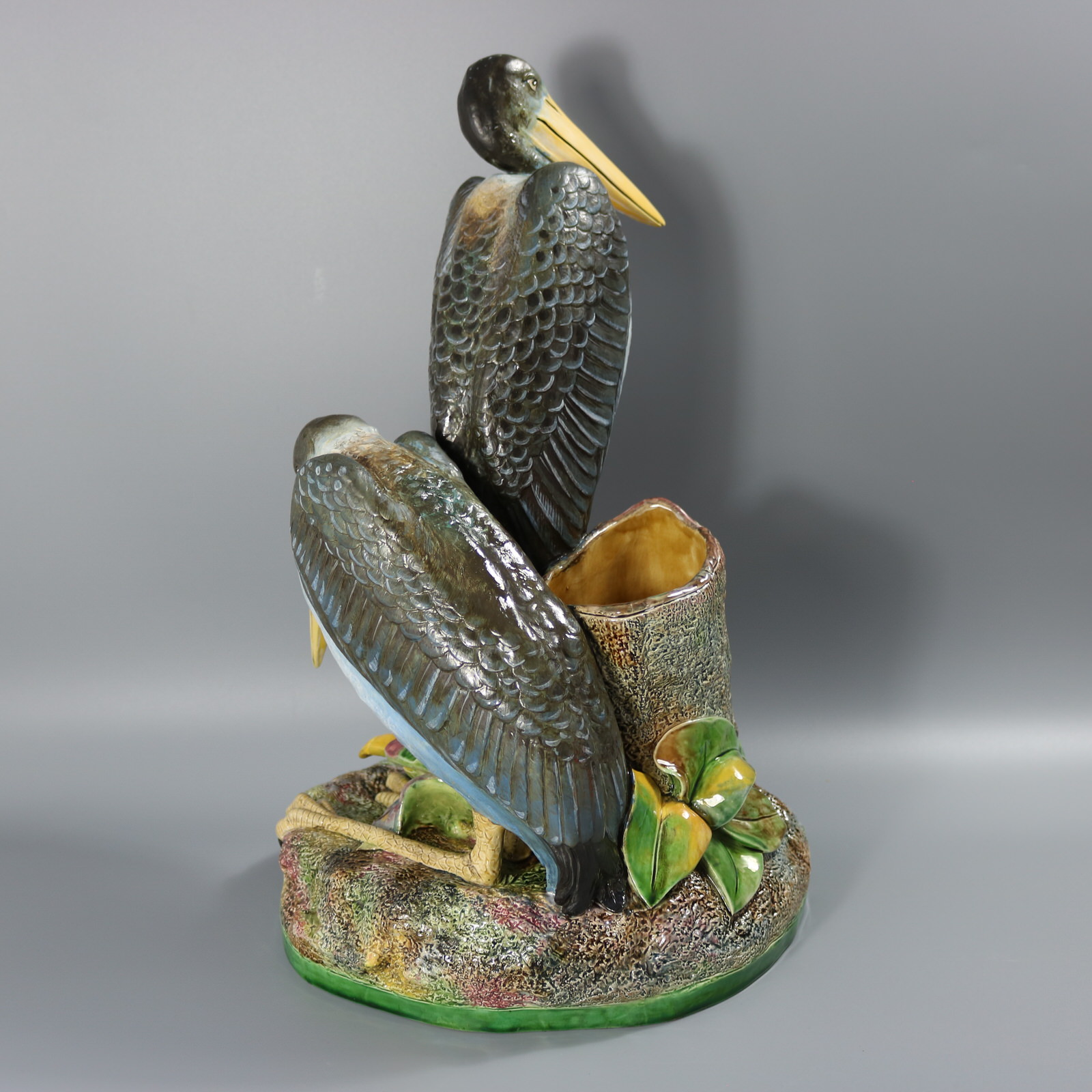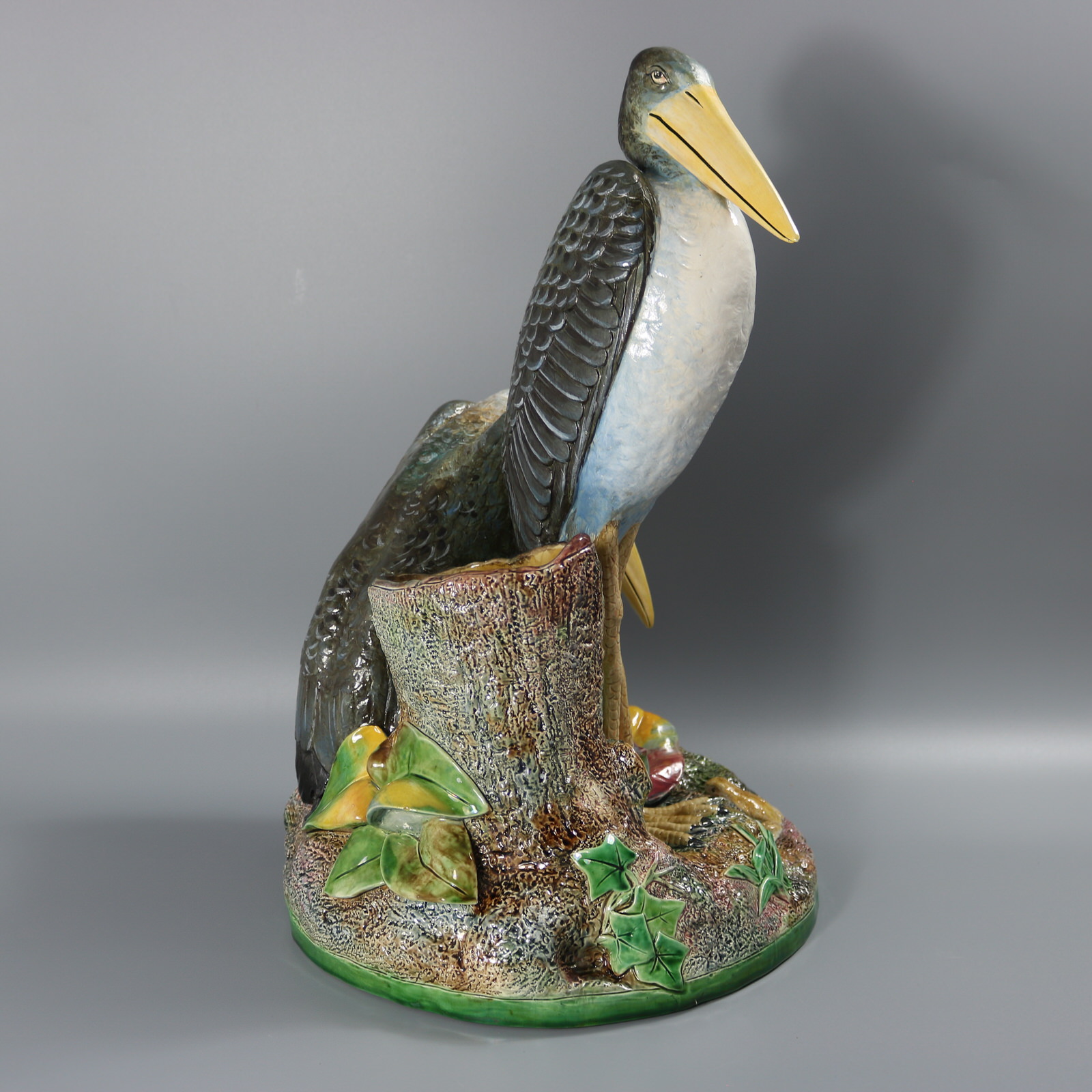 Victorian, circa 1875. 17.9ins high, 11.8ins wide, 11.2ins depth. Brown Westhead Moore and Co Majolica figural vase which features two storks, one standing and the other crouched beside.
