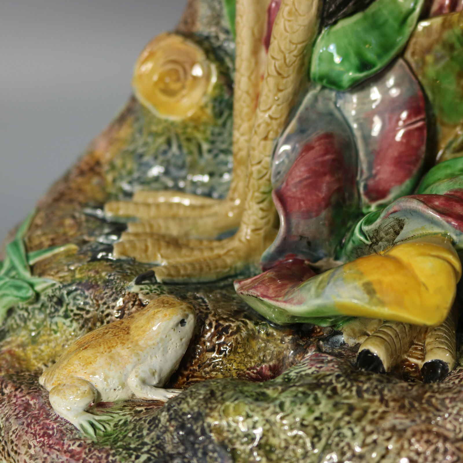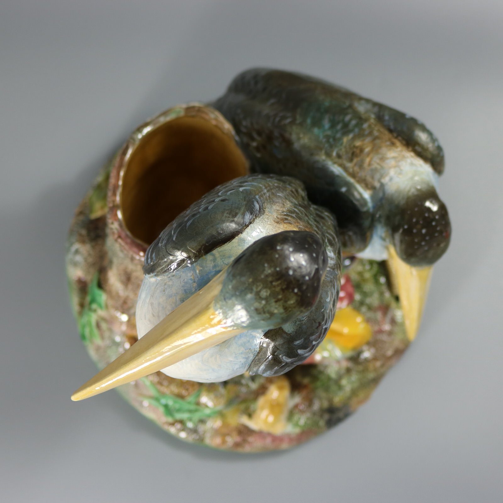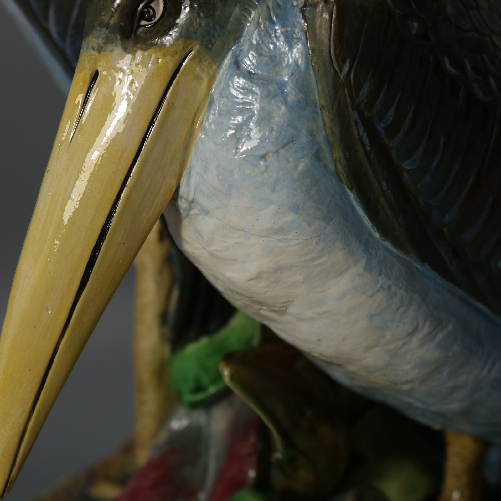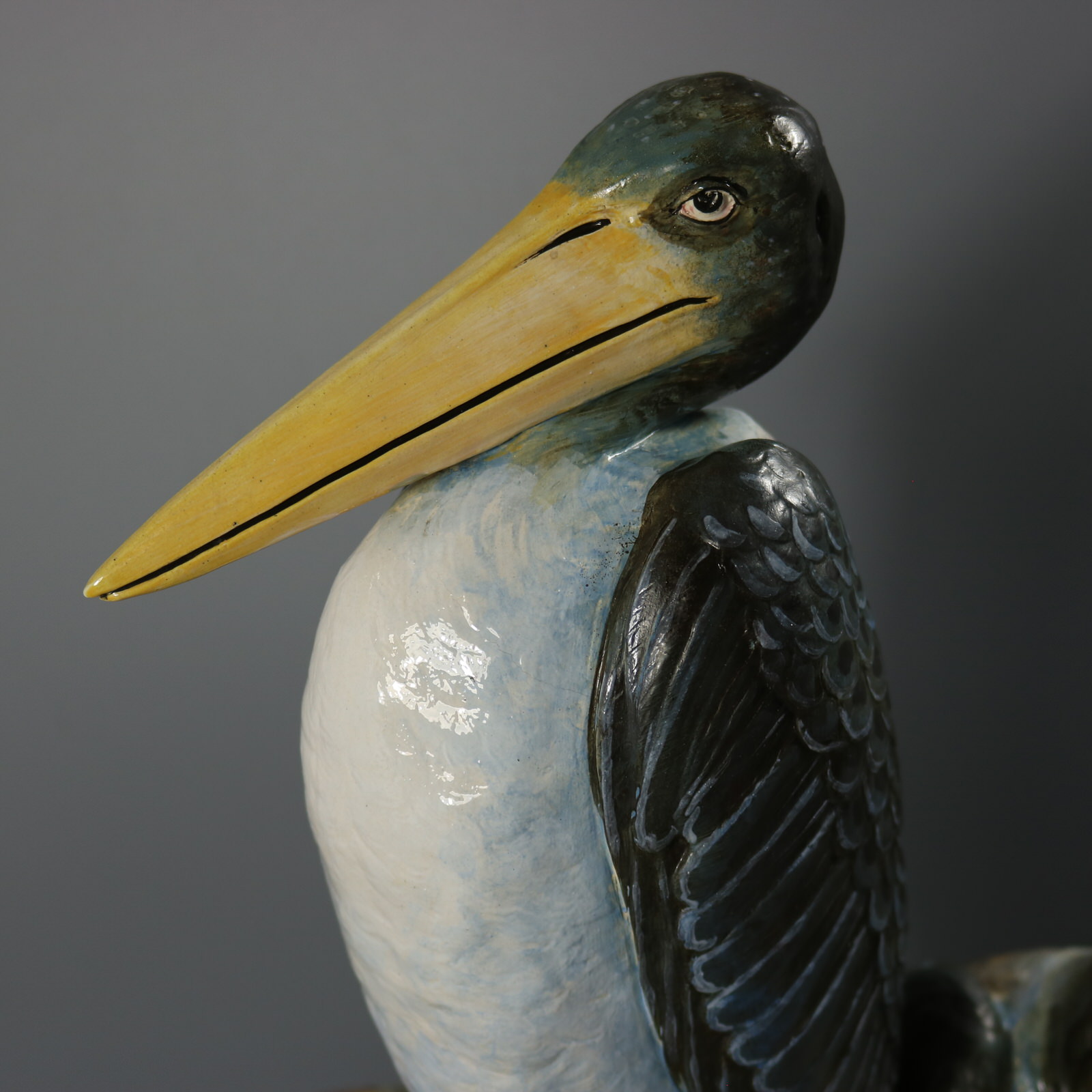 Victorian, circa 1875. 17.9ins high, 11.8ins wide, 11.2ins depth. Brown Westhead Moore and Co Majolica figural vase which features two storks, one standing and the other crouched beside.