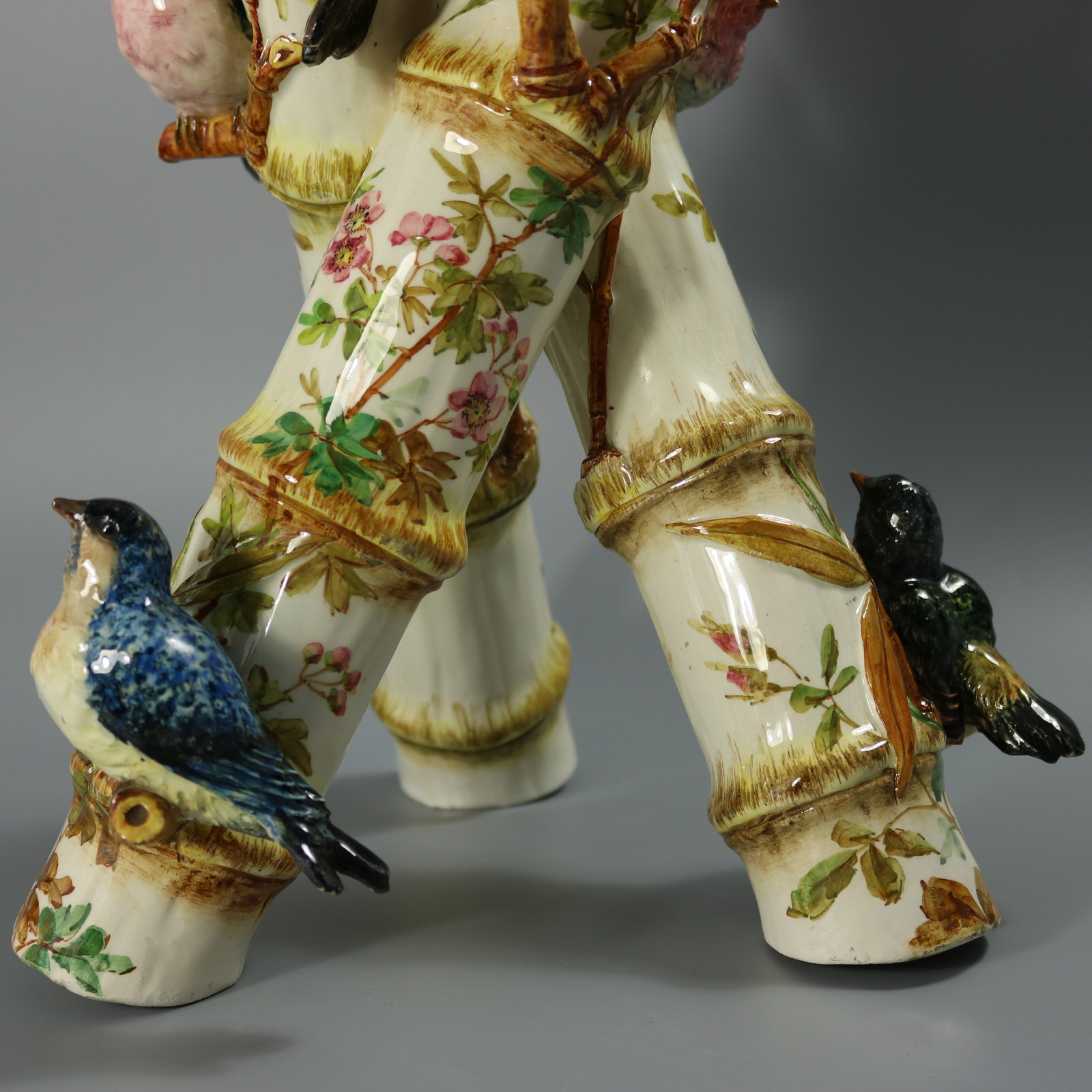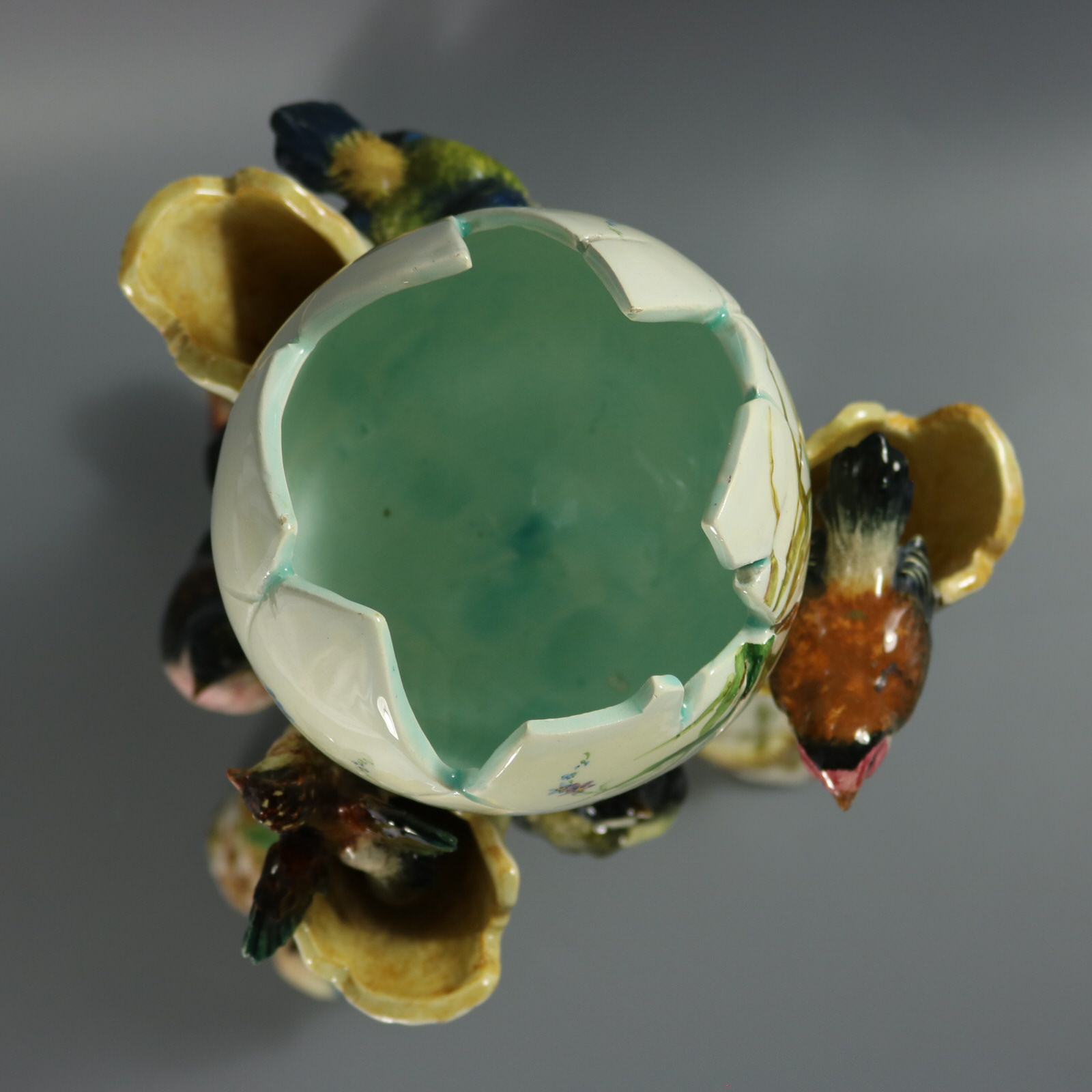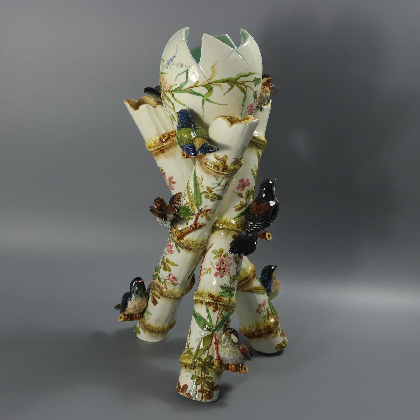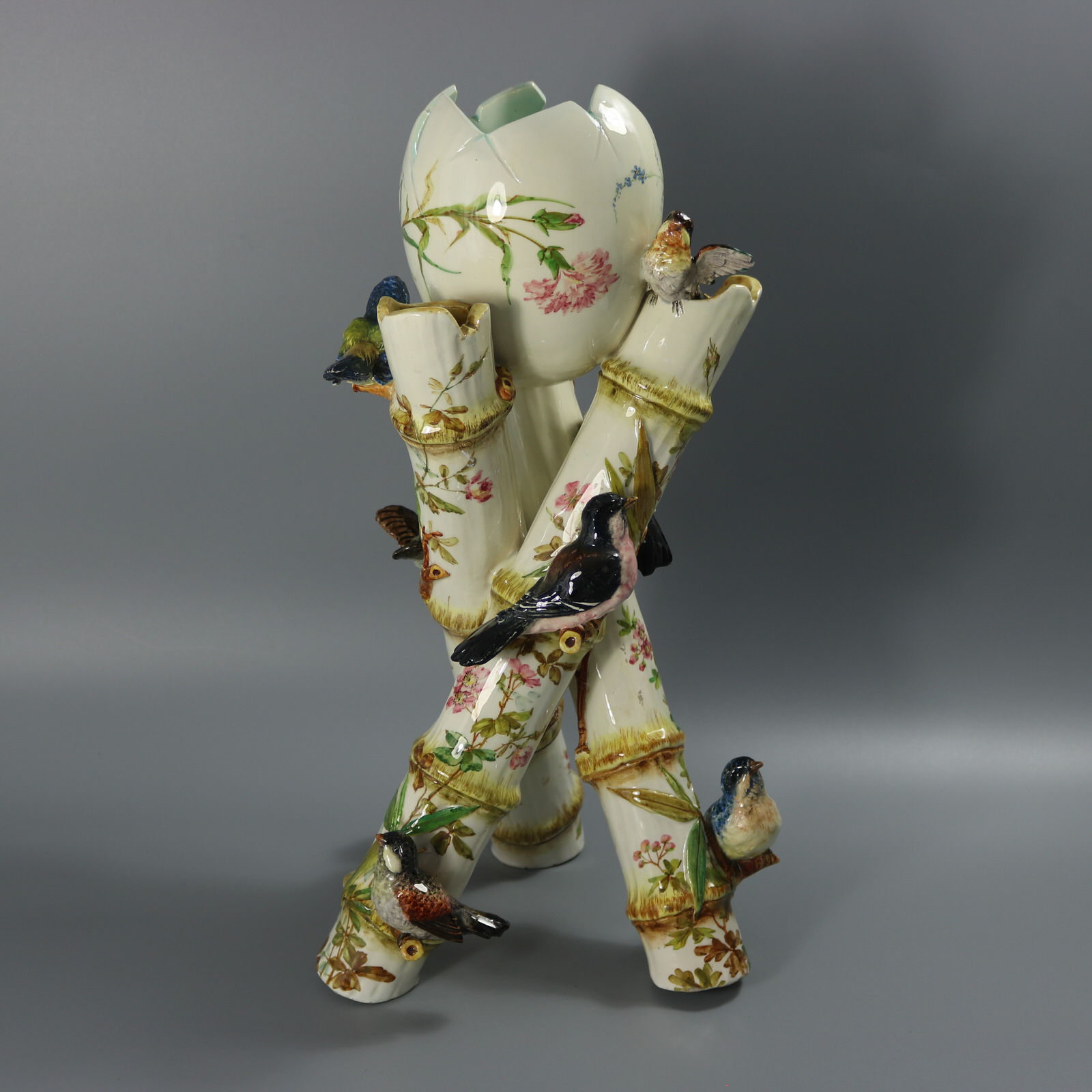 Victorian, circa 1890. 17.5ins high, 9.8ins wide, 9.8ins depth. Delphin Massier French Majolica vase which features three bamboo stem vases forming a support for an egg on the top.