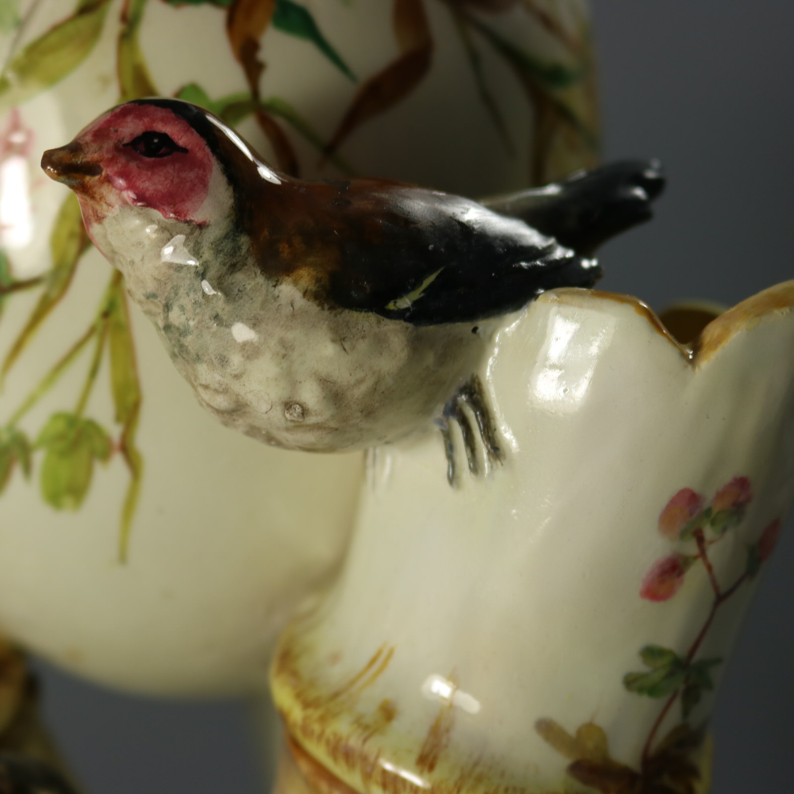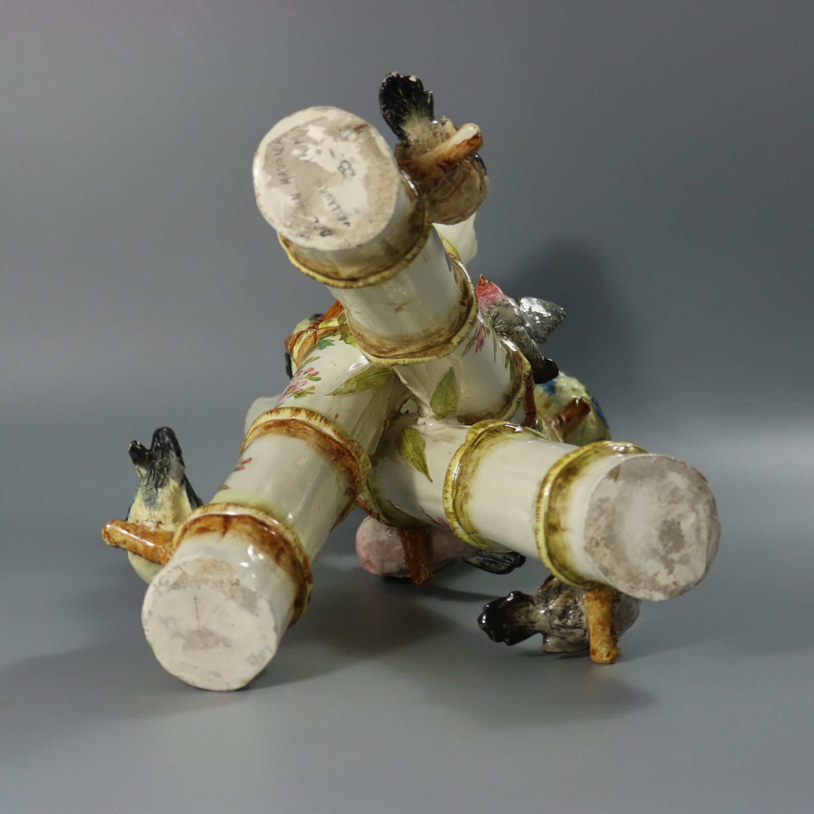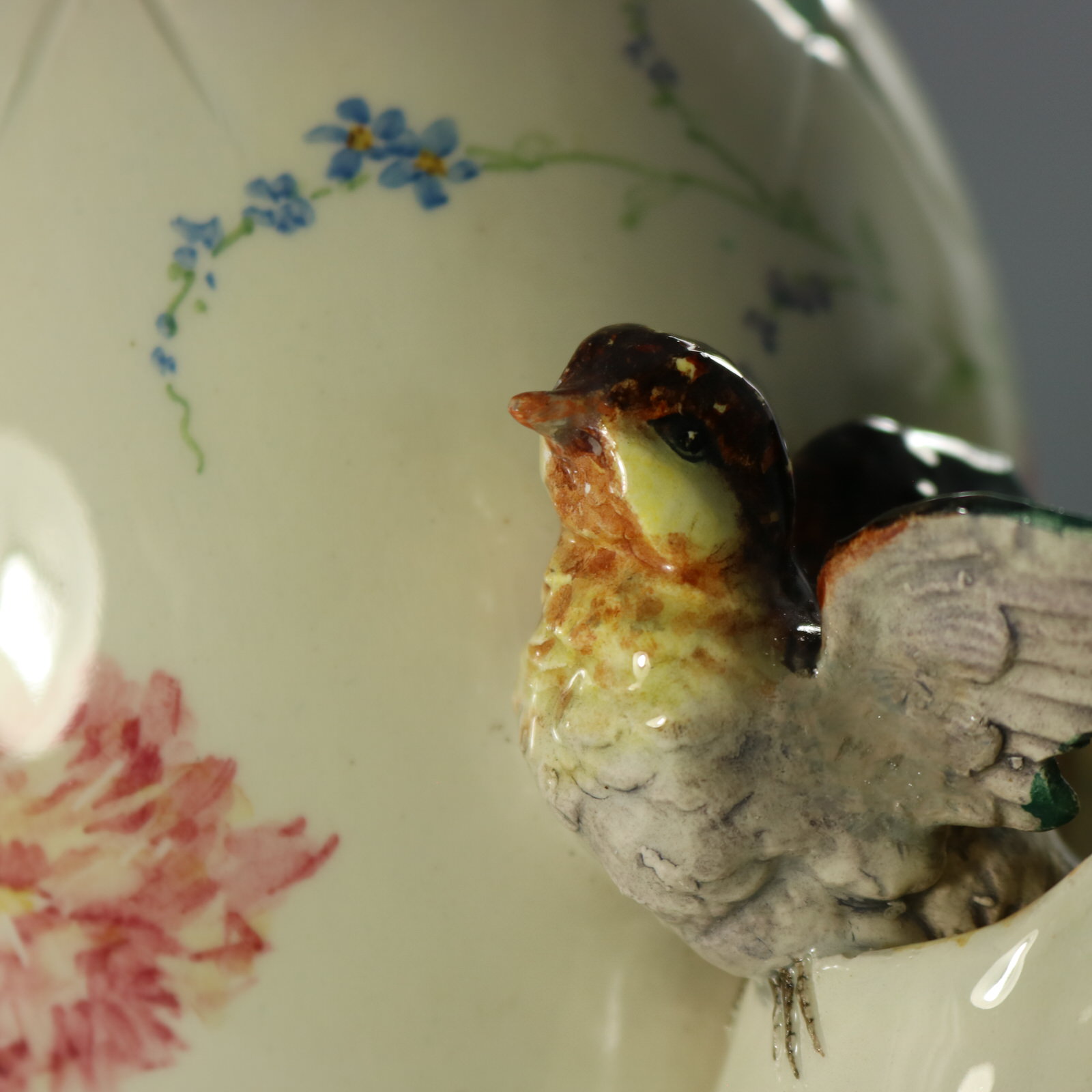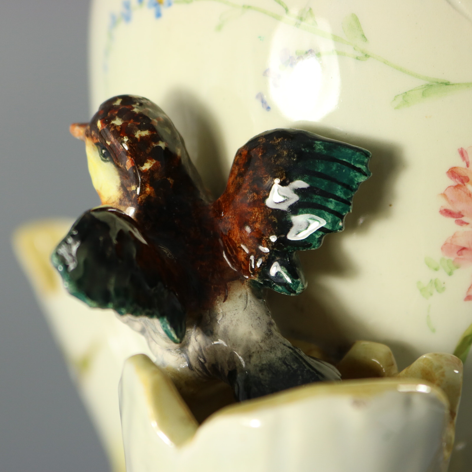 Victorian, circa 1890. 17.5ins high, 9.8ins wide, 9.8ins depth. Delphin Massier French Majolica vase which features three bamboo stem vases forming a support for an egg on the top.