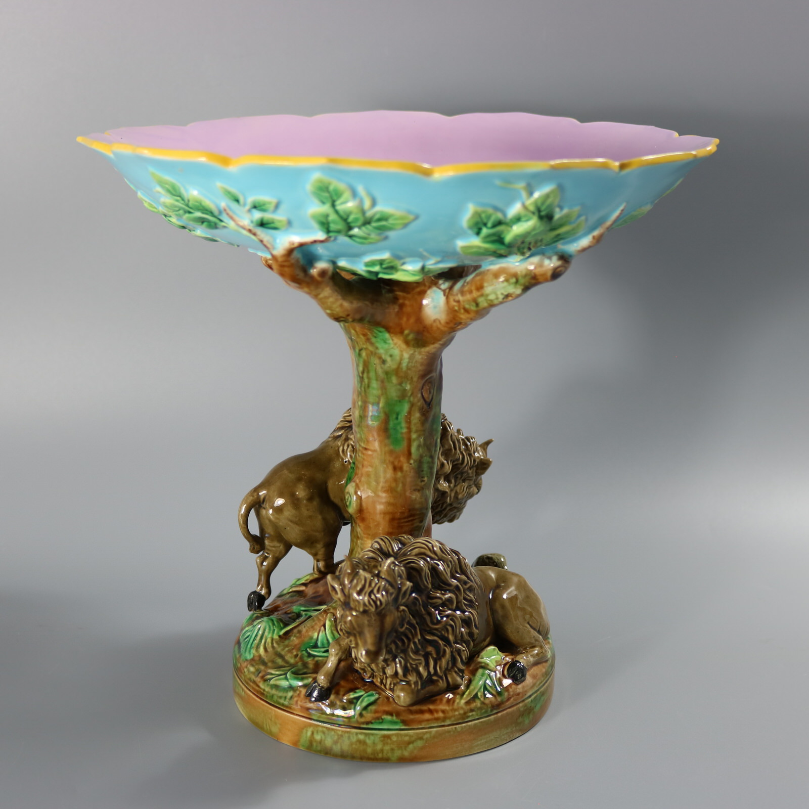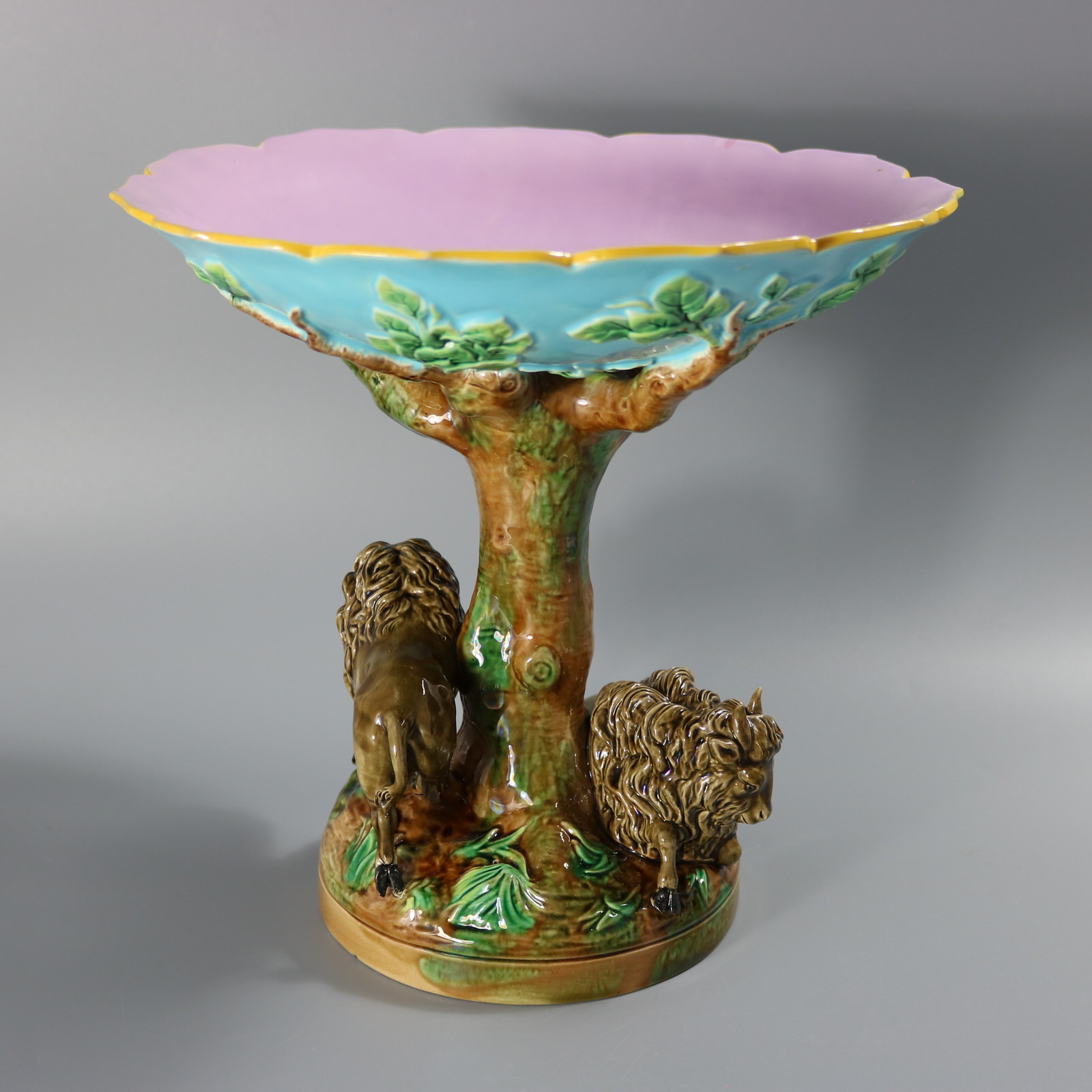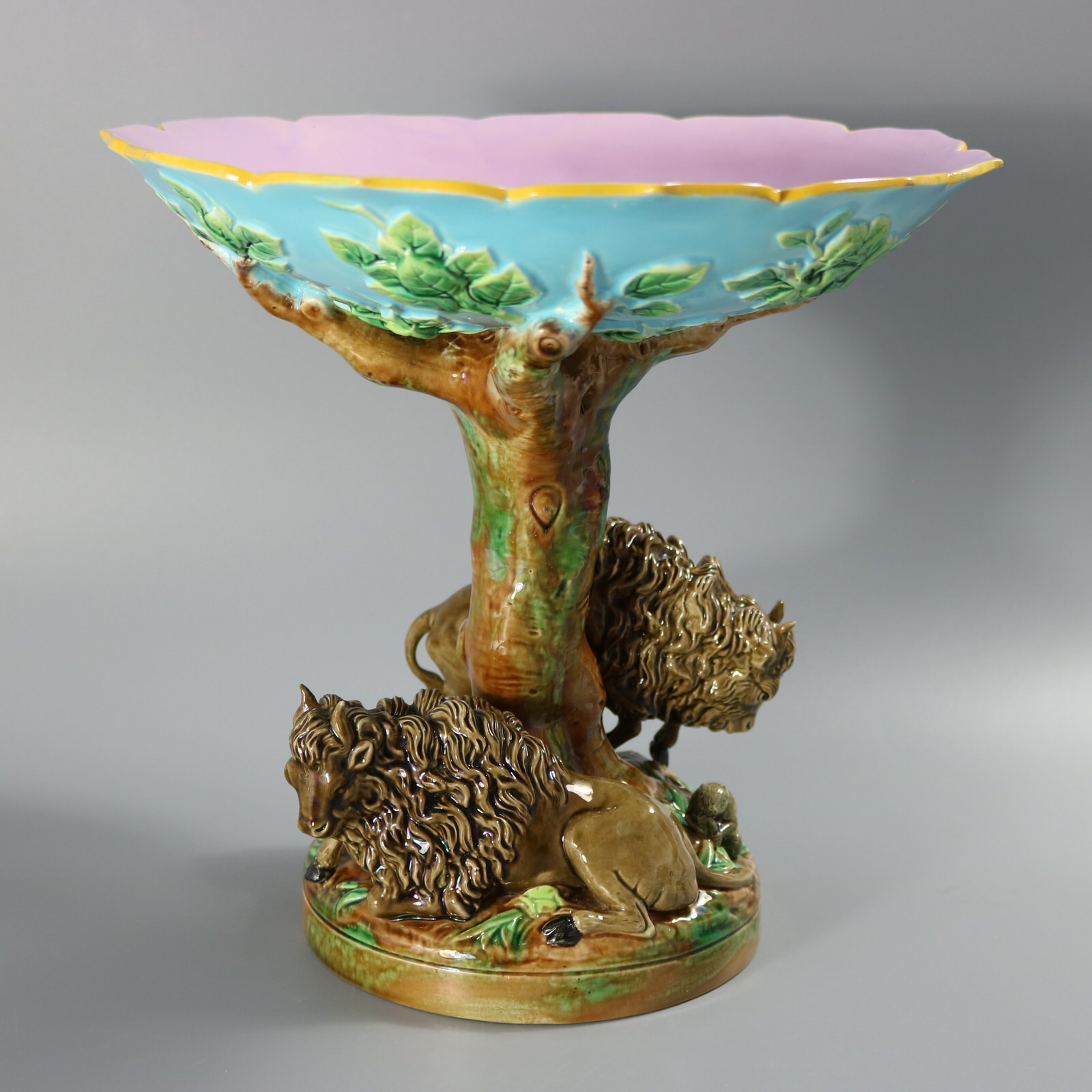 Victorian, circa 1872. 10.2ins high, 10.4ins wide, 10.4ins depth. George Jones Majolica compote which features two buffalo (American bison), one stood on one side and one recumbent on the other.