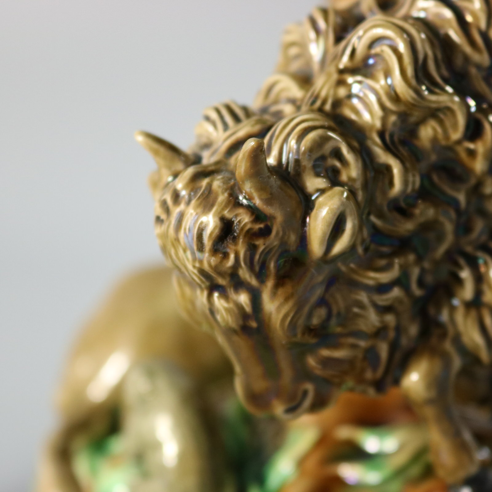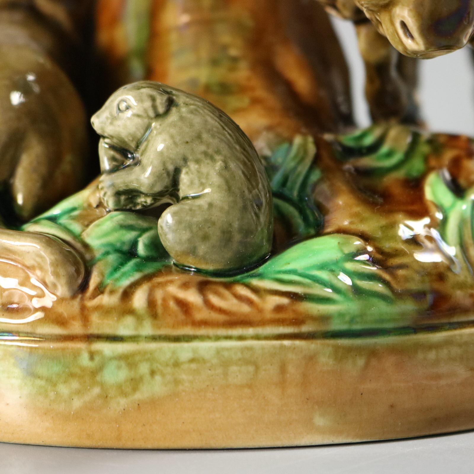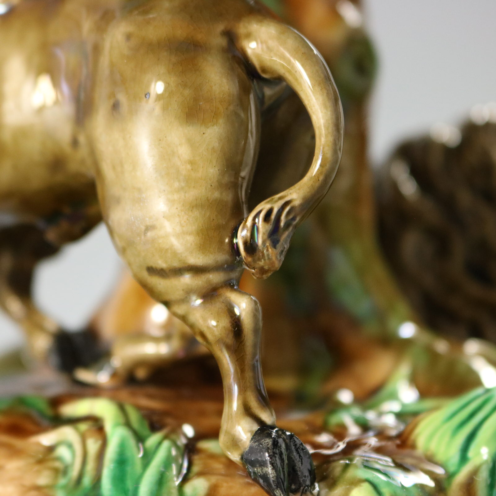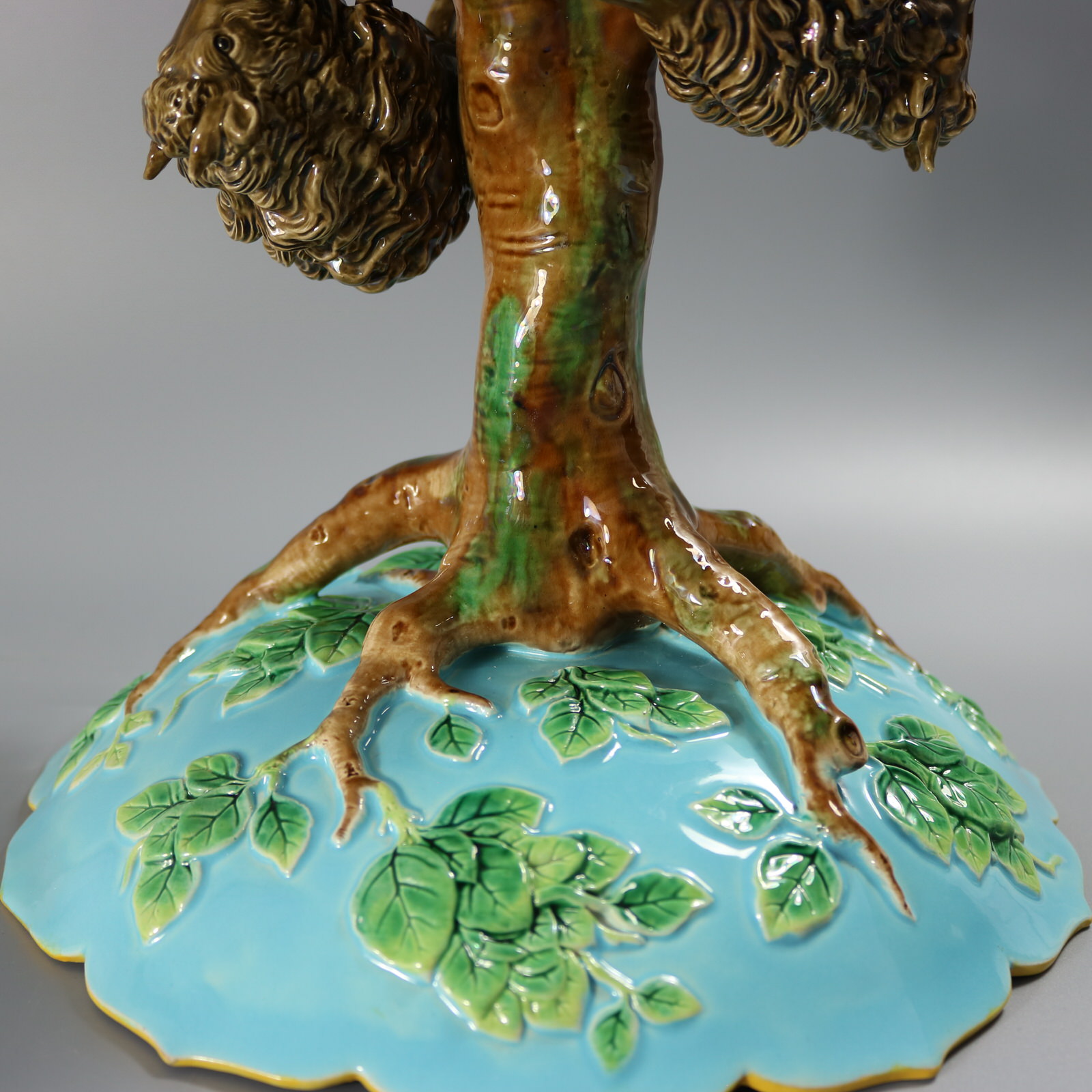 Victorian, circa 1872. 10.2ins high, 10.4ins wide, 10.4ins depth. George Jones Majolica compote which features two buffalo (American bison), one stood on one side and one recumbent on the other.