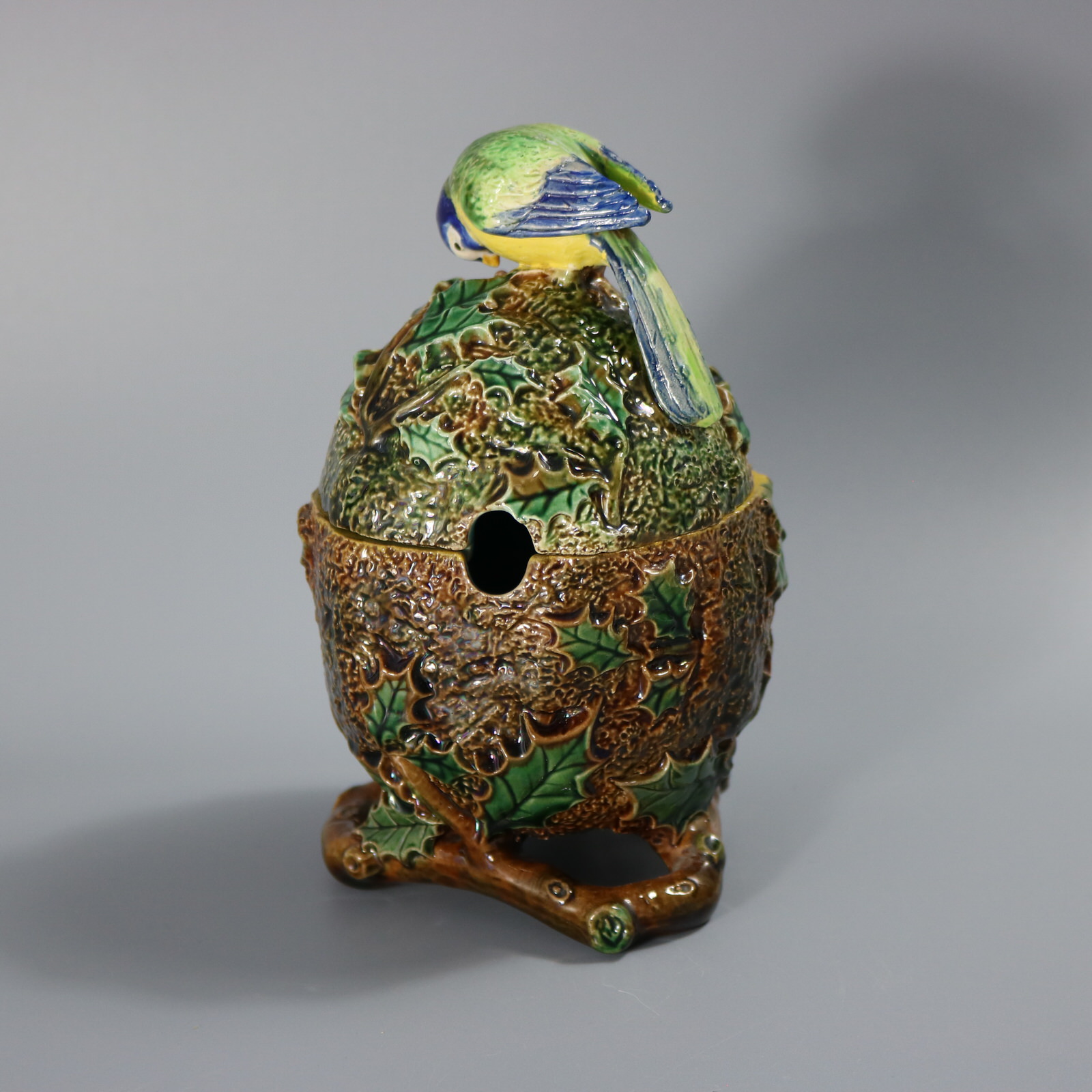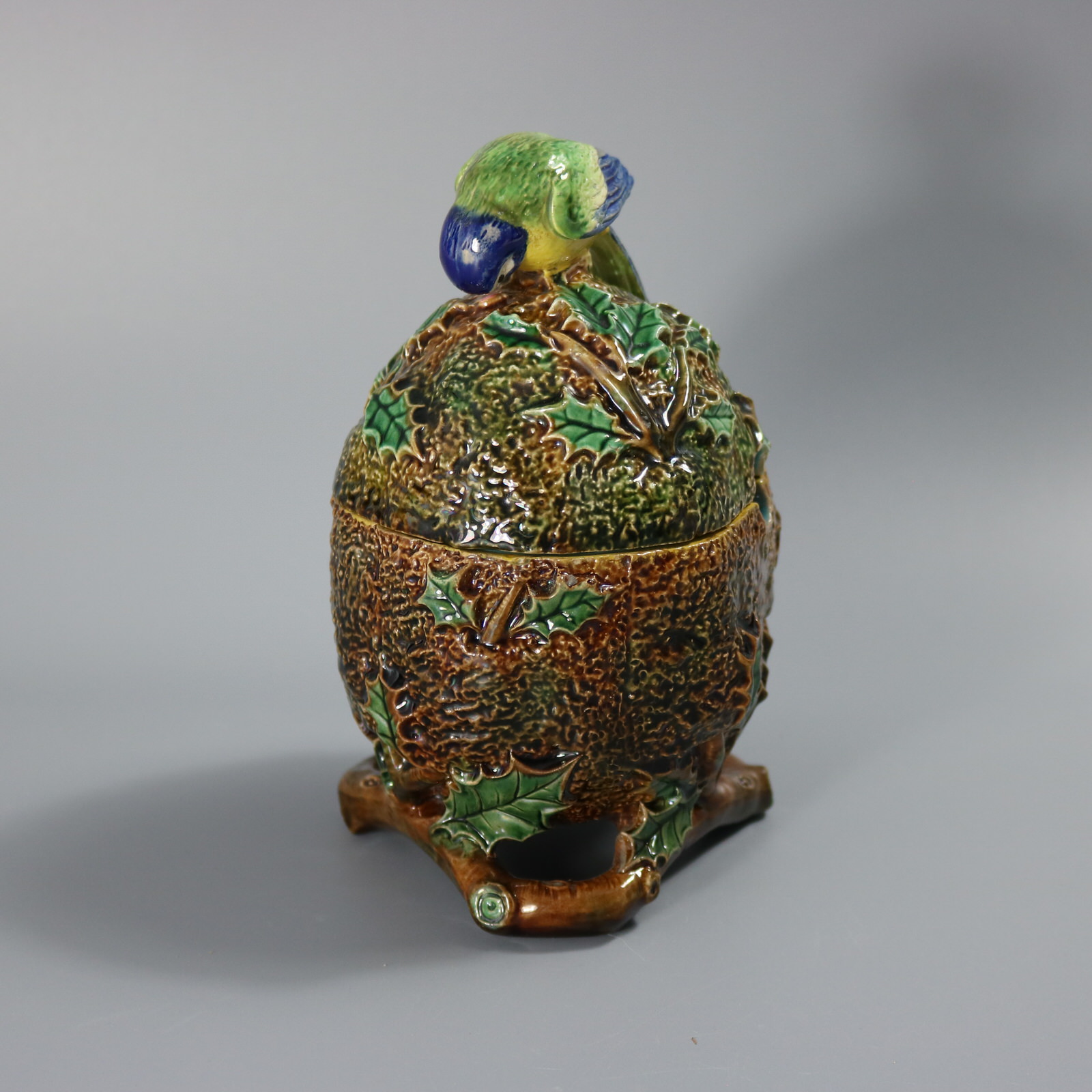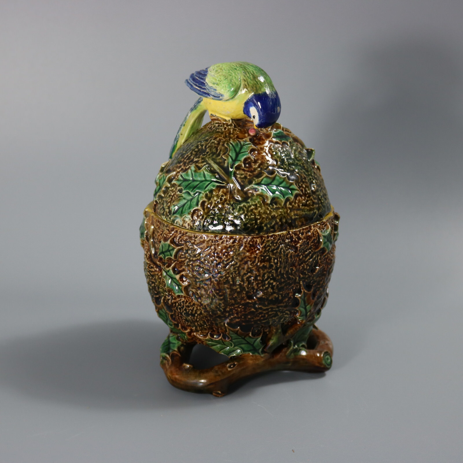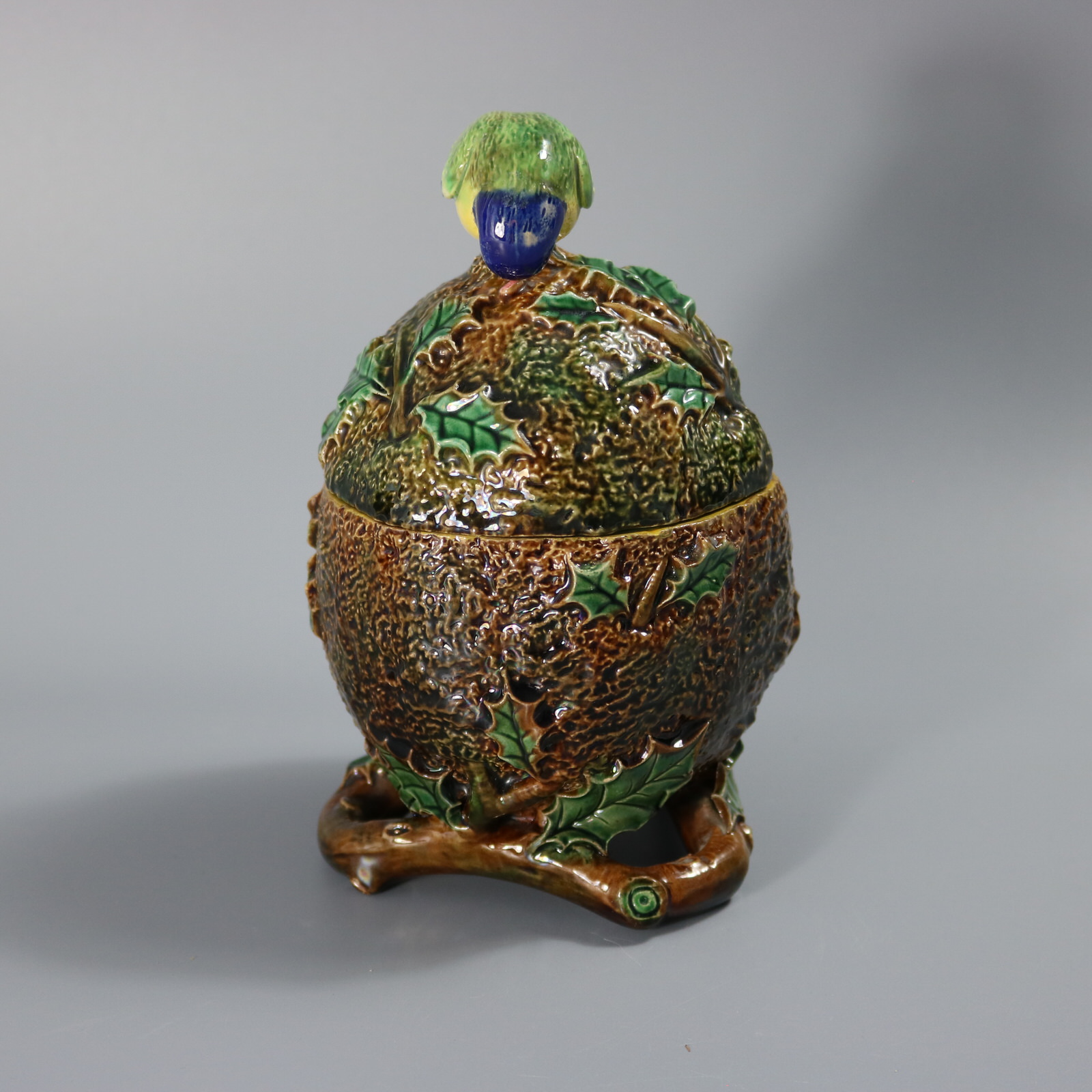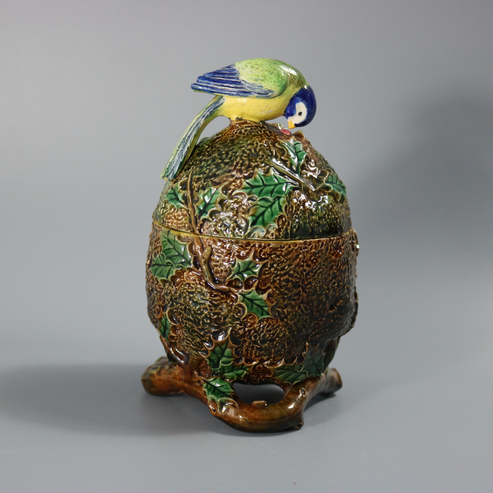 Victorian, circa 1875. 6.5ins high, 4.1ins wide, 4.1ins depth. George Jones Majolica preserve pot and cover which features a holly covered bird's nest, with blue tit finial.