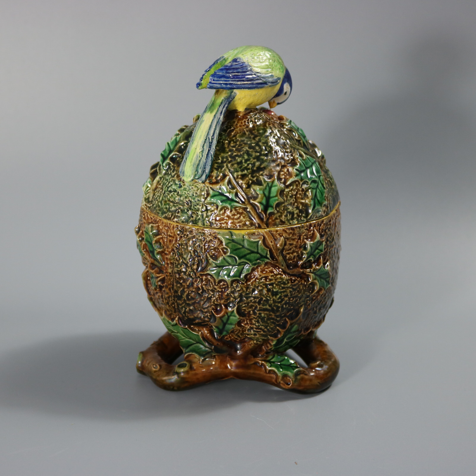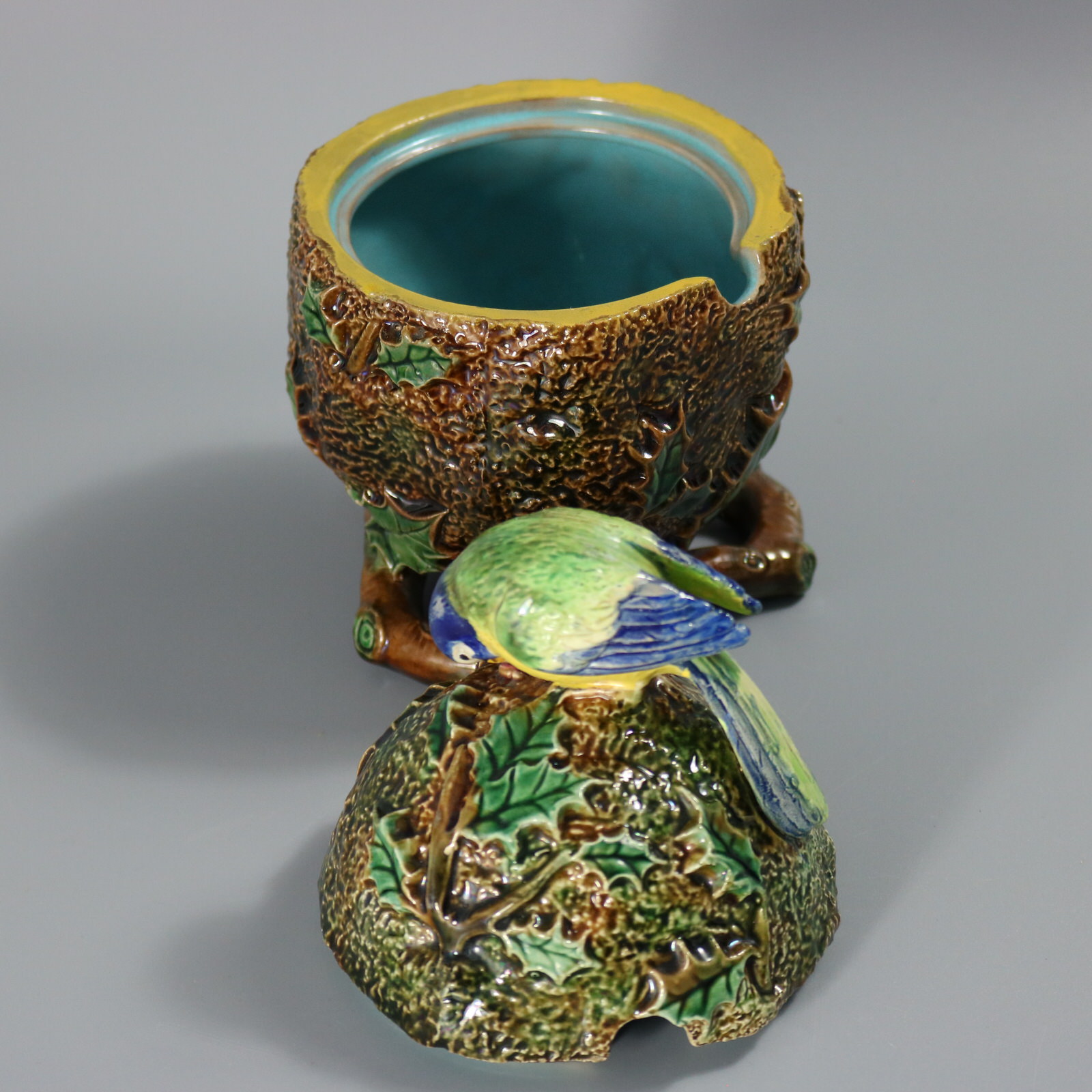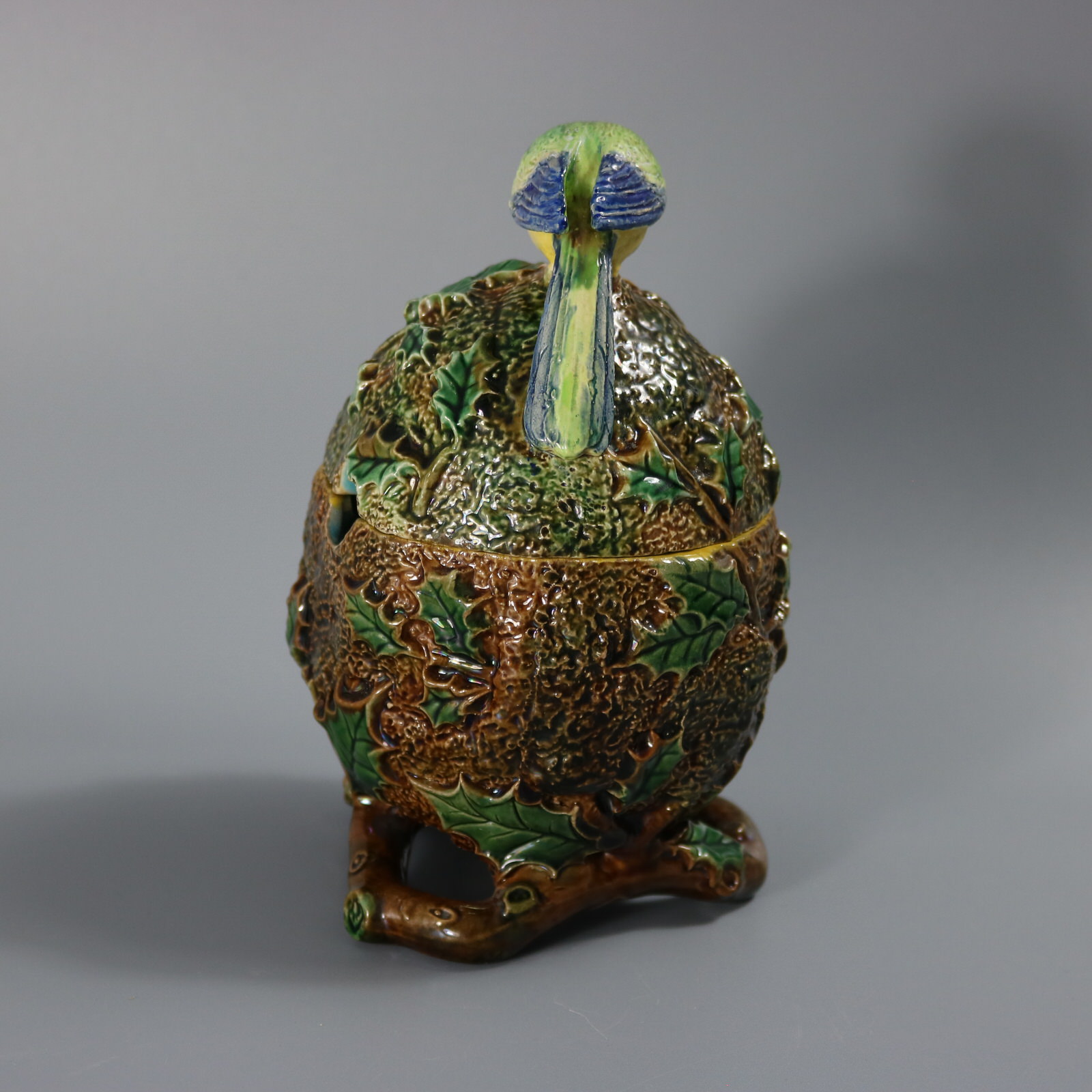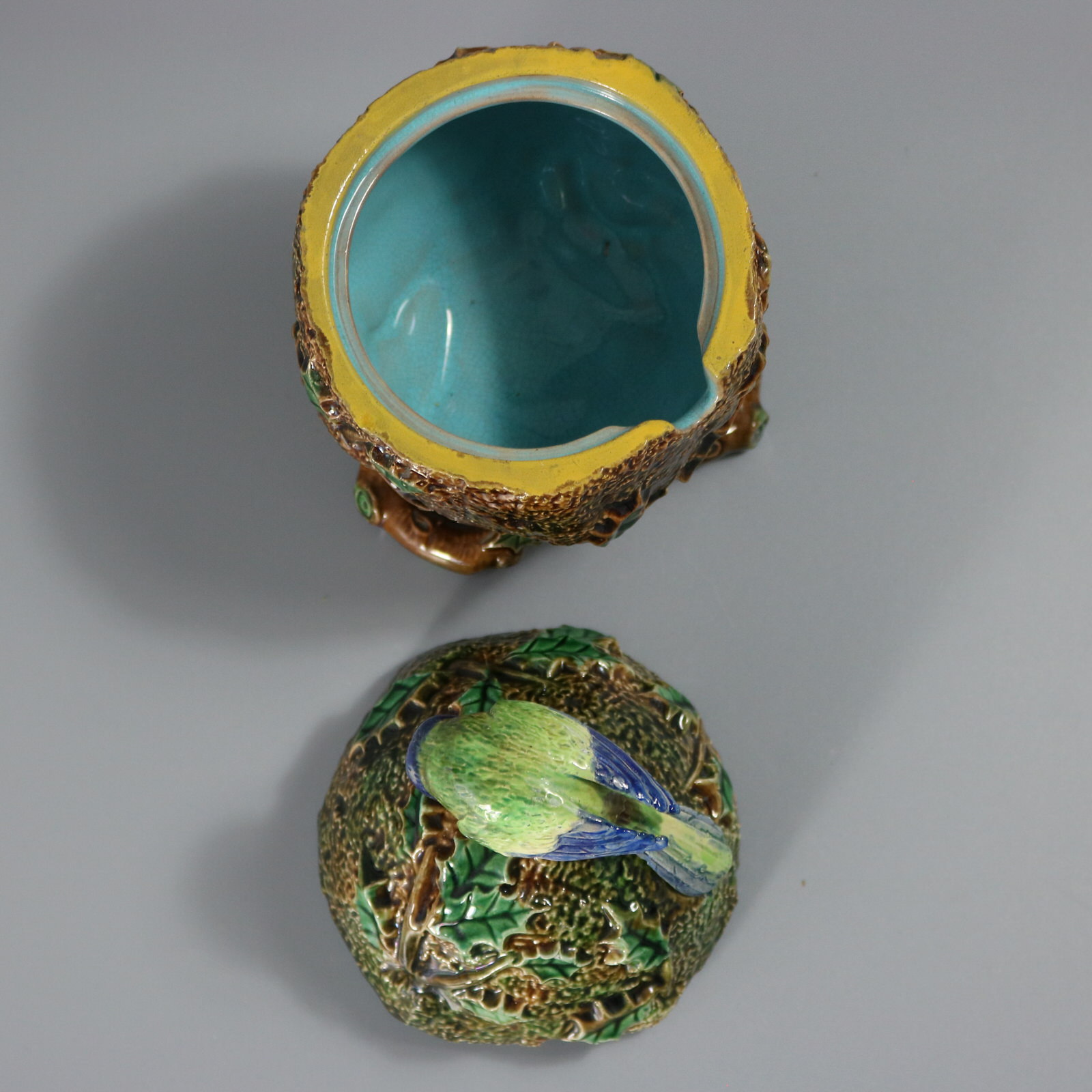 Victorian, circa 1875. 6.5ins high, 4.1ins wide, 4.1ins depth. George Jones Majolica preserve pot and cover which features a holly covered bird's nest, with blue tit finial.