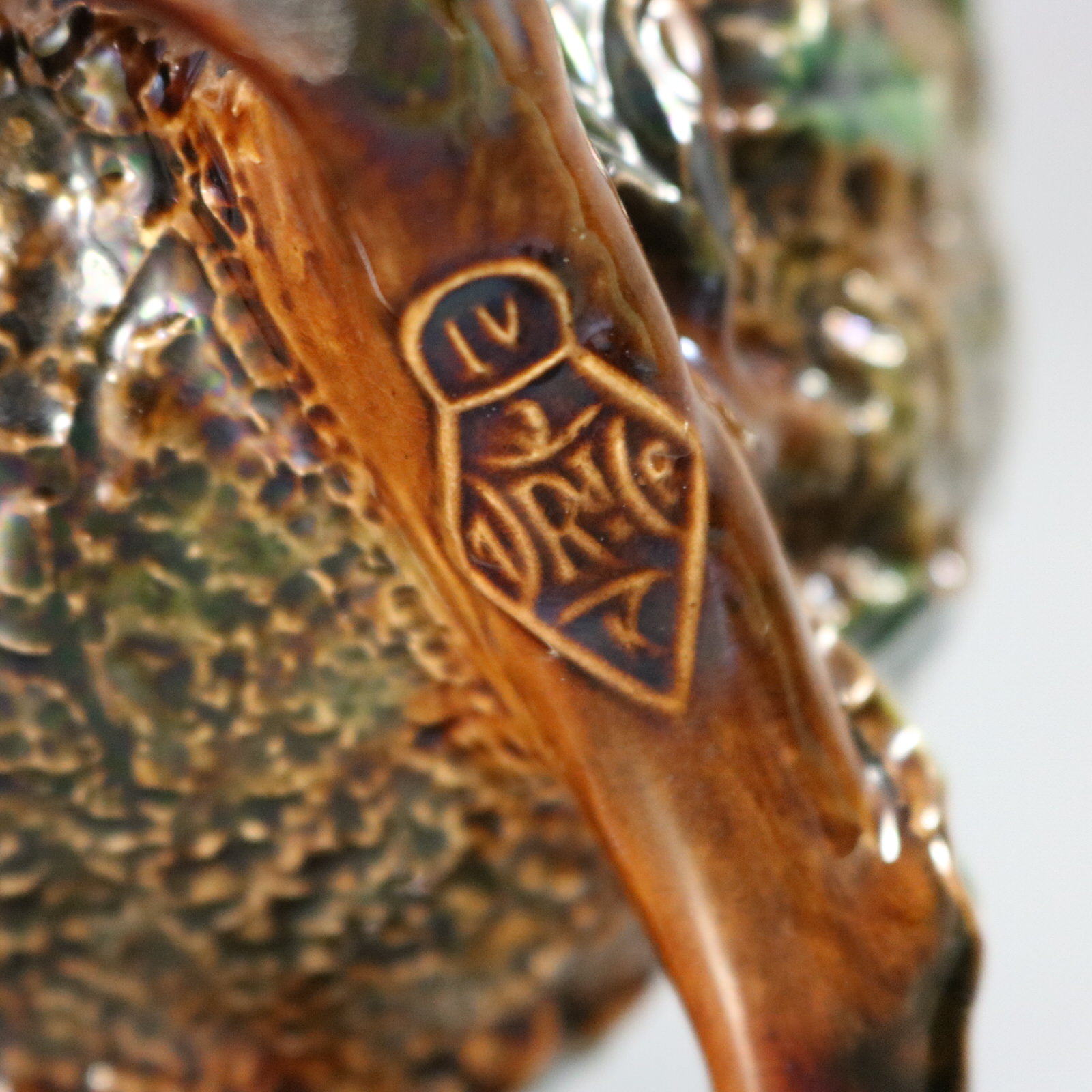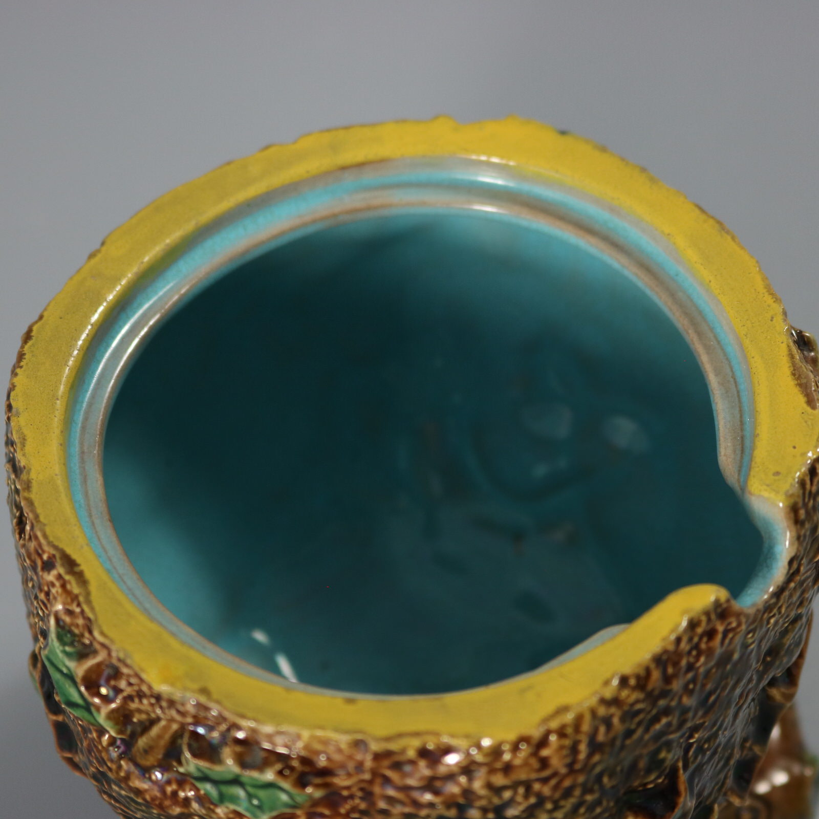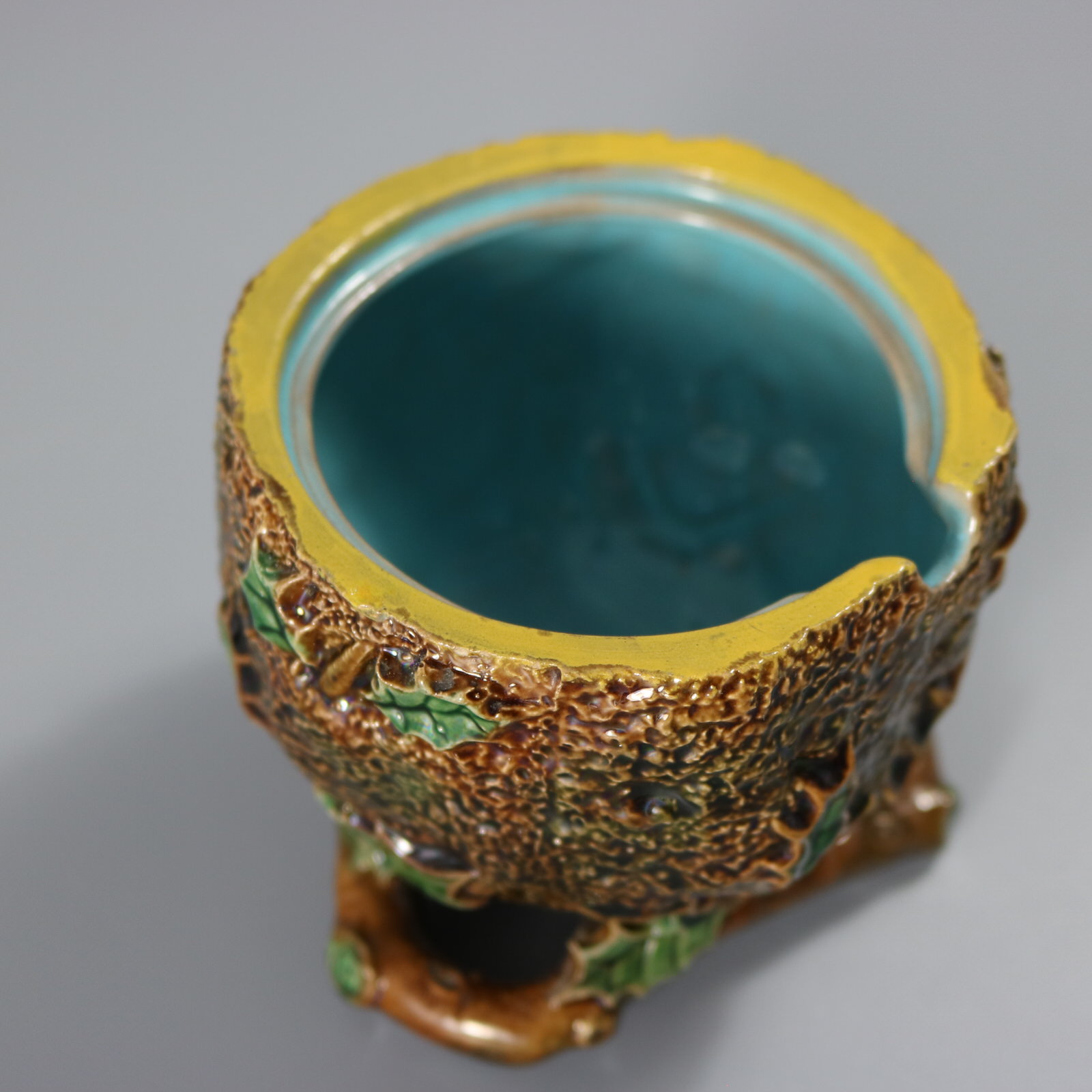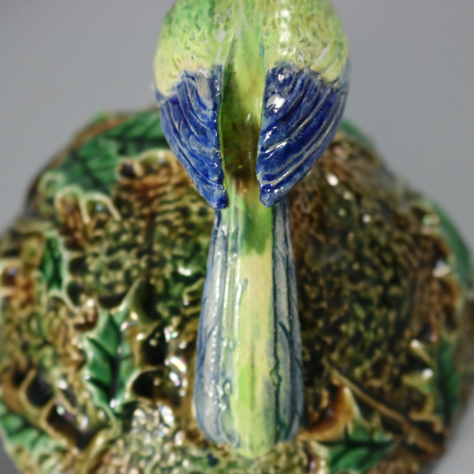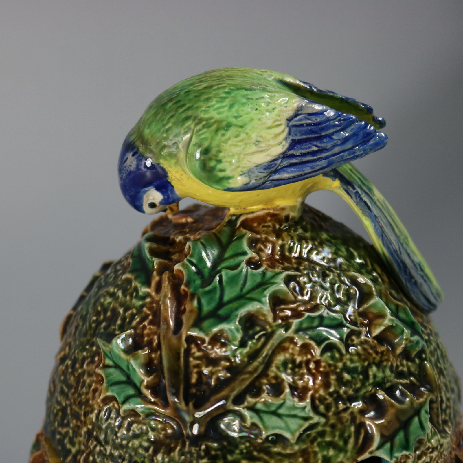 Victorian, circa 1875. 6.5ins high, 4.1ins wide, 4.1ins depth. George Jones Majolica preserve pot and cover which features a holly covered bird's nest, with blue tit finial.