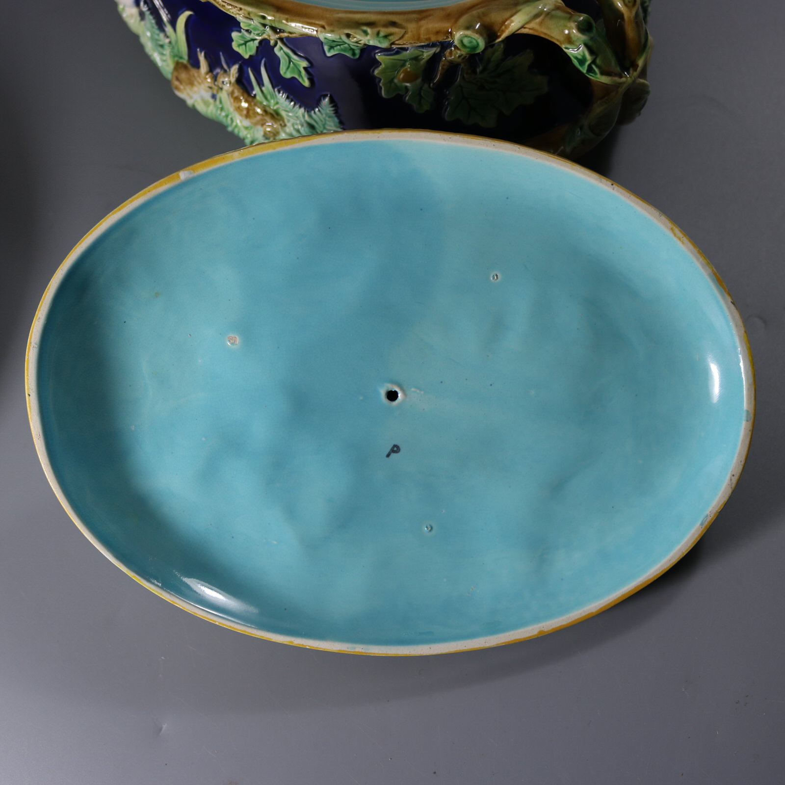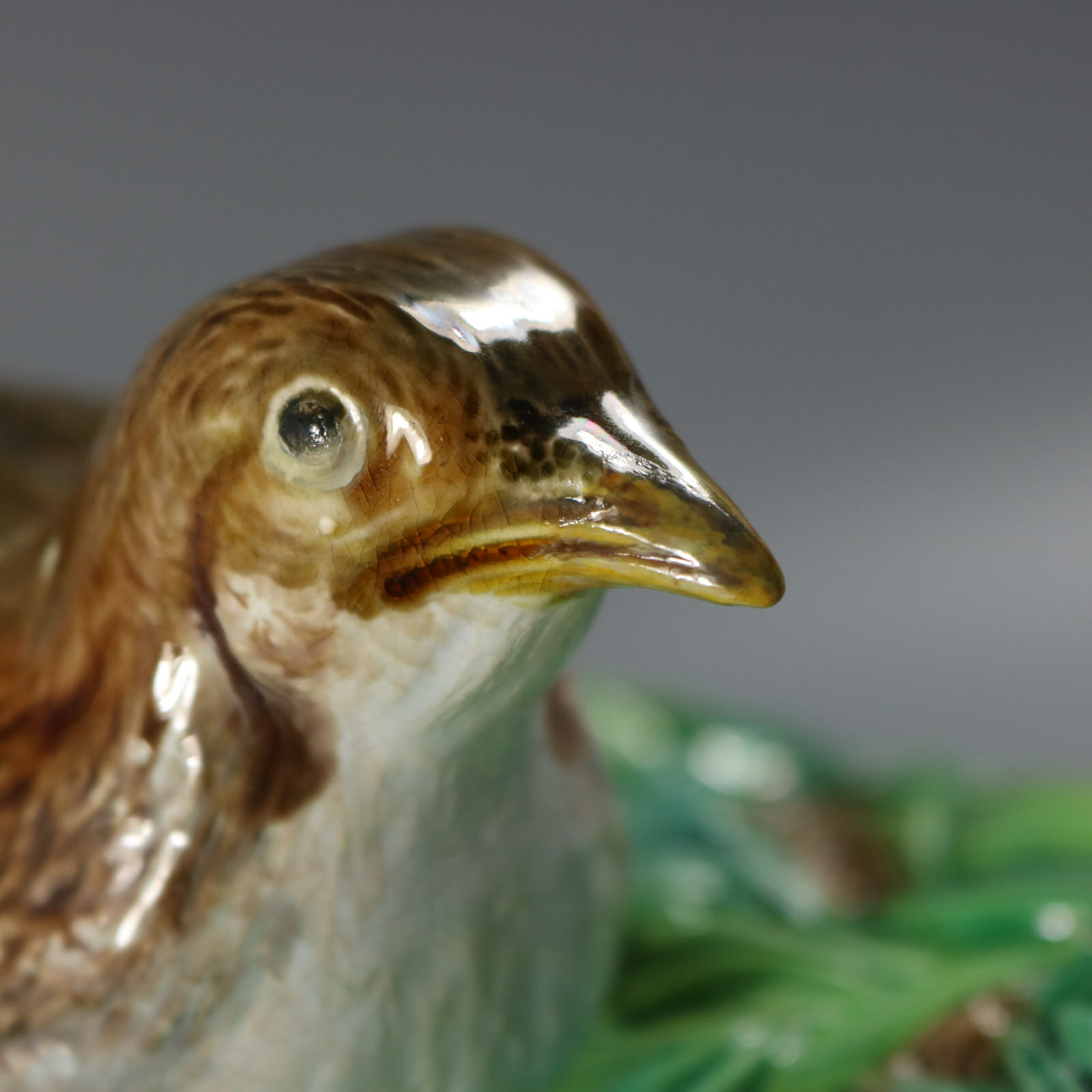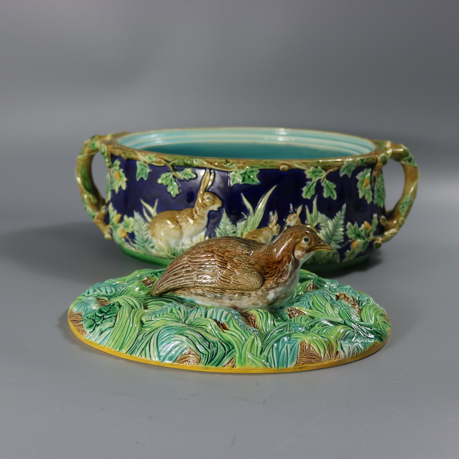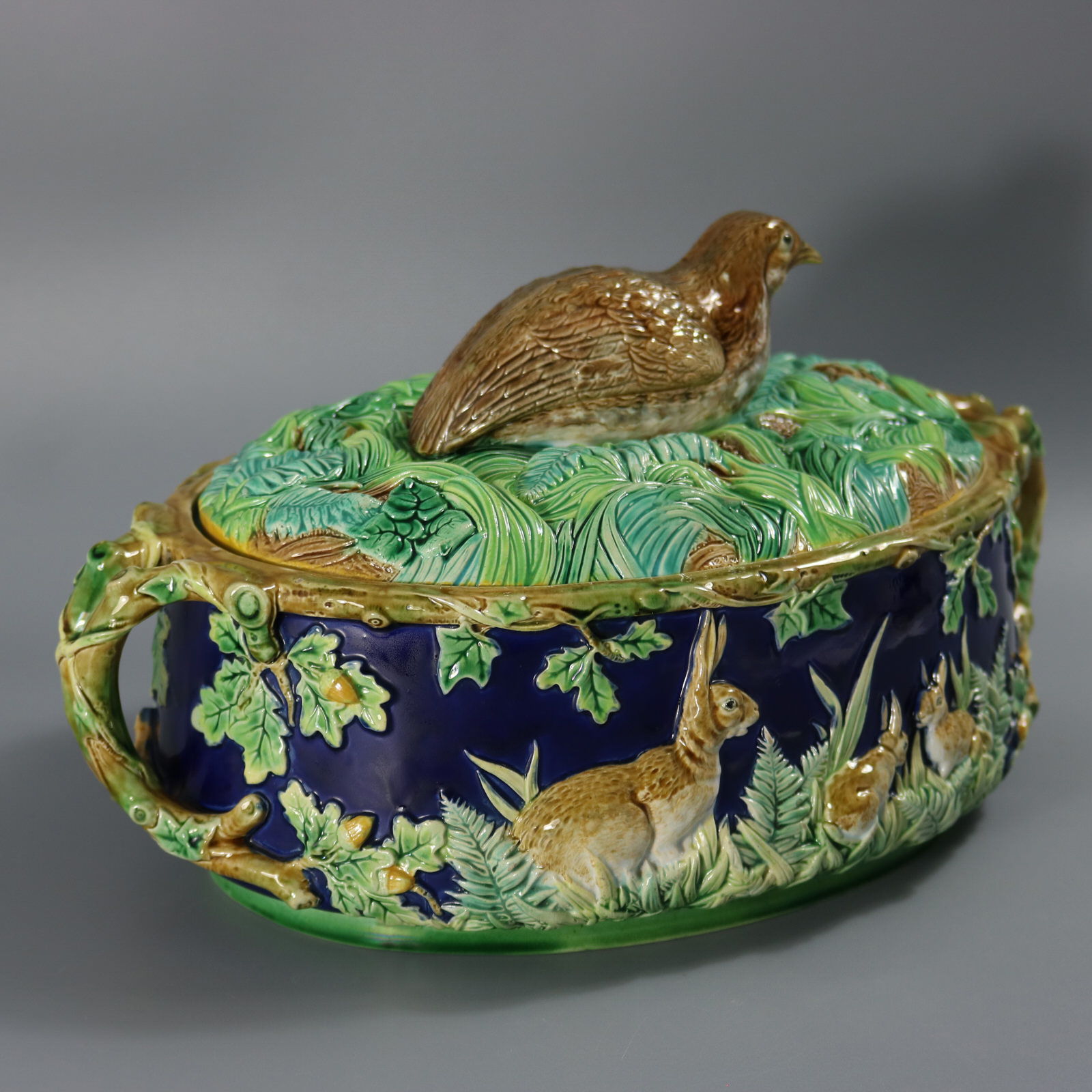 Victorian, circa 1873. 7.9ins high, 13.4ins wide, 8.3ins depth. George Jones Majolica game pie dish which features a partridge finial on the lid, sitting amongst ferns and leaves.