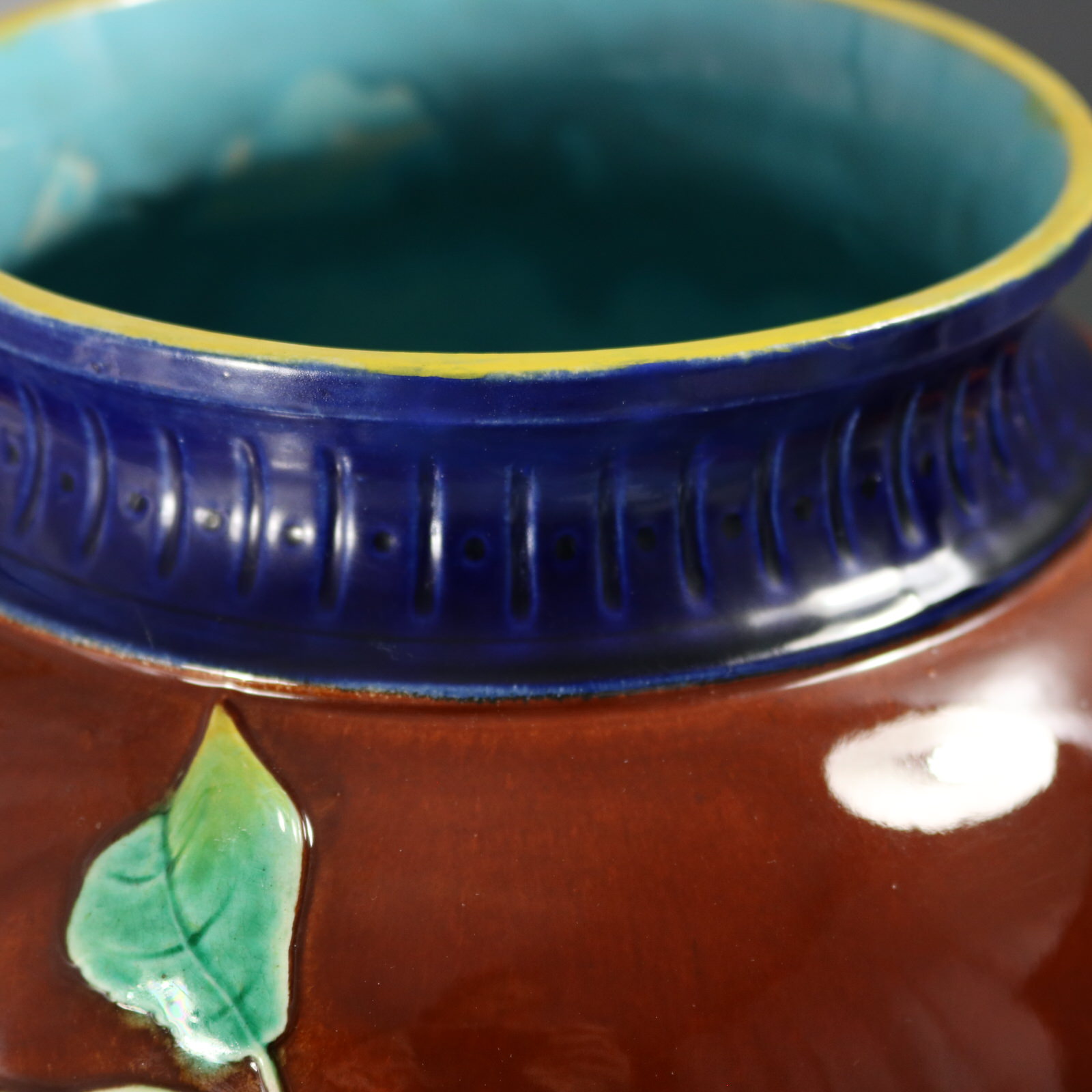 Victorian, circa 1875. 12.2ins high, 10.6ins wide, 10.2ins depth. Brown Westhead Moore and Co Majolica vase which features deeply raised peaches hanging on a blossoming branch to the front. Plums to the reverse.