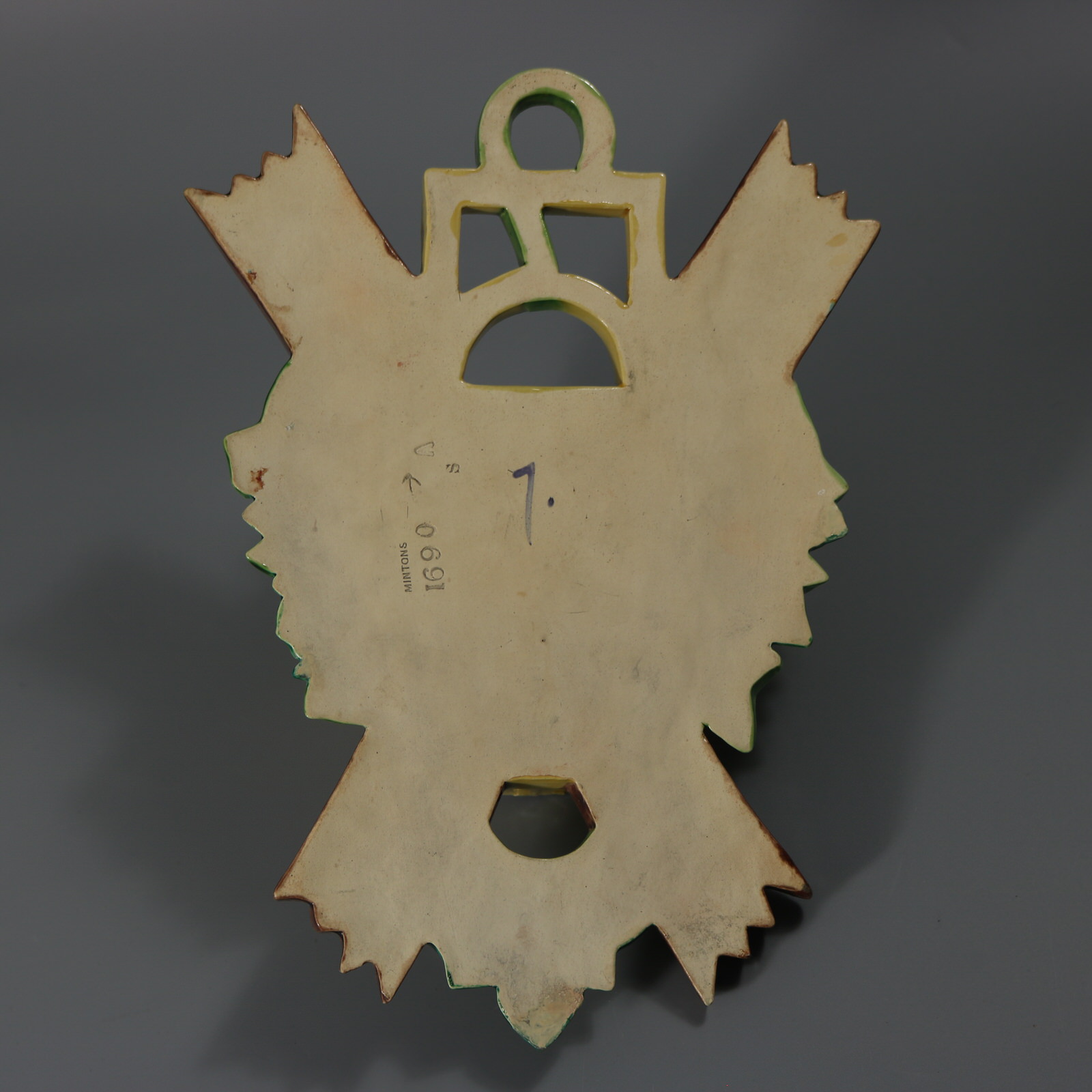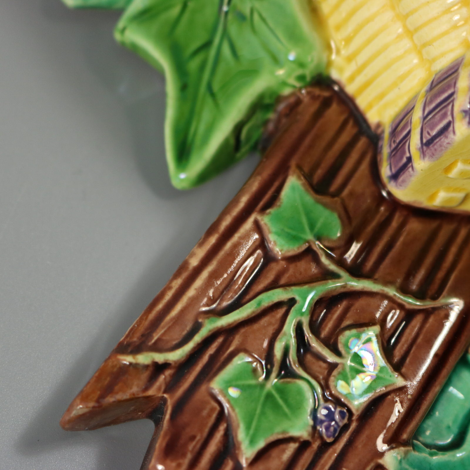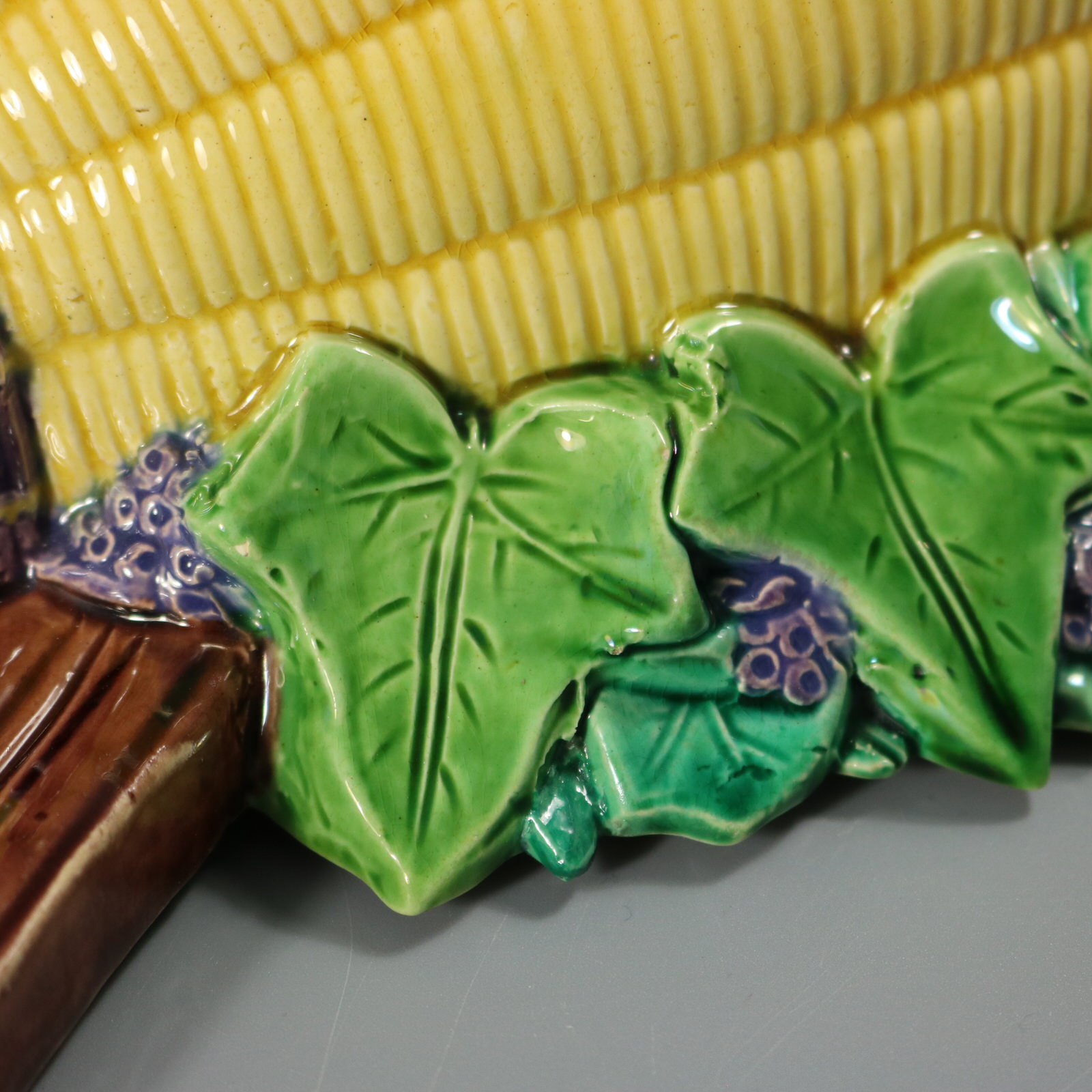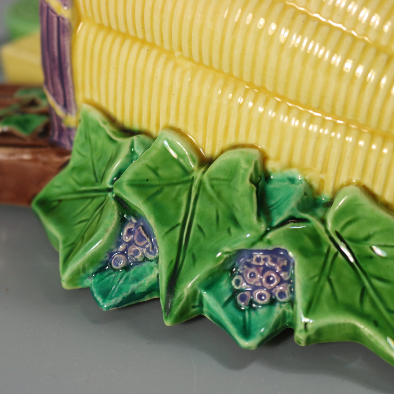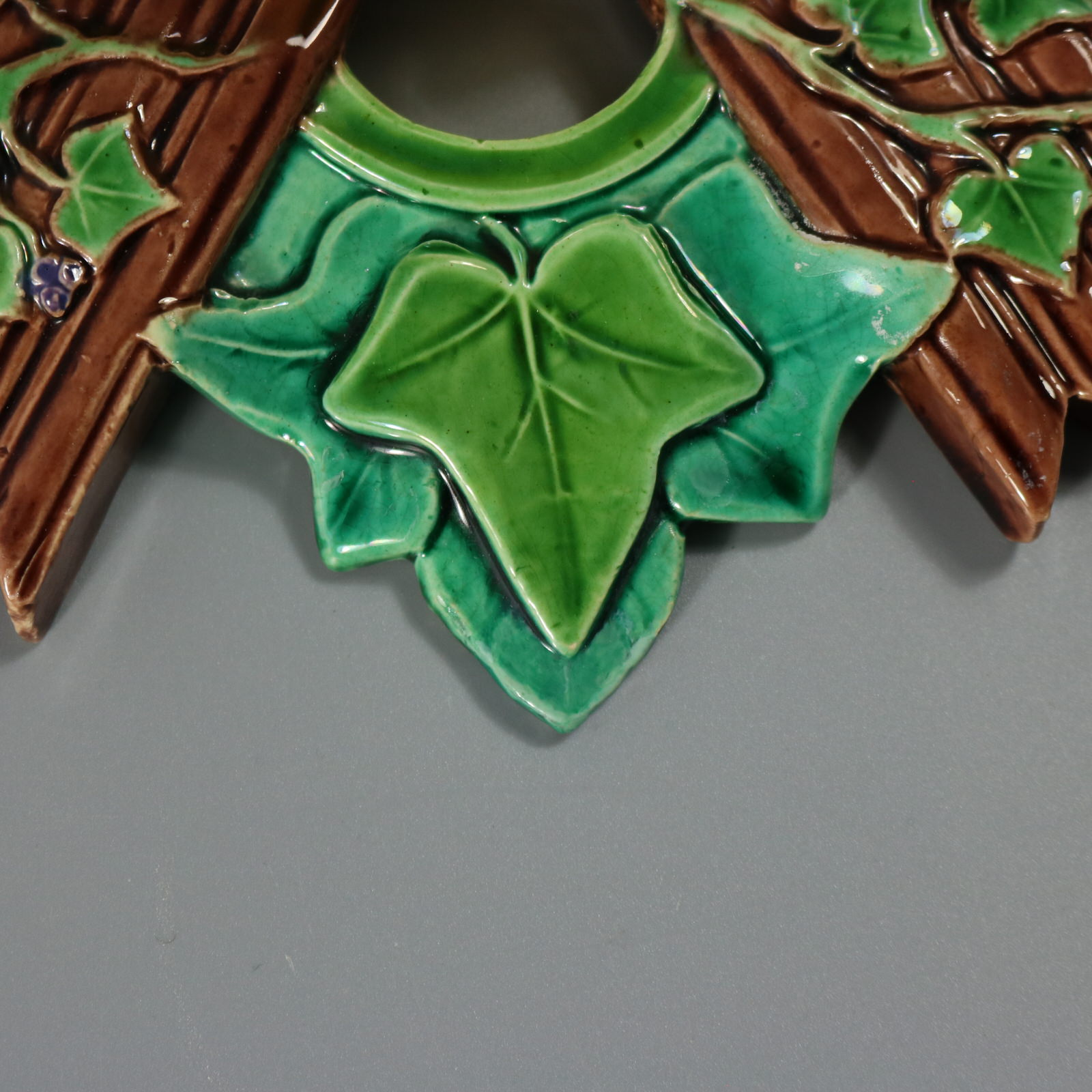 Victorian, circa 1889. 10.8ins high, 7.8ins wide, 3.7ins depth. Minton Majolica wall pocket which features a basketweave pocket mounted on wood-effect panels, surrounded by grape vines.