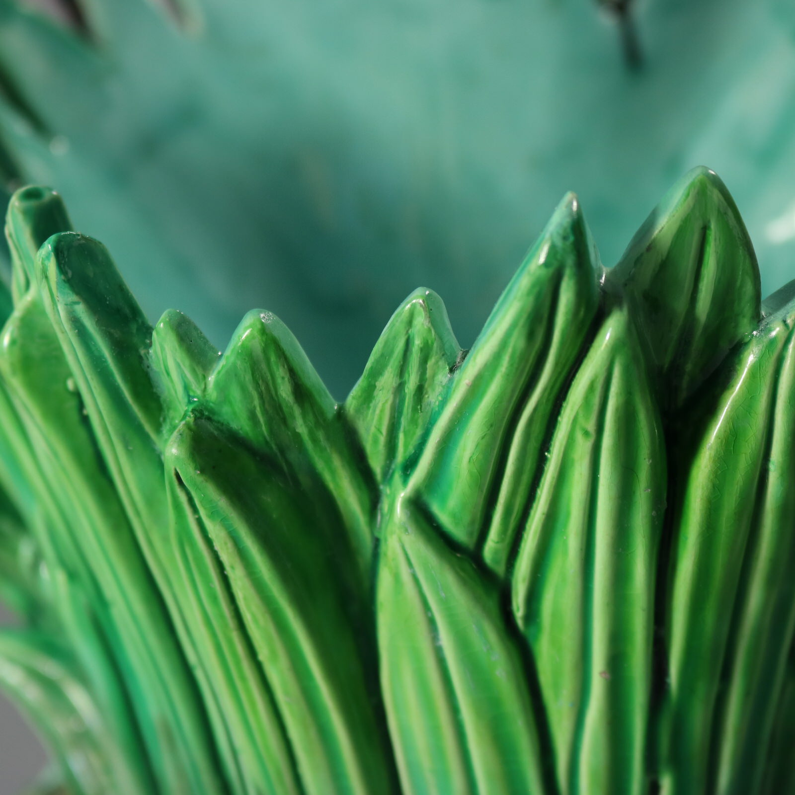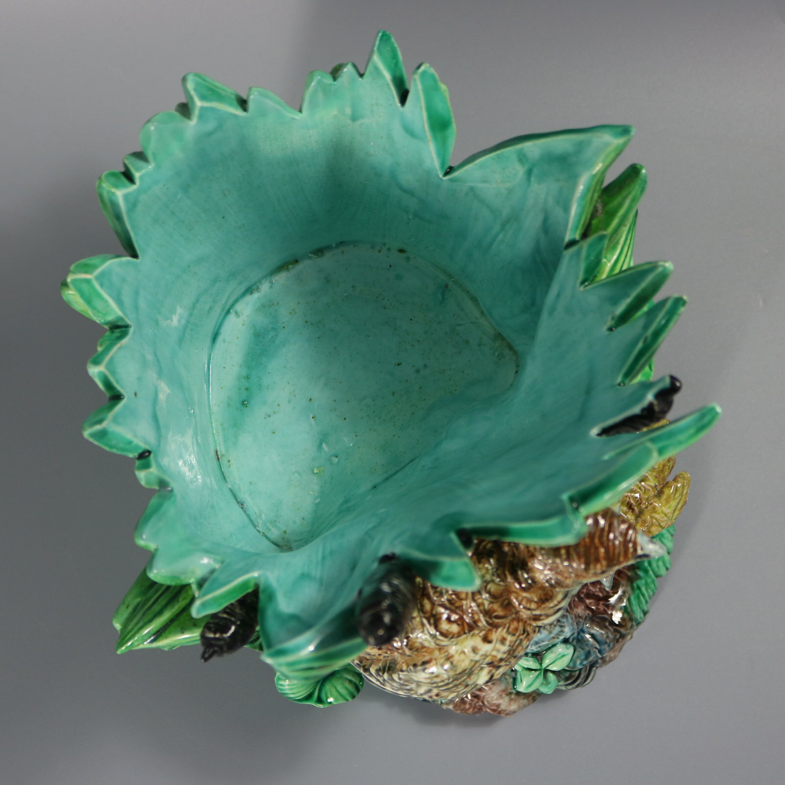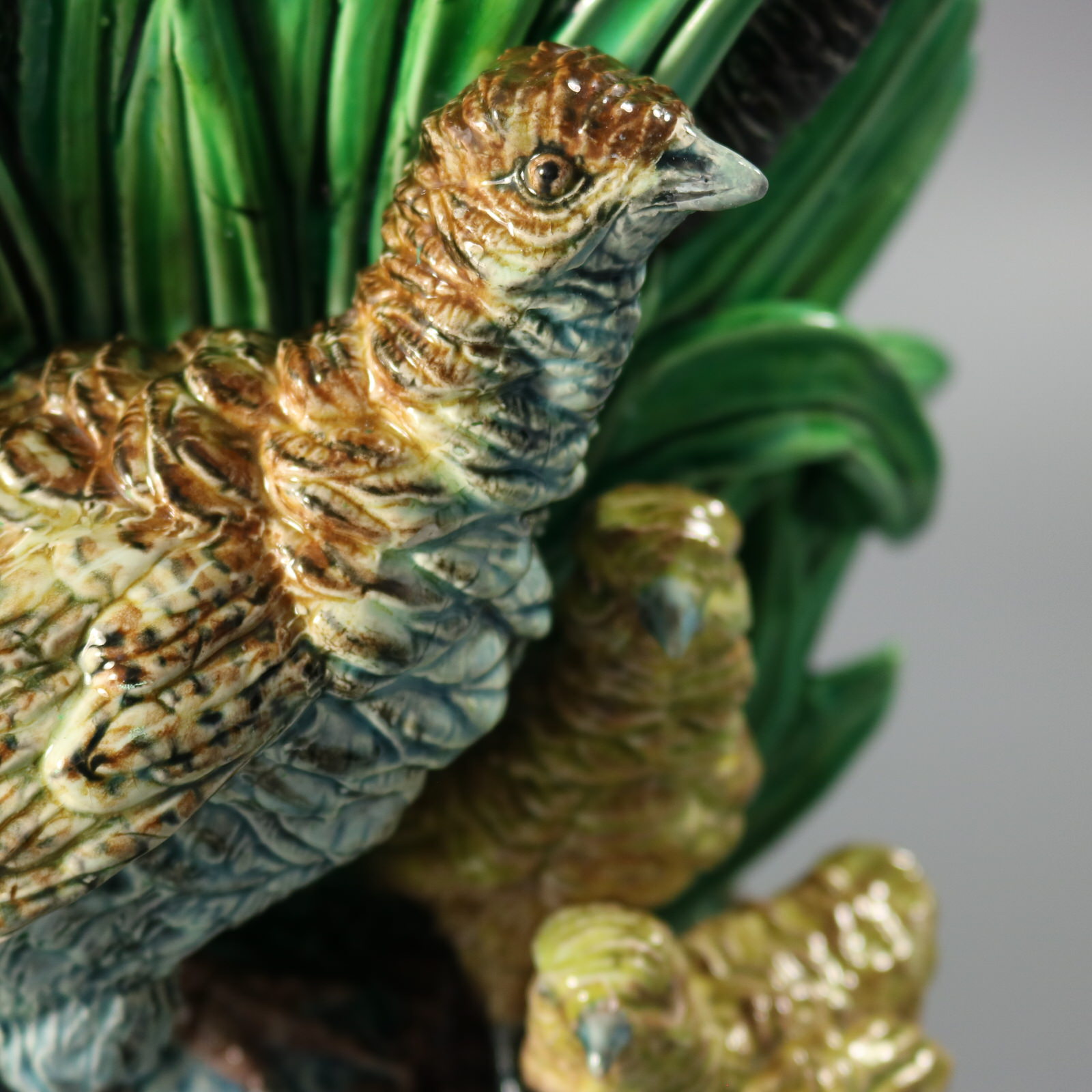 Victorian, circa 1880. 9.3ins high, 8.7ins wide, 8.7ins depth. Lonitz Majolica planter which features a partridge and two chicks stood in front of bulrushes.