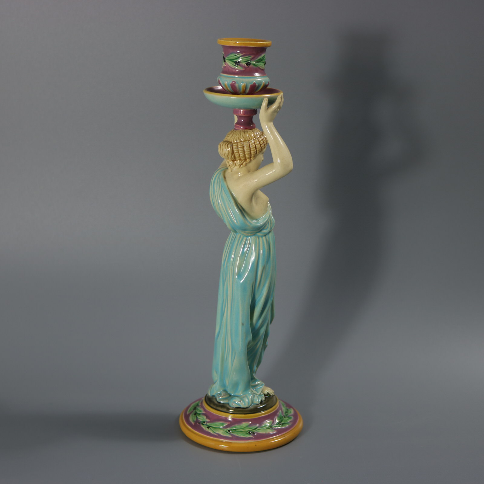 Victorian, circa 1872. 11.2ins high, 3.6ins wide, 3.6ins depth. George Jones Majolica candlestick which features a lady dressed in a classical, flowing robe, holding the candle sconce above her head.