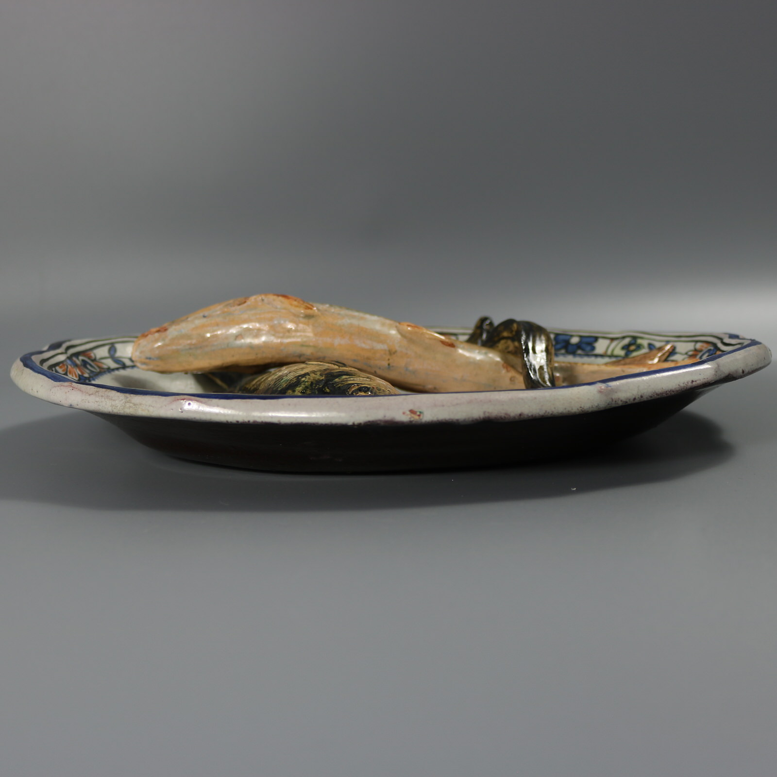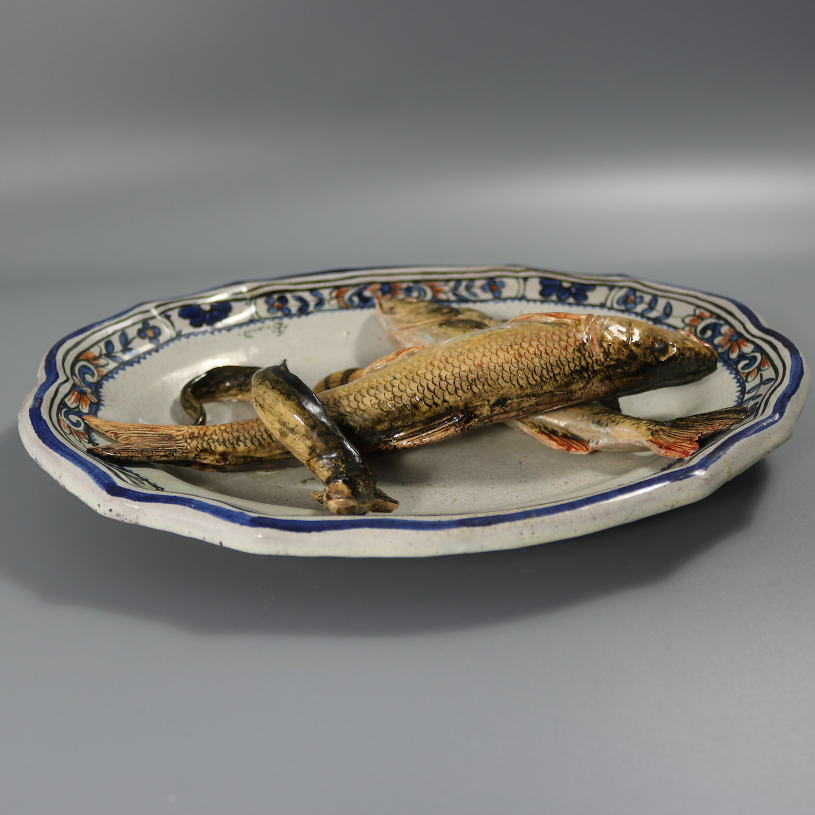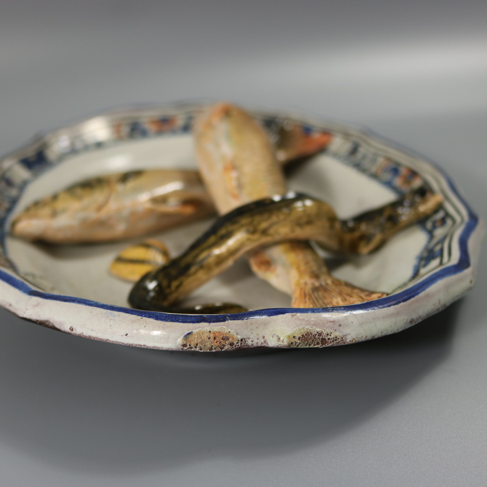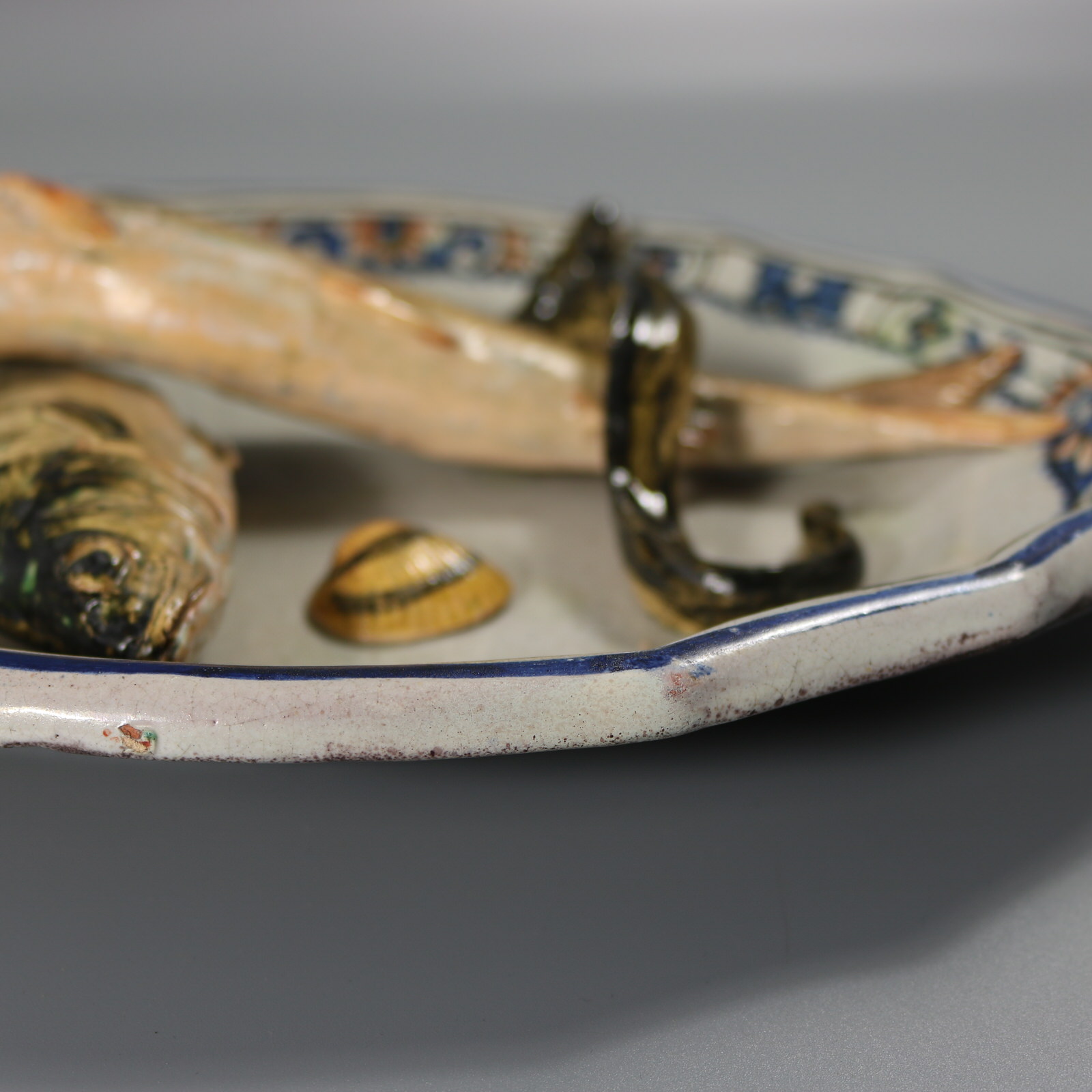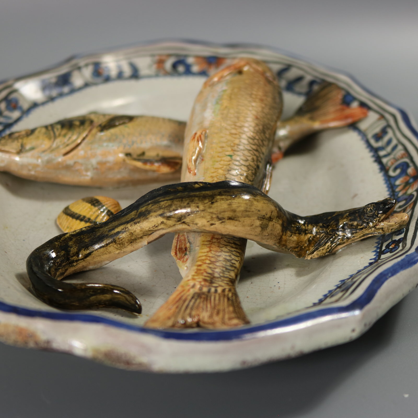 Victorian, circa 1880. 8.5ins high, 11.1ins wide, 2ins depth. Brard Majolica wall platter which features fish (a perch and a barbel), an eel and a cockle shell.