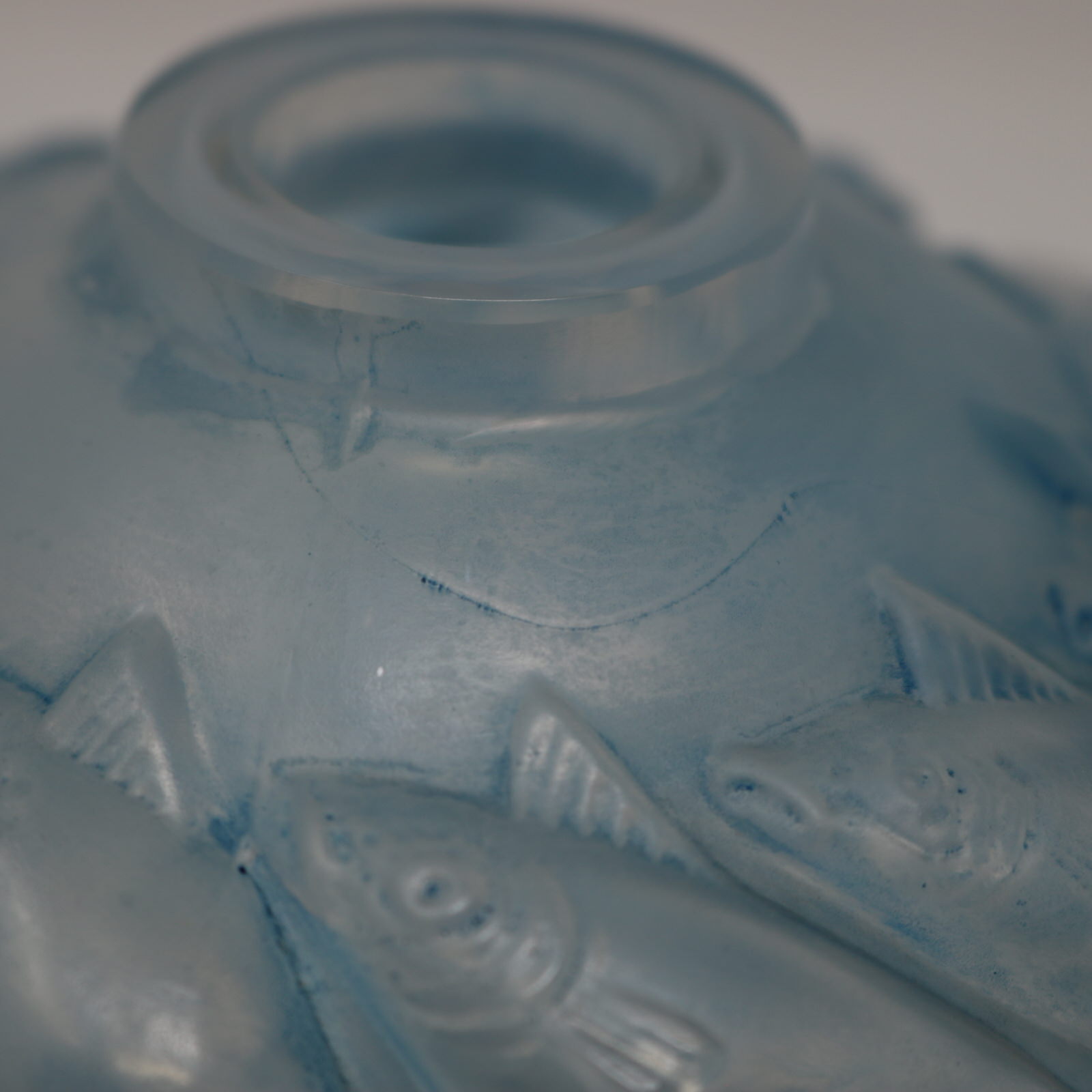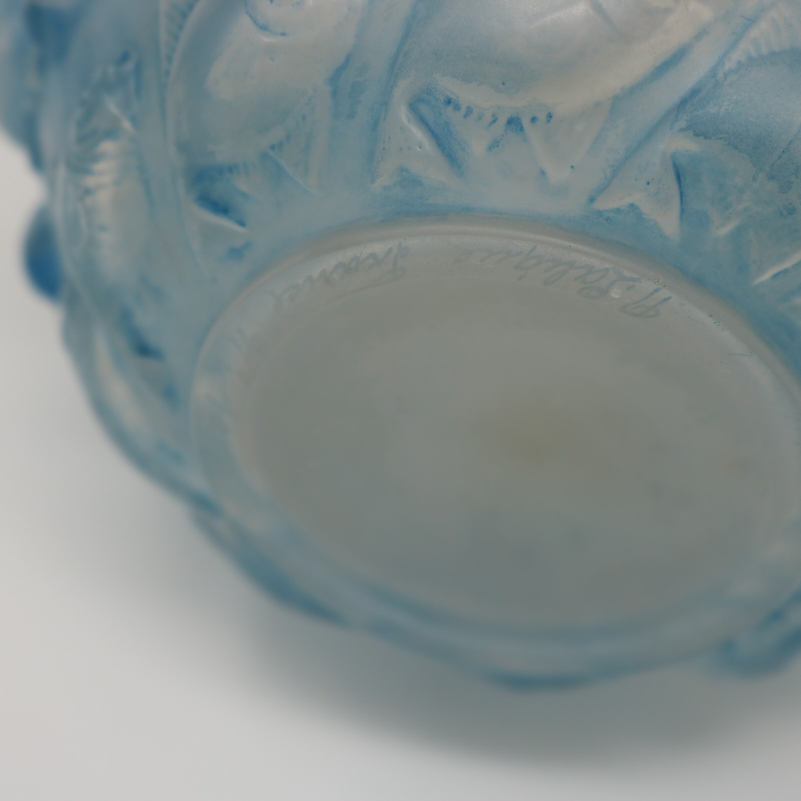 Introduced in 1928. 5.3ins high, 4.9ins wide, 4.9ins deep. Rene Lalique Opalescent Glass with blue staining, 'Camaret' Vase.