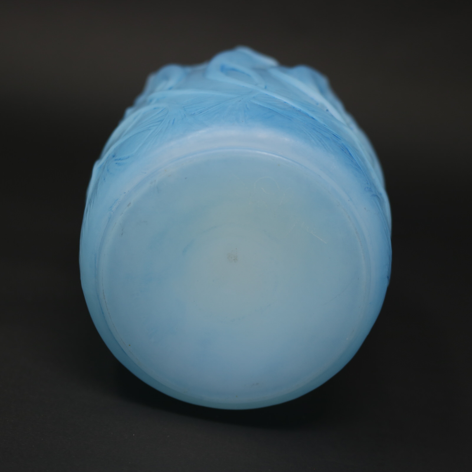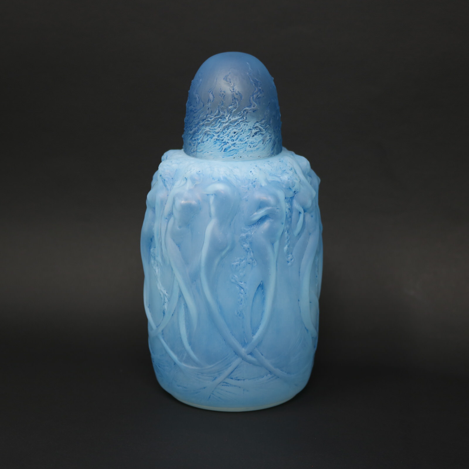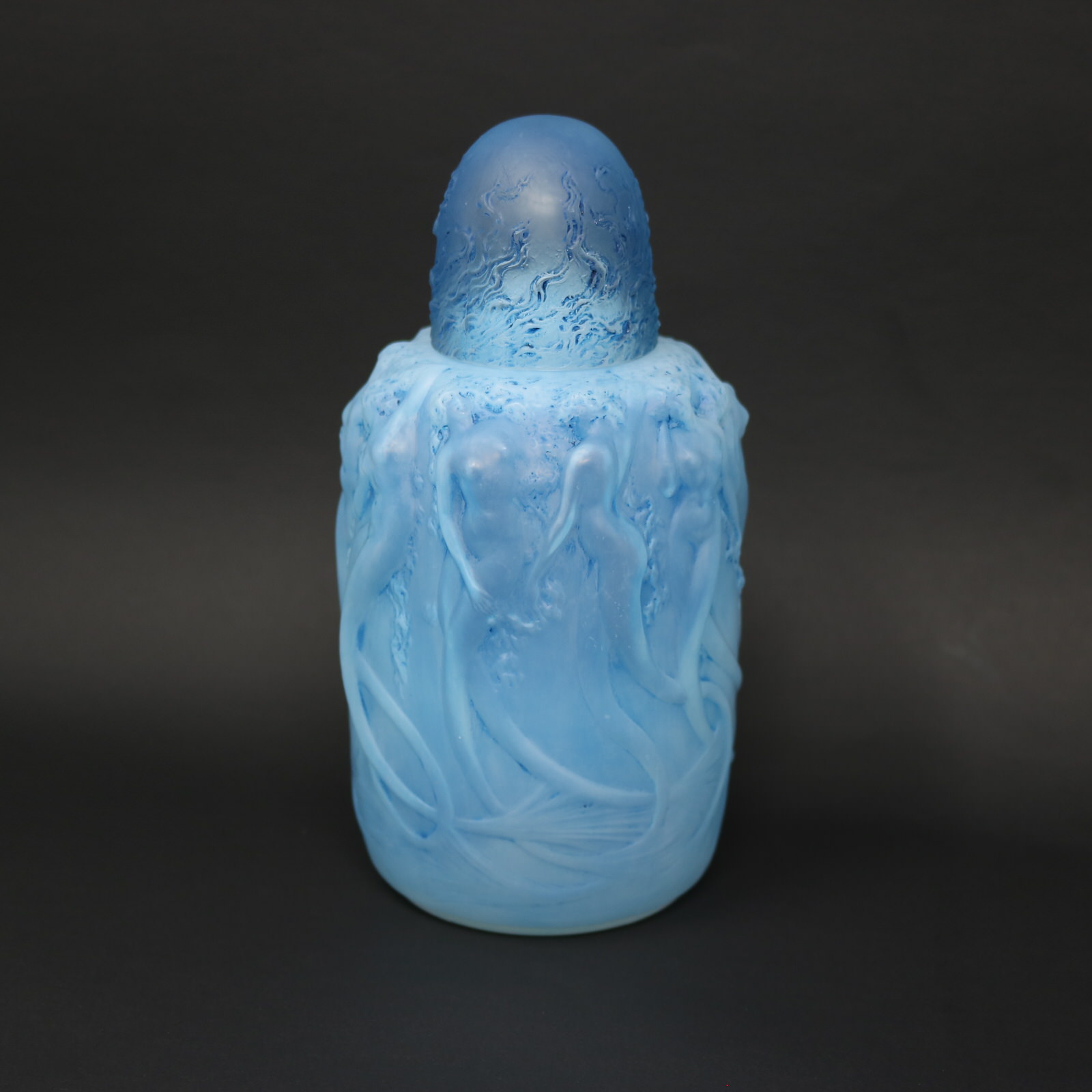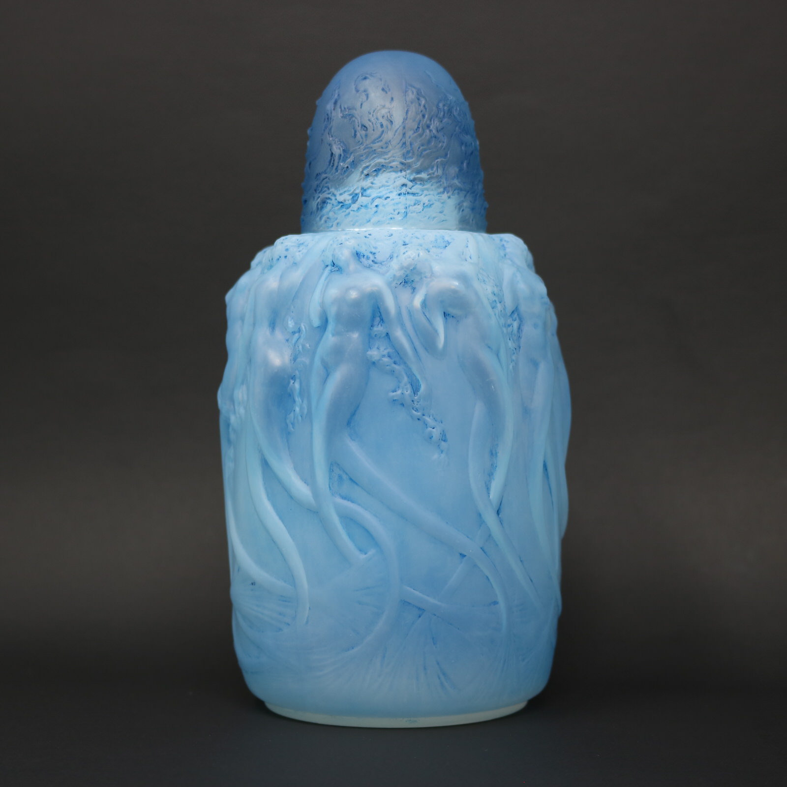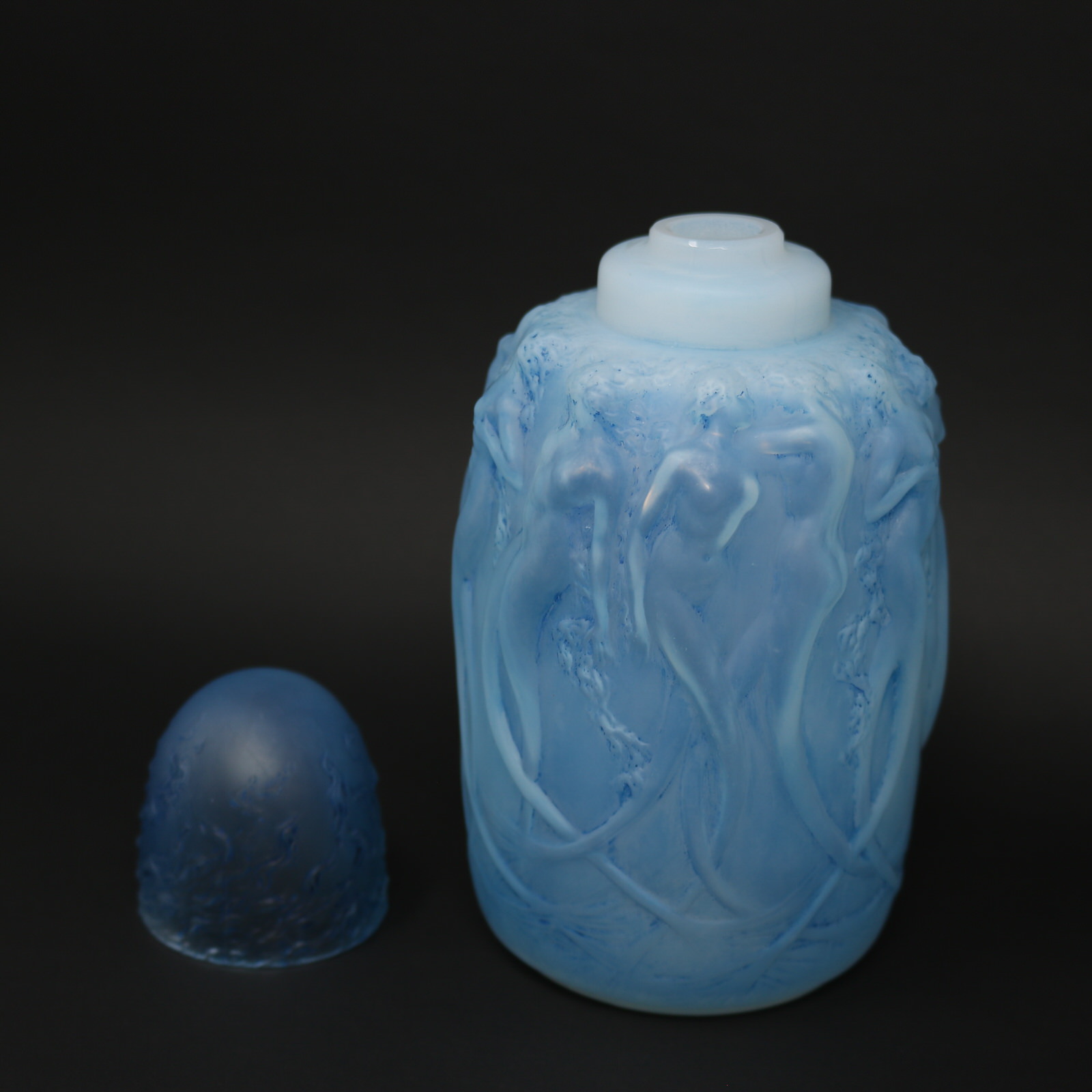 Introduced in 1920. 17.5cm (6.9ins) high, 9cm (3.5ins wide) diameter. Rene Lalique opalescent glass 'Sirenes' liquid-incense burner bottle.