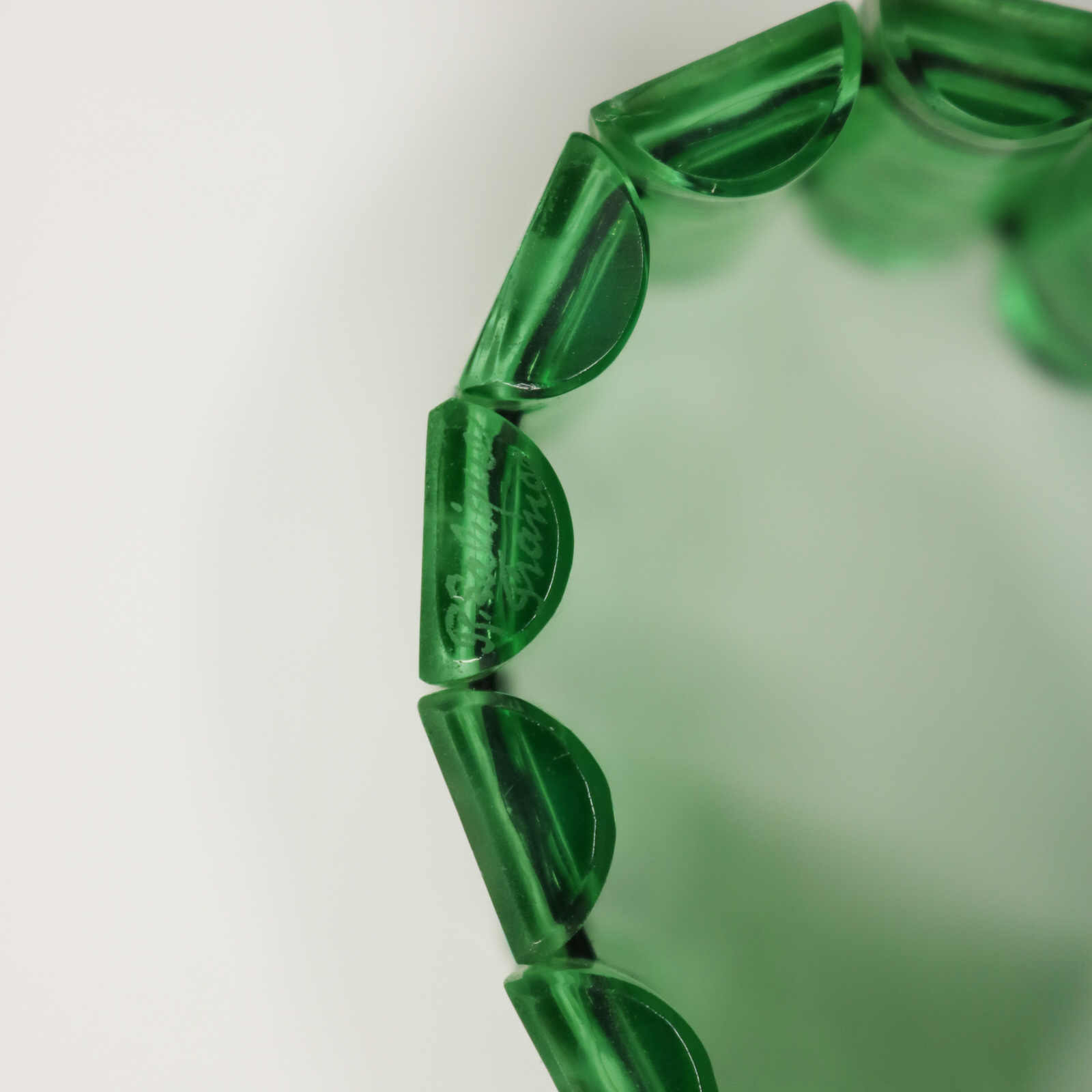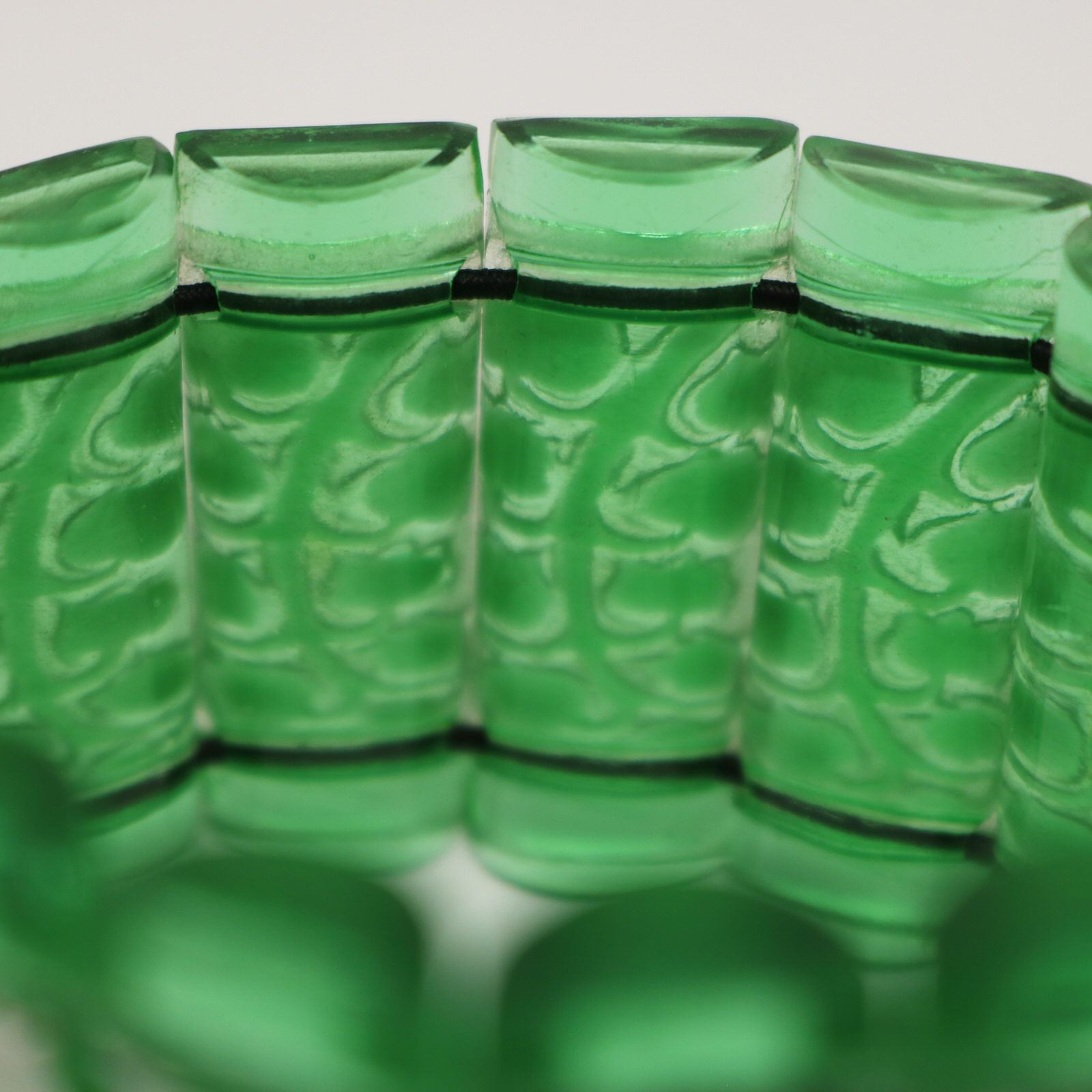 Introduced in 1928. 3.5cm (1.4ins) high, 1cm (0.4ins) wide, 0.6cm (0.2ins) deep. Rene Lalique green glass with white enamel 'Muguet Haut' Bracelet.