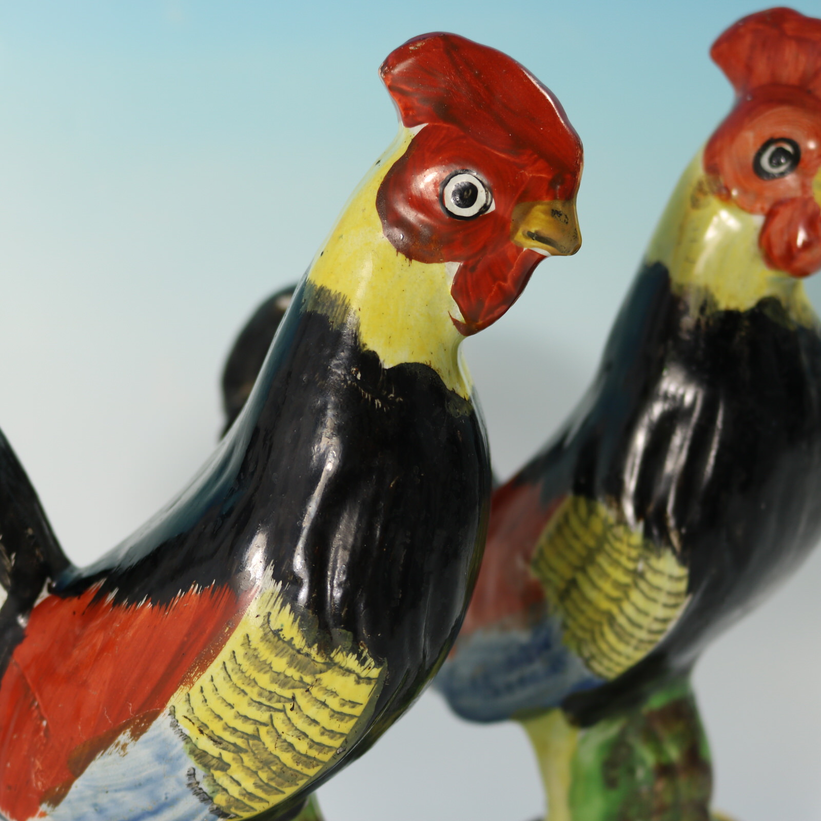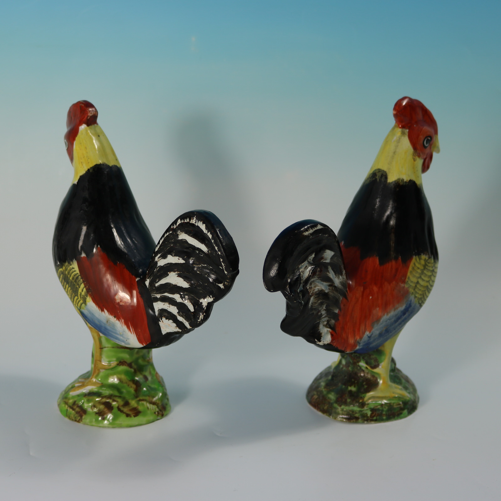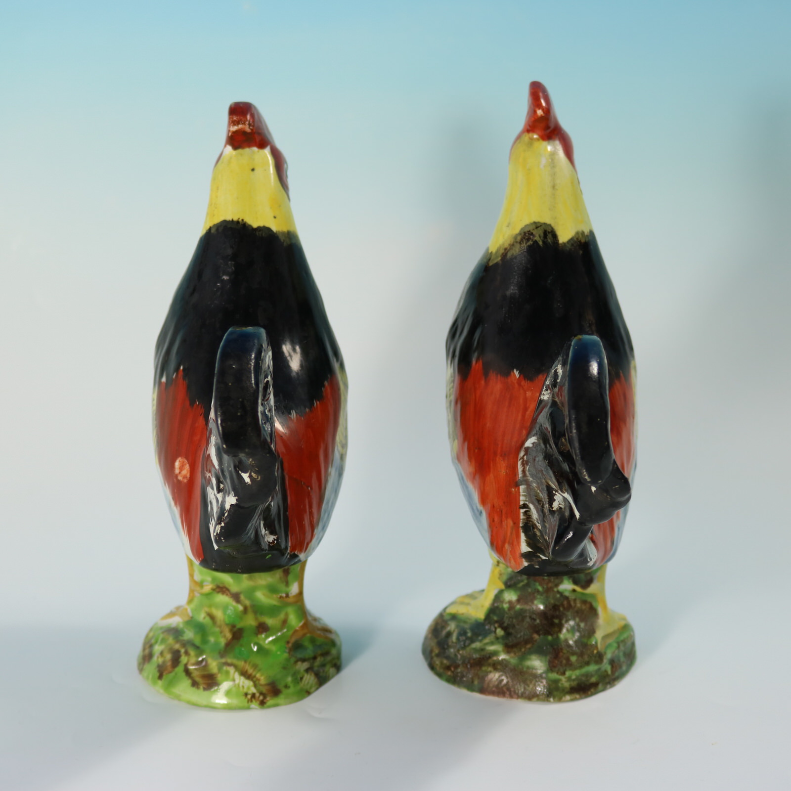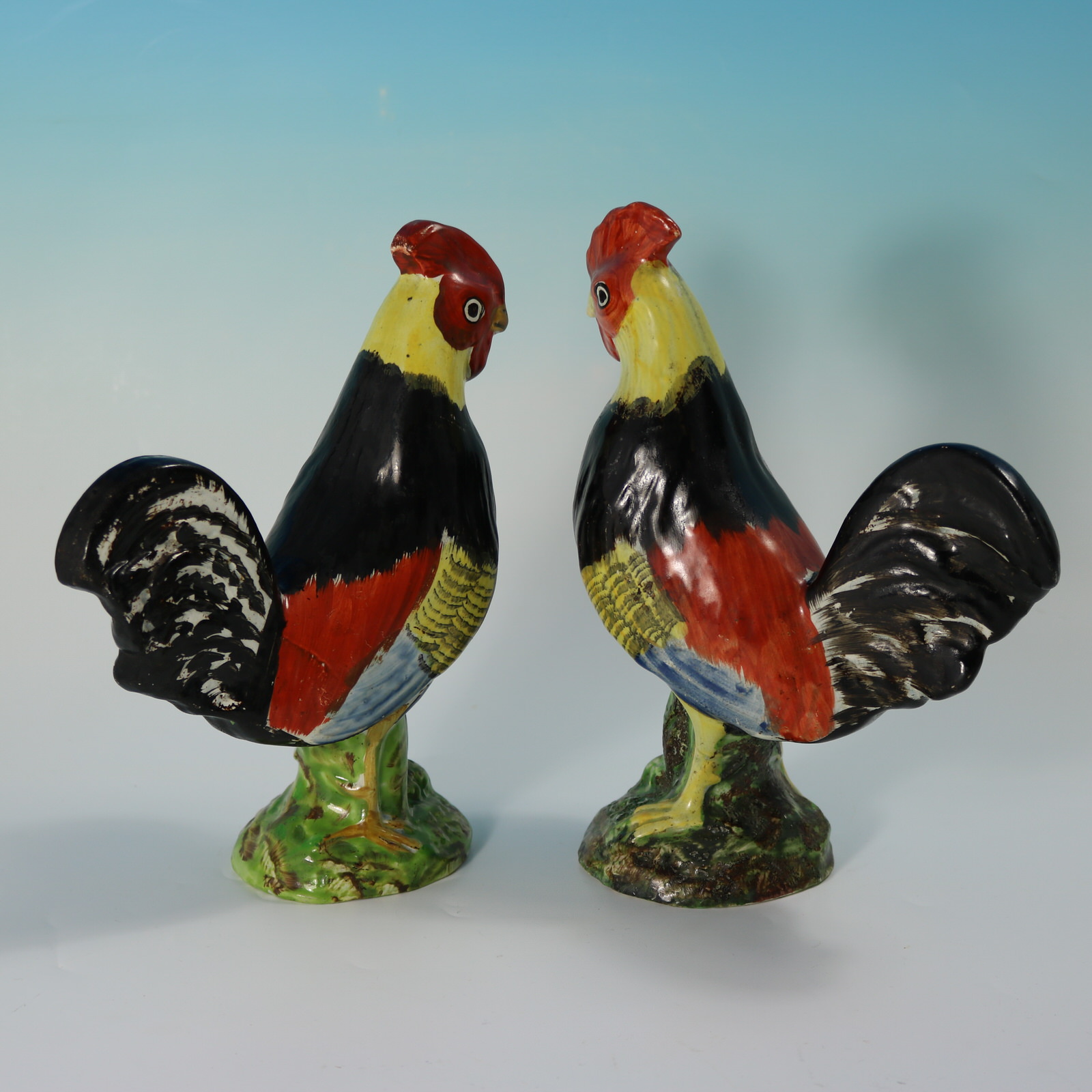 pre-Victorian, circa 1820. Tallest is 8.3ins high, 6.3ins wide, 3.1ins depth. Pair of Staffordshire Pottery pearlware figures which feature brightly coloured cockerels or roosters, stood on a circular base.