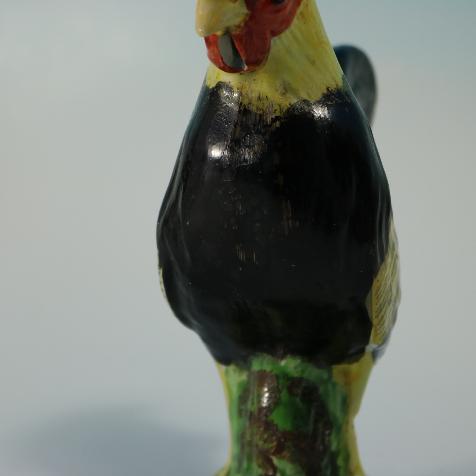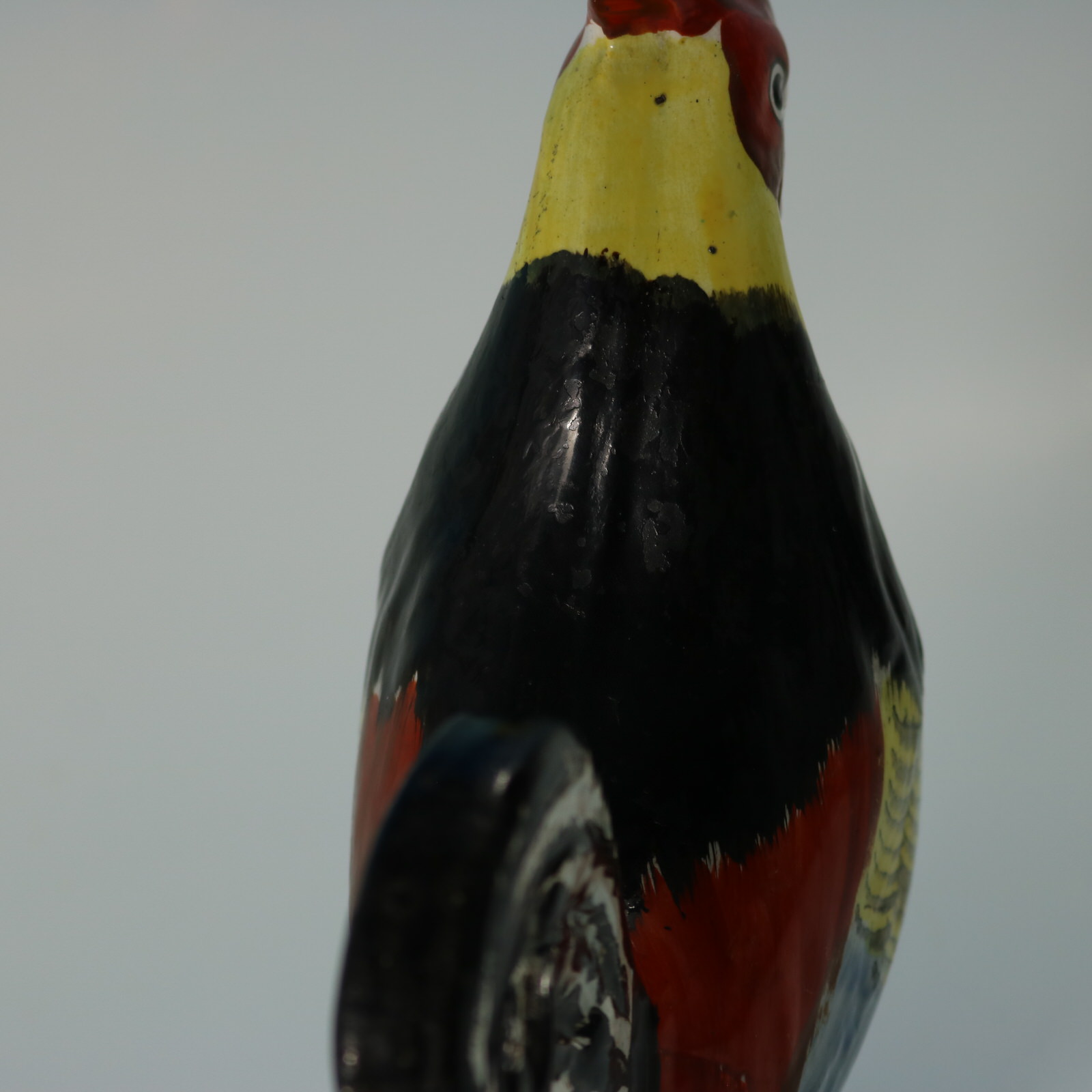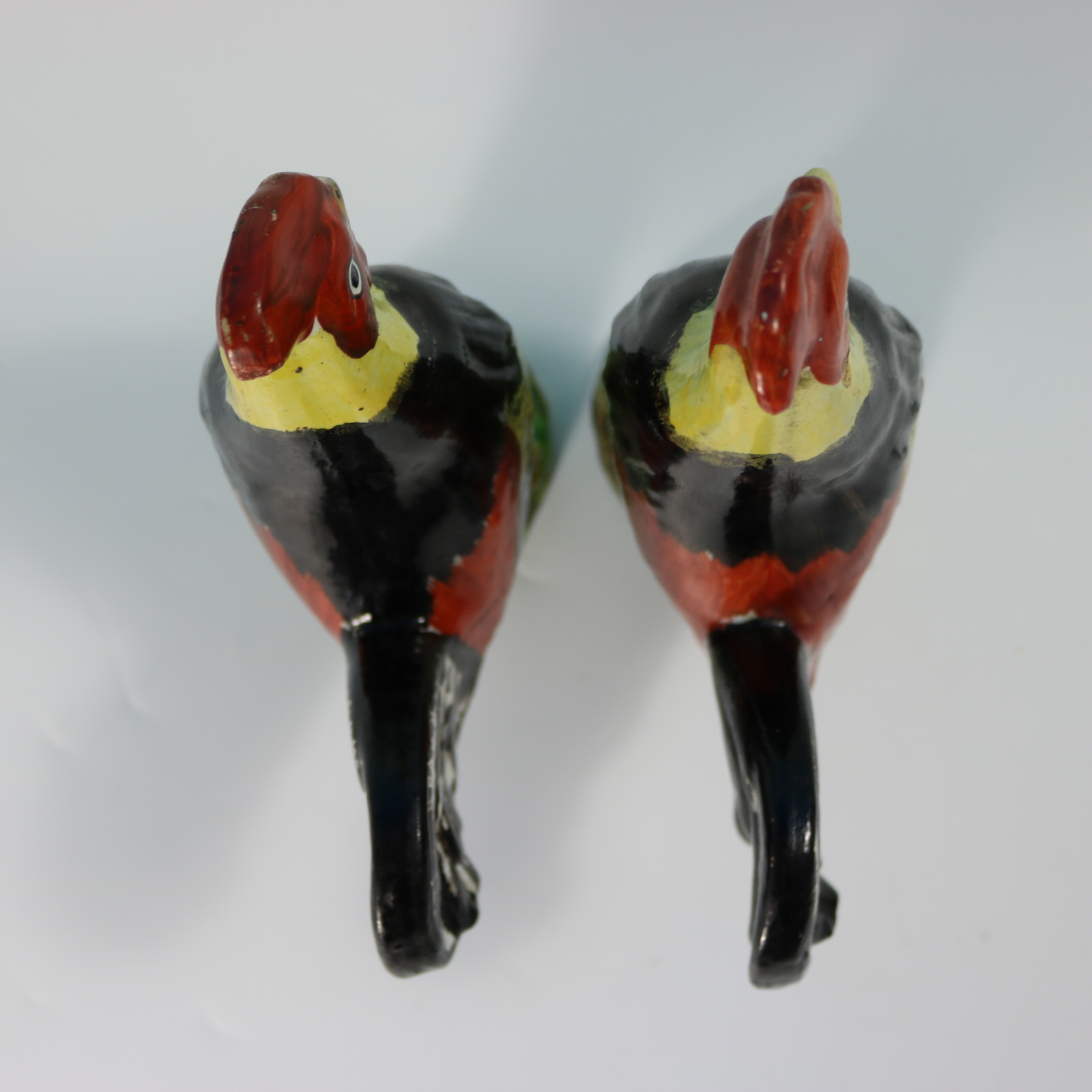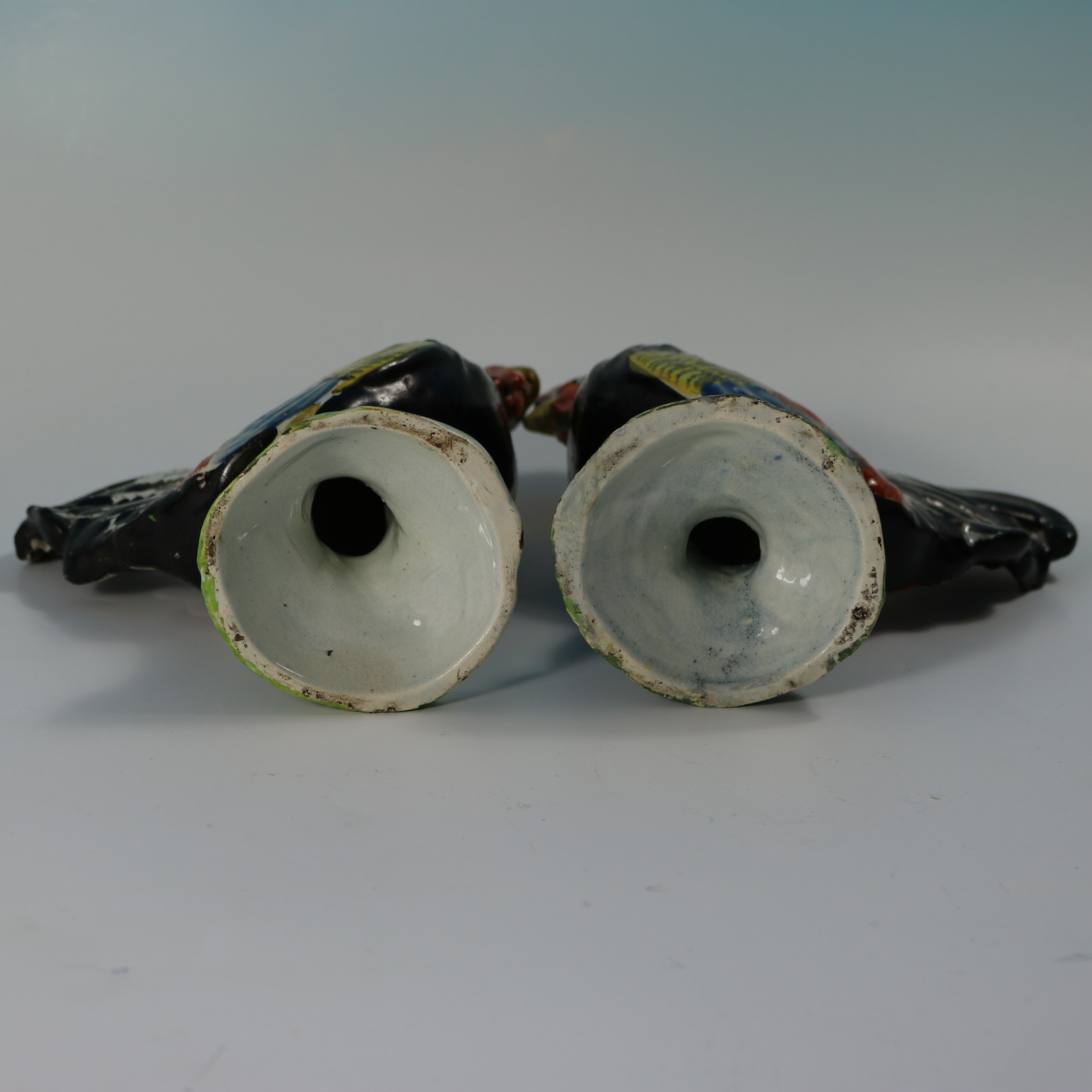 pre-Victorian, circa 1820. Tallest is 8.3ins high, 6.3ins wide, 3.1ins depth. Pair of Staffordshire Pottery pearlware figures which feature brightly coloured cockerels or roosters, stood on a circular base.