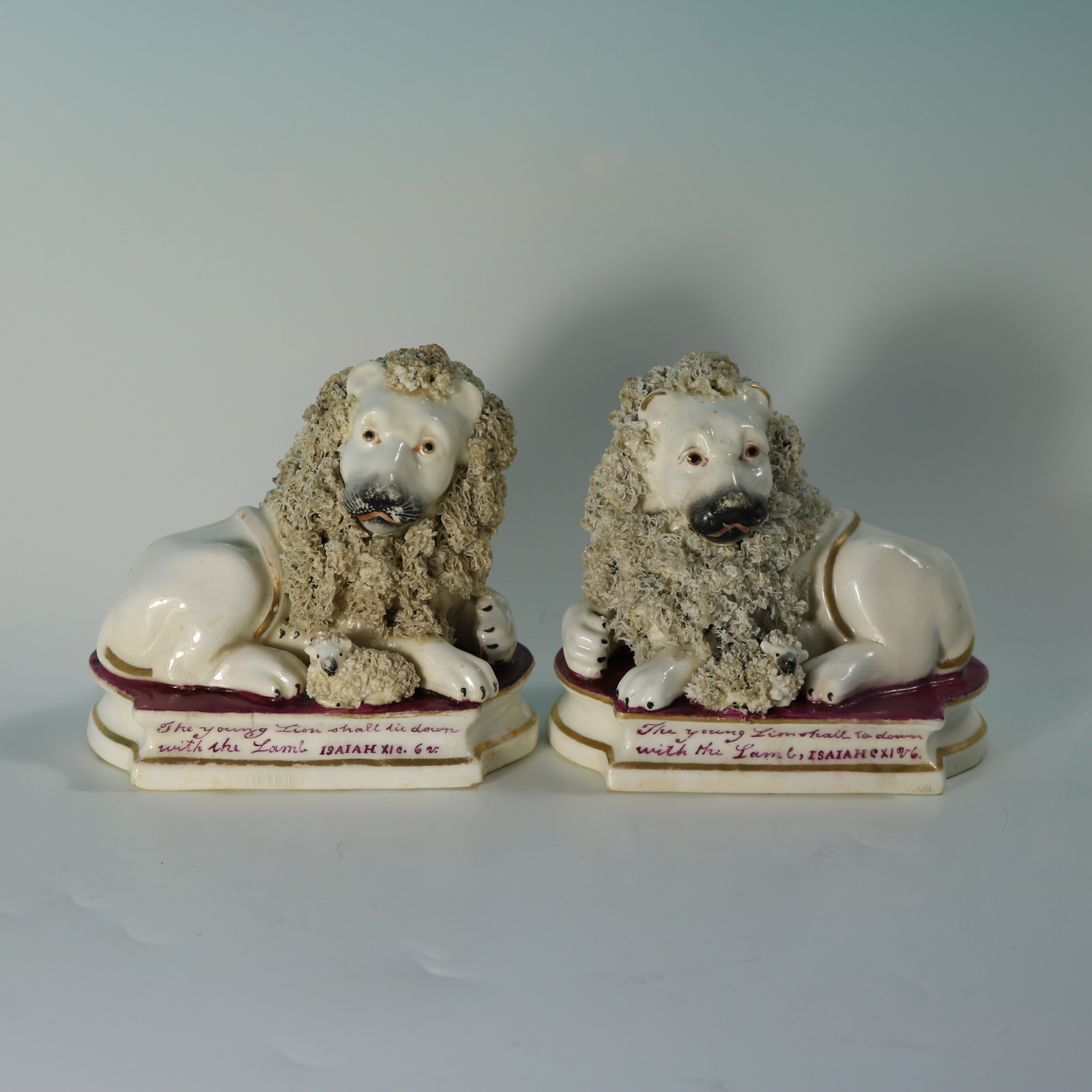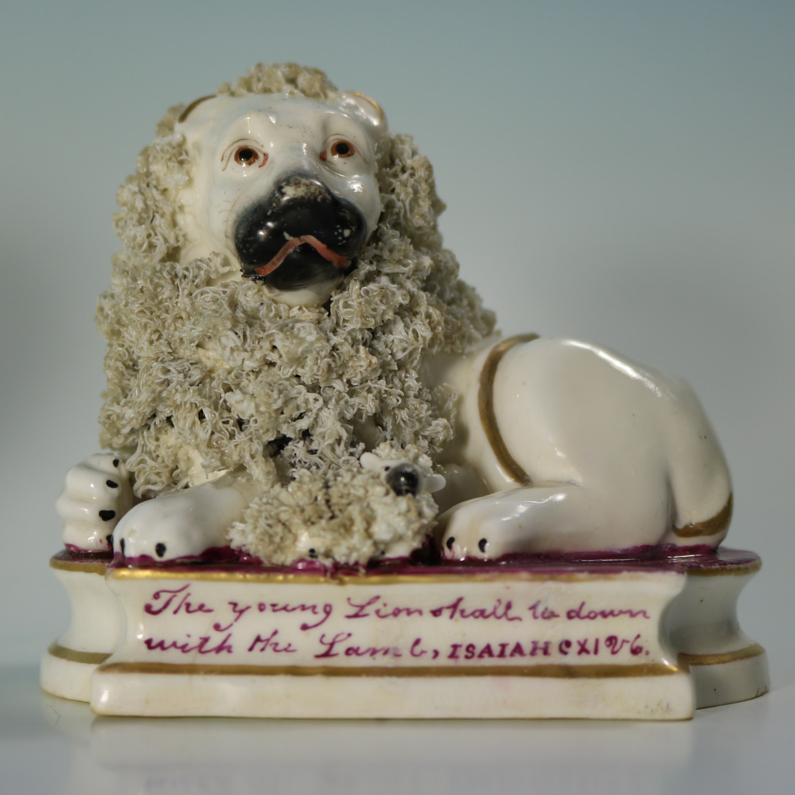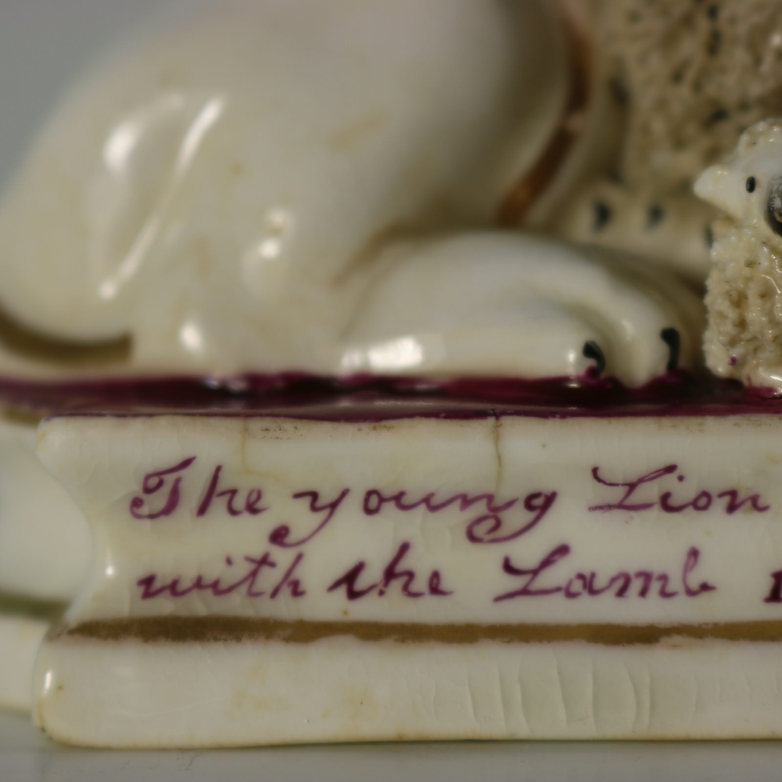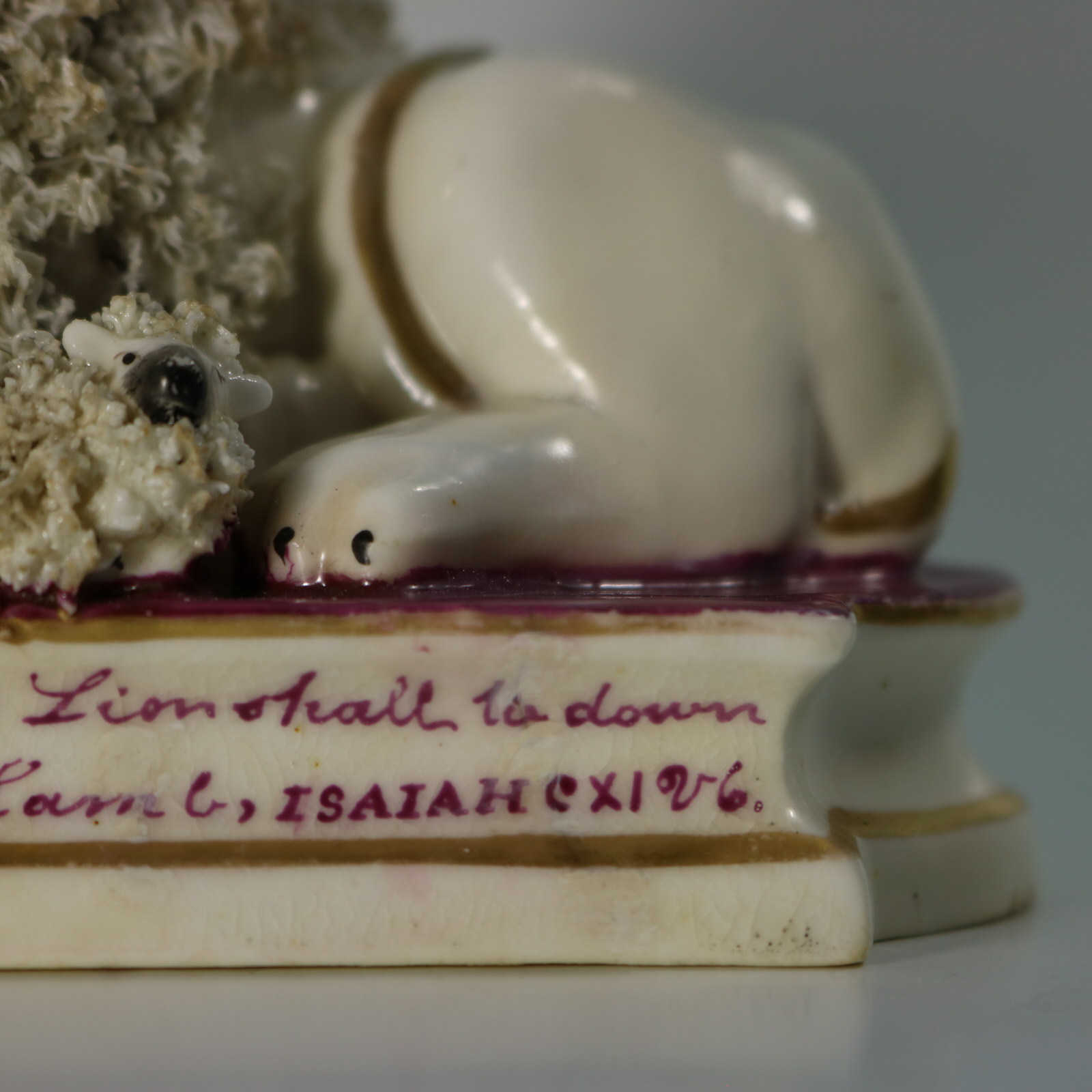 Titled base with purple transfer print reading 'The young Lion shall lie down with the Lamb ISAIAH x10. 6v.'
