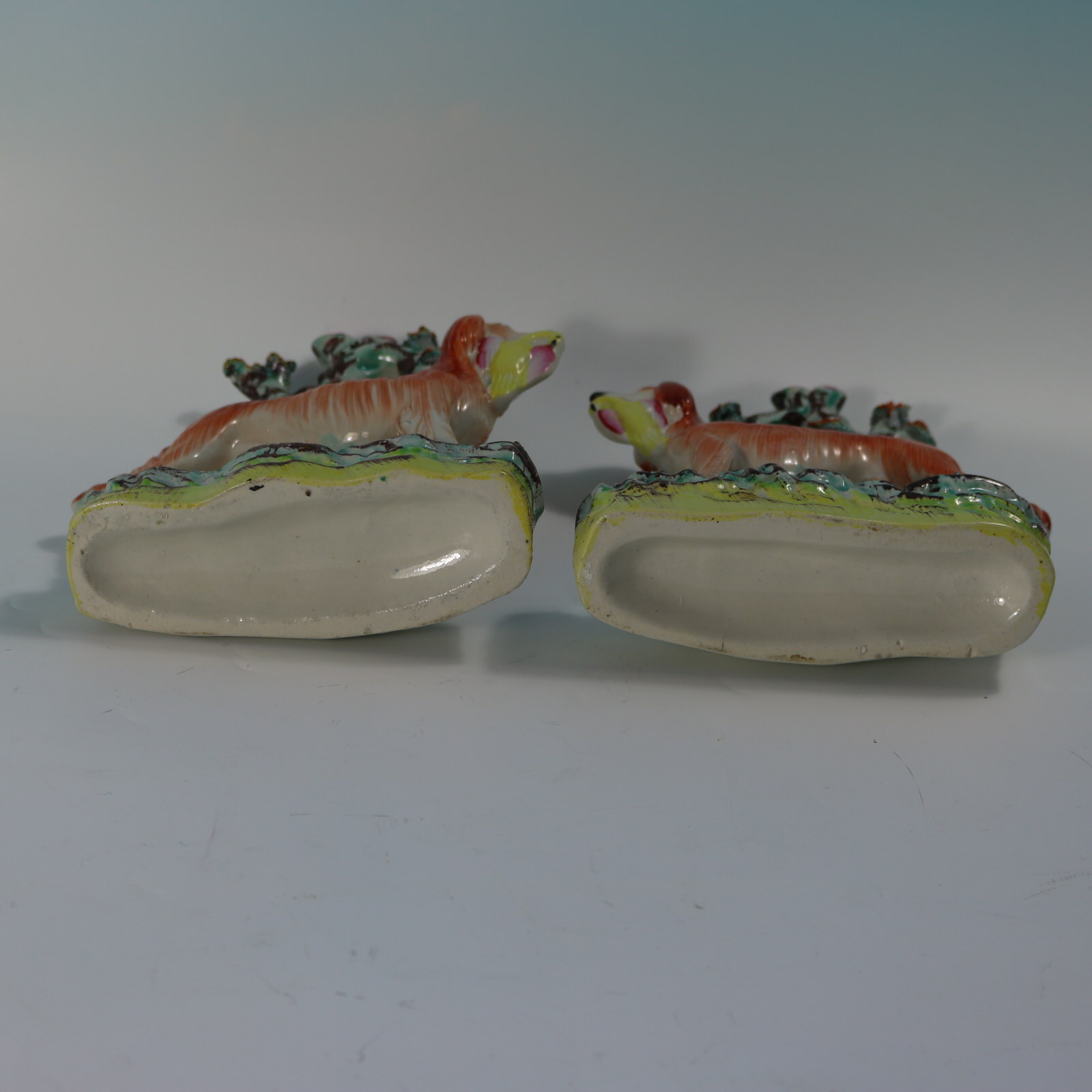Victorian, circa 1860. Tallest is 7.9ins high, 5.9ins wide, 2.2ins depth. Pair of Staffordshire Pottery figures with a hunting theme which feature a setter holding a game bird in it's mouth.