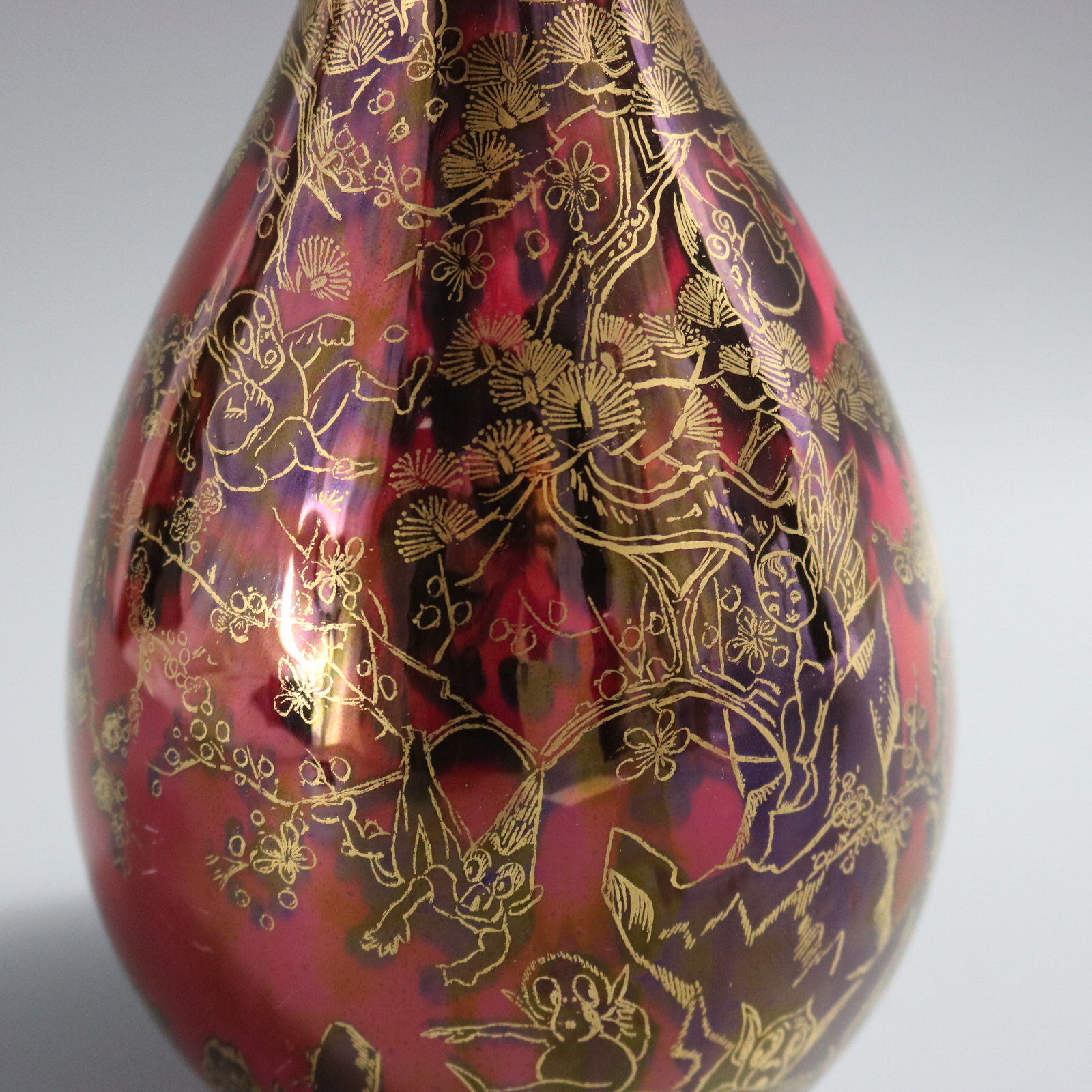 Circa 1920. 8.9ins high, 4.5ins wide, 4.5ins deep. Wedgwood Fairyland Lustre vase. The vase is decorated in the Firbolgs IV pattern, which features comical, accident-prone 'firbolgs'.