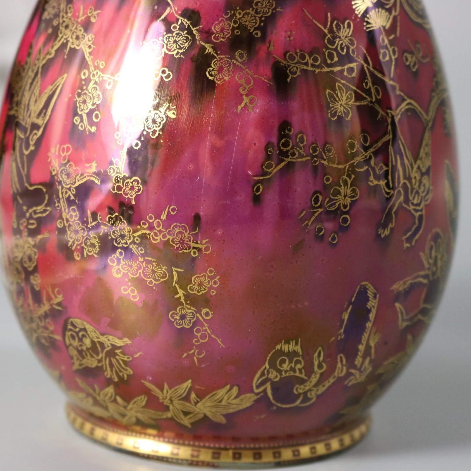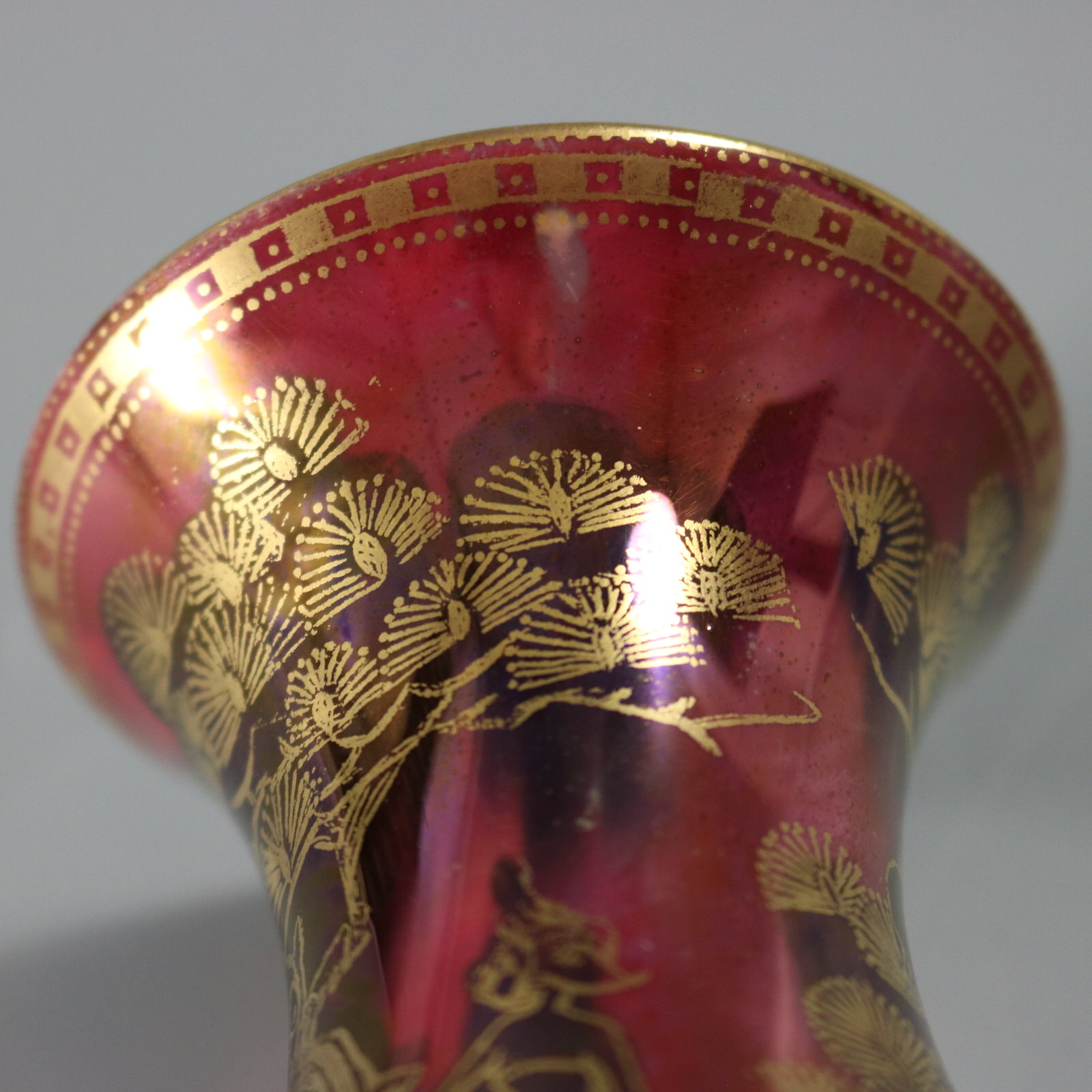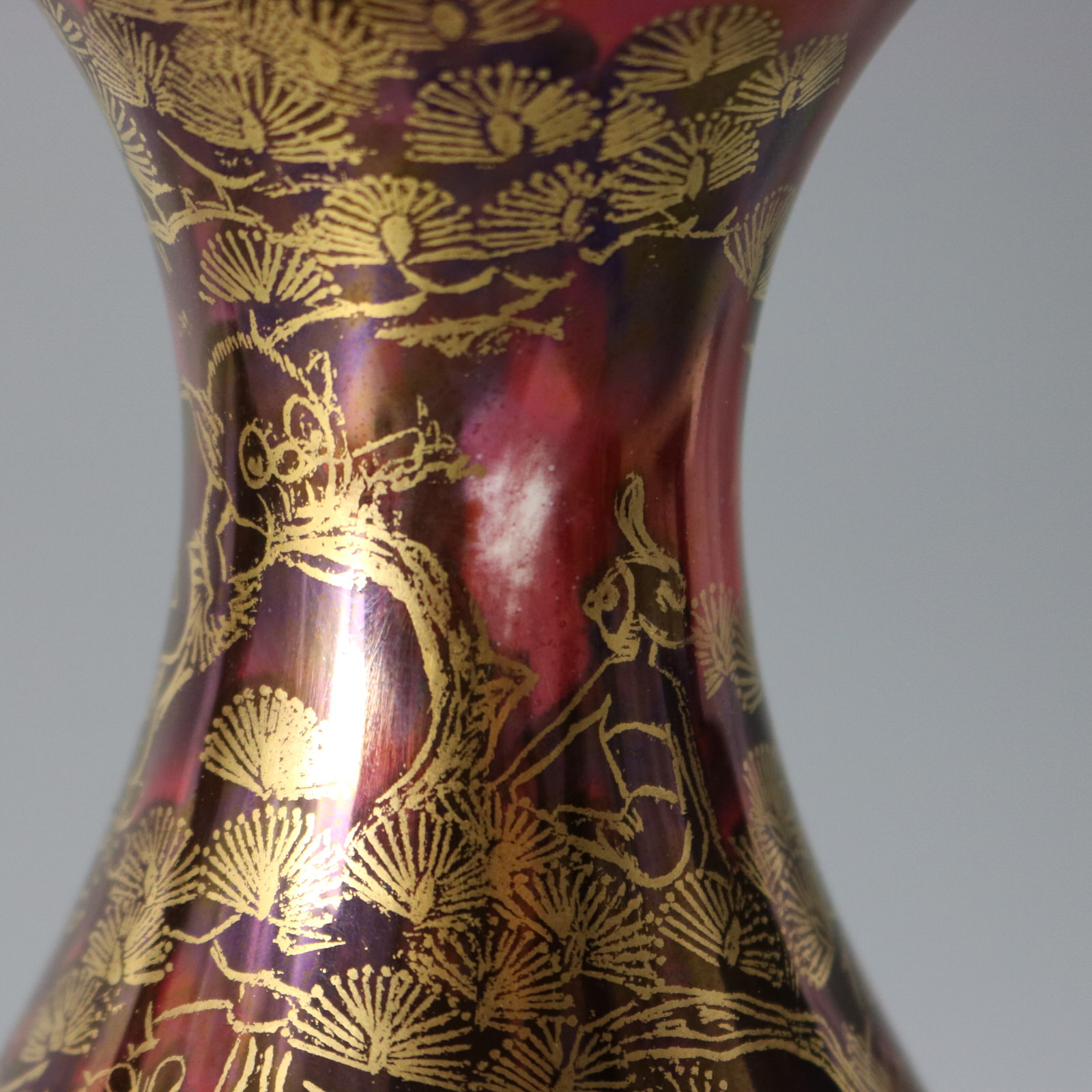 An area where the ruby ground glaze is slightly different in colour, probably from original firing.