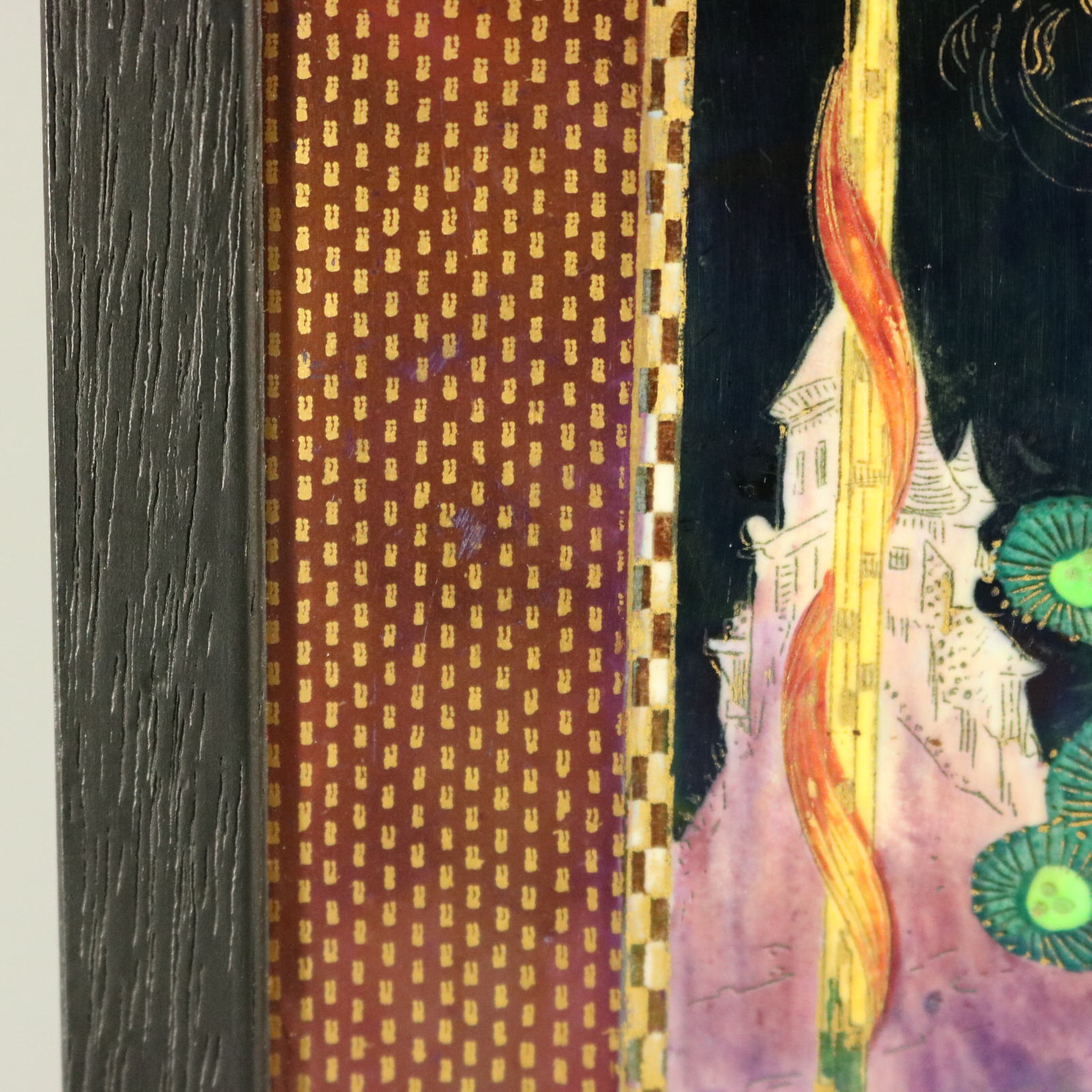 Black coloured ground. Dark pink coloured border.