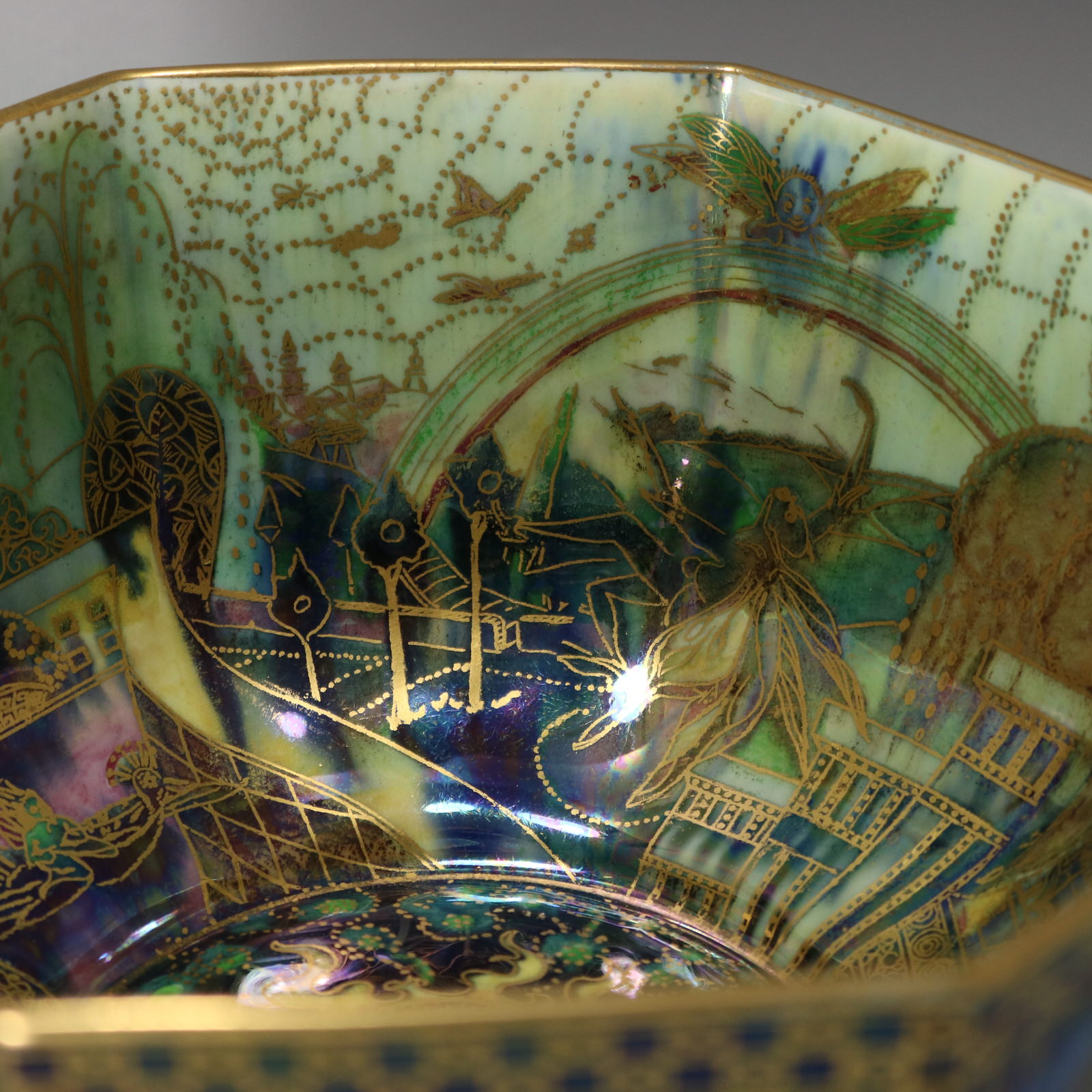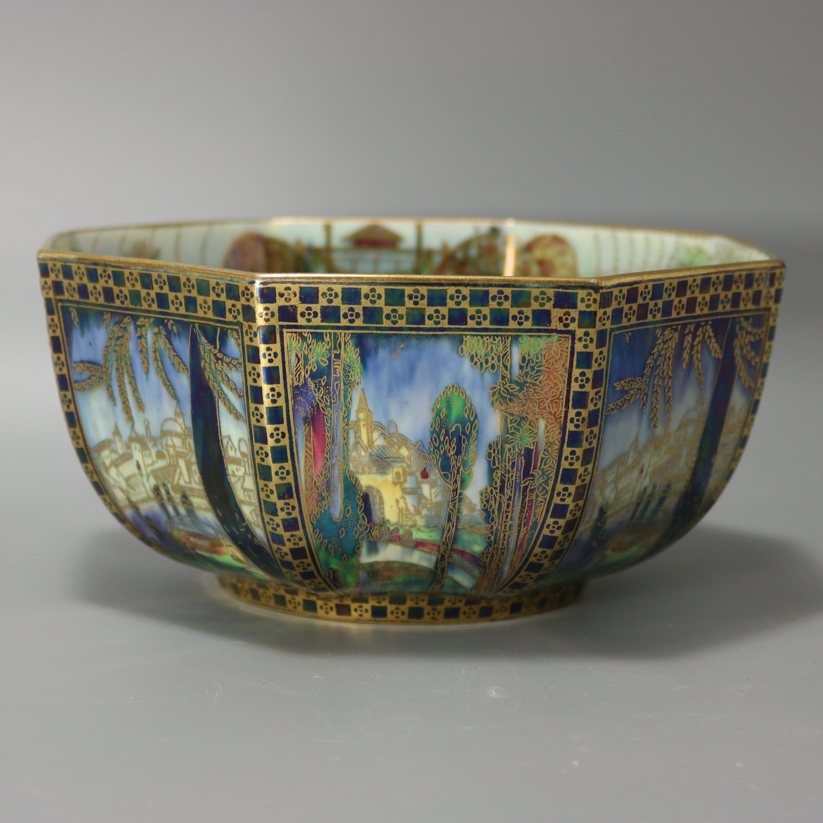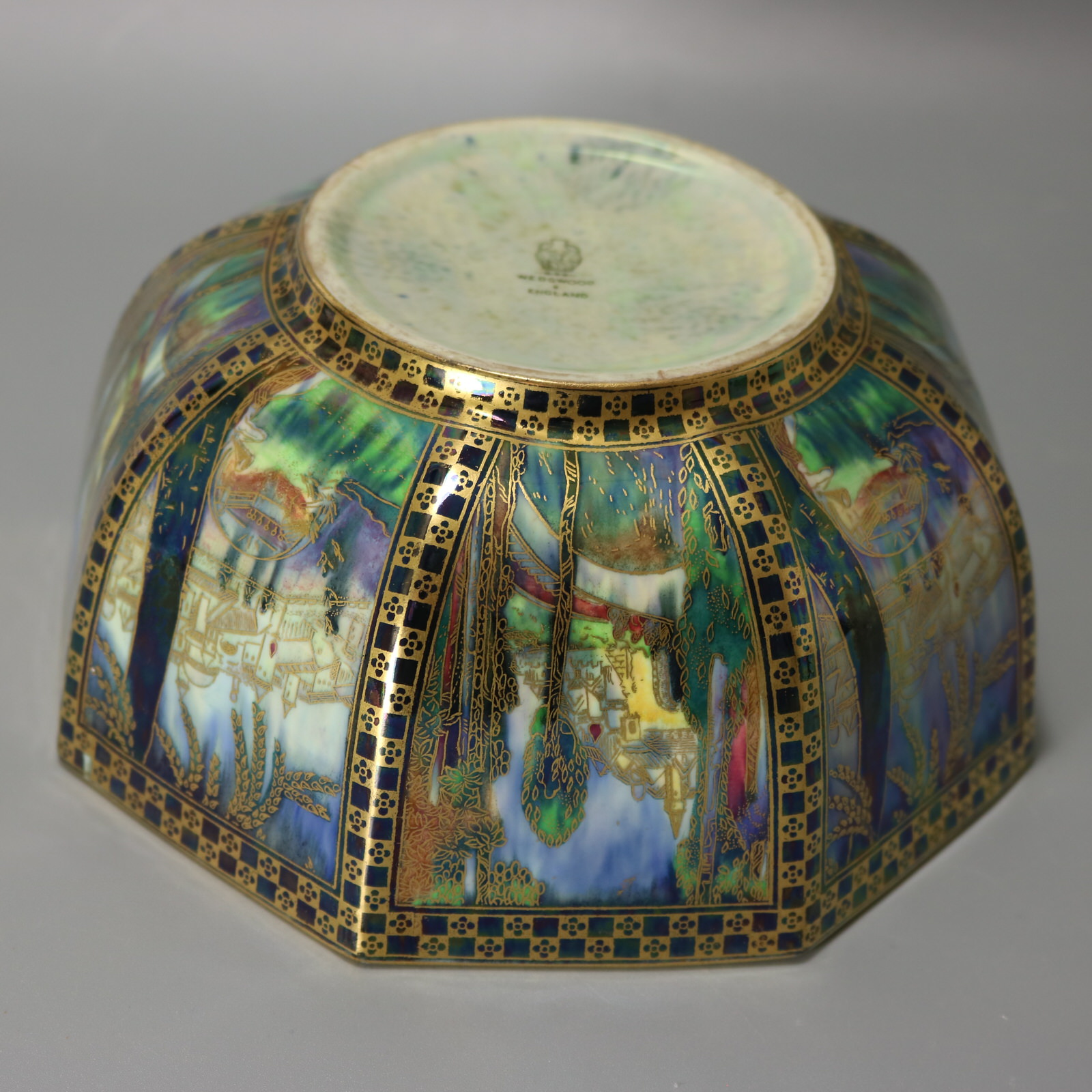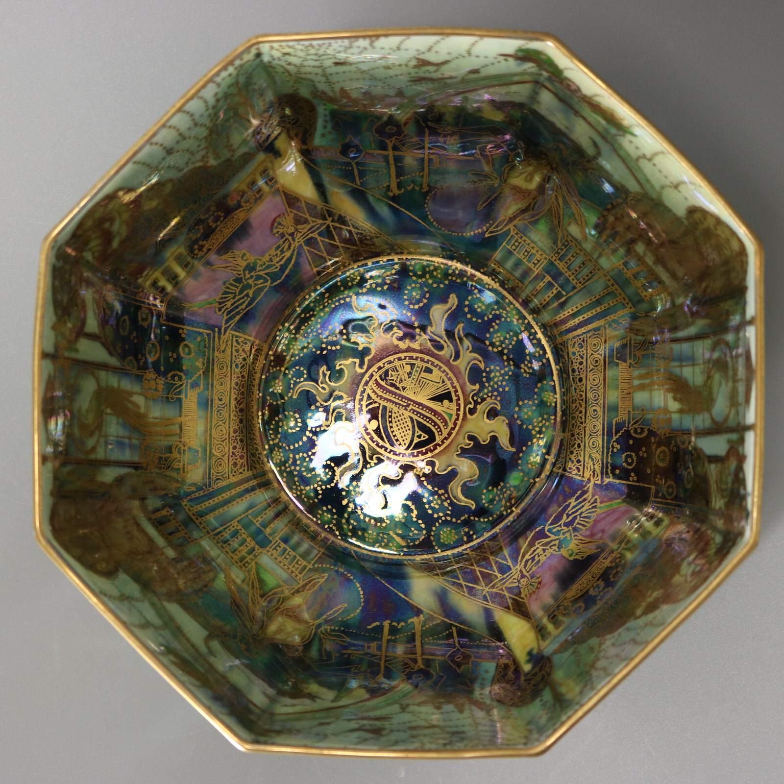 Circa 1920. 3.5ins high, 7.6ins wide, 7.6ins deep. Wedgwood Fairyland lustre octagonal bowl. Dana - Castle on a Road pattern to exterior panels with Trentham Bead borders on black ground.