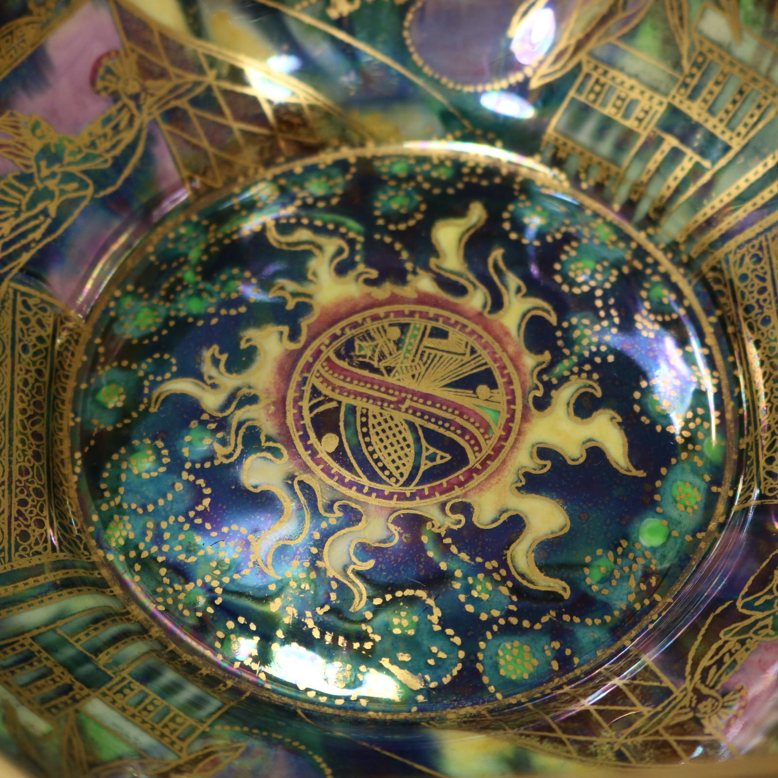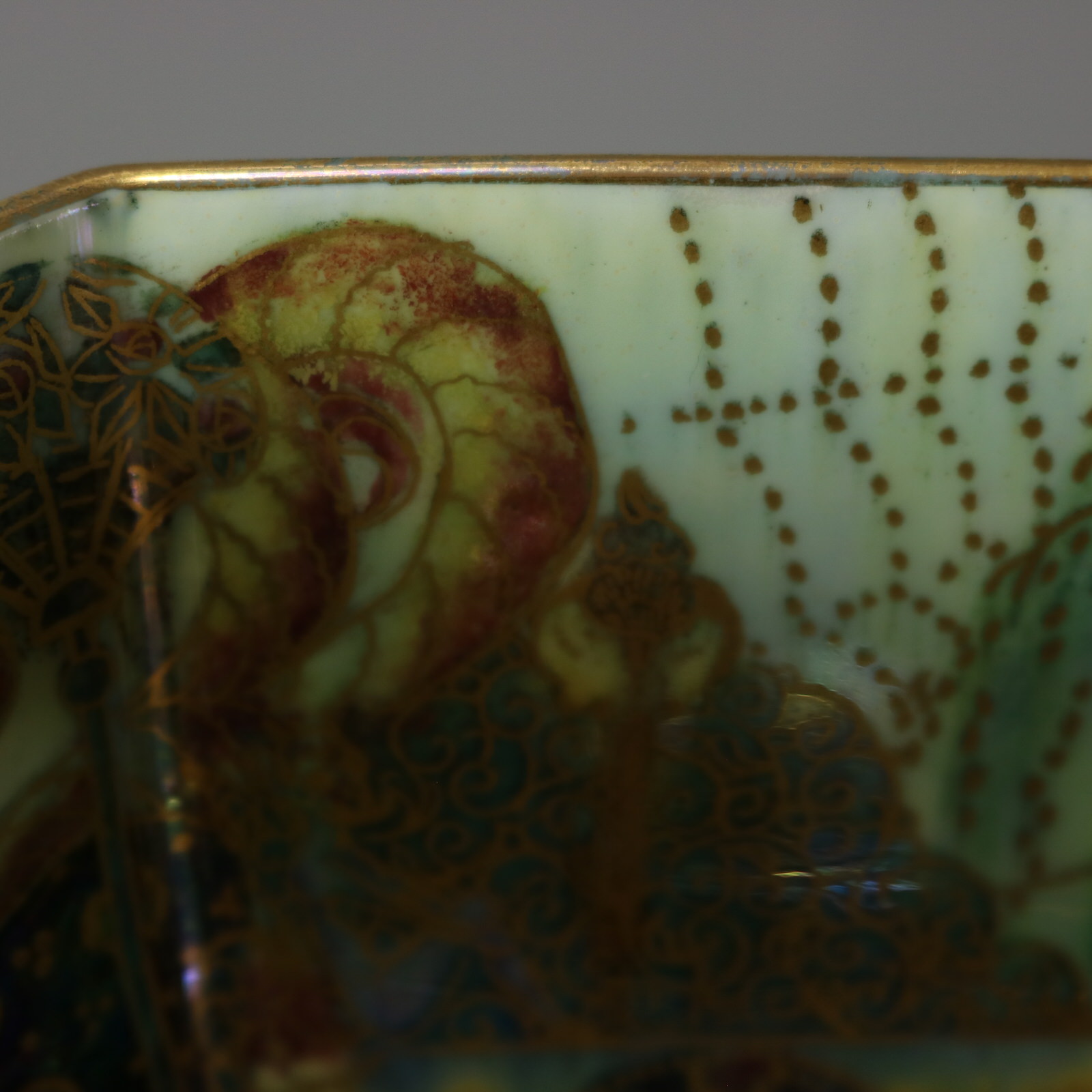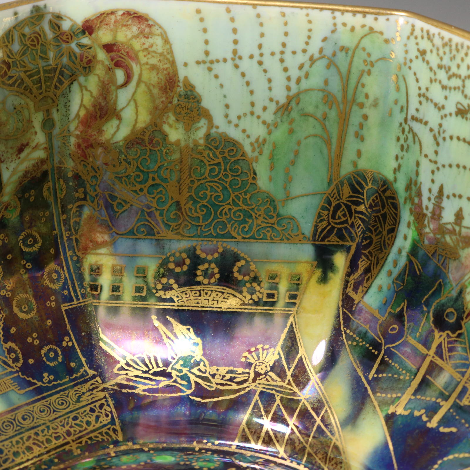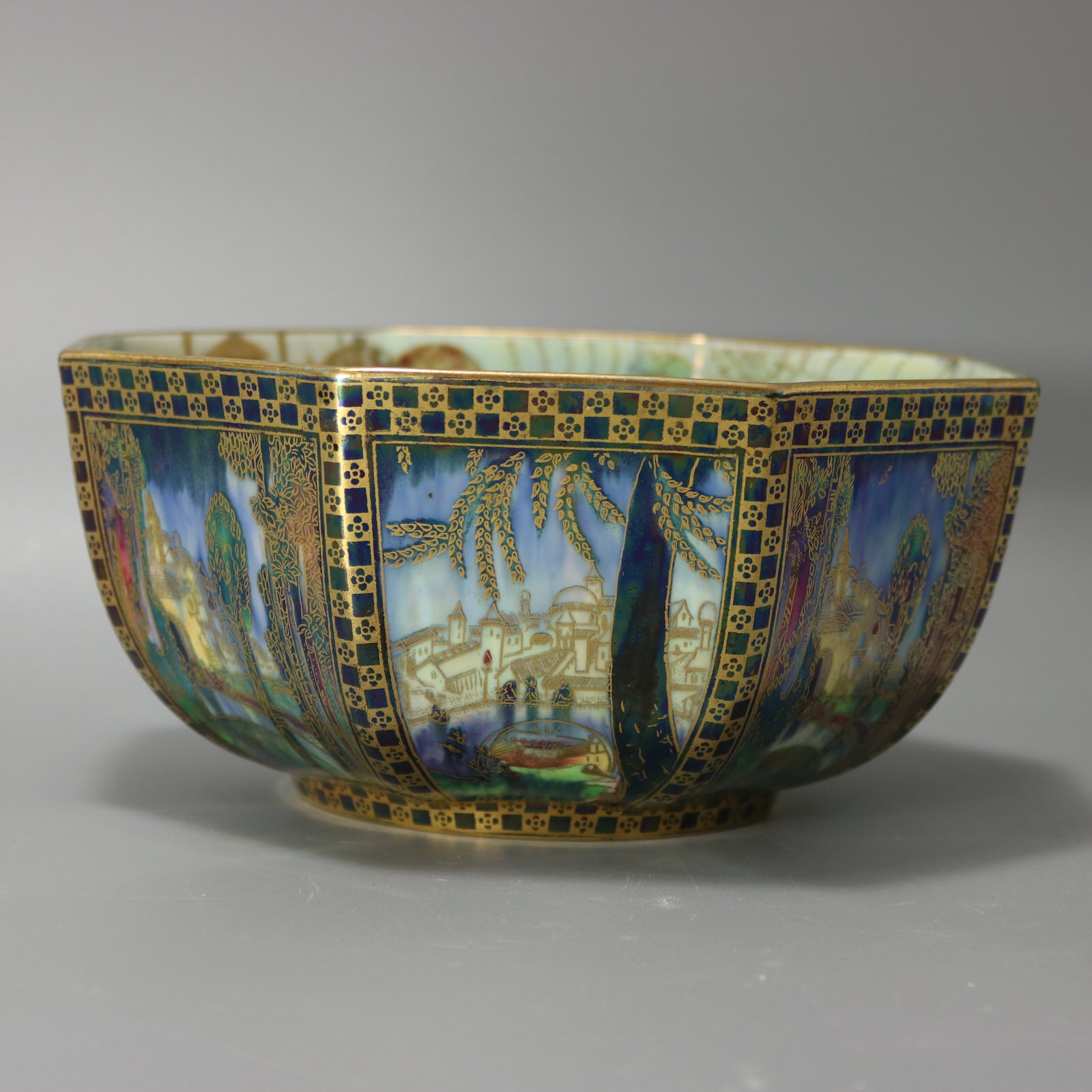 Circa 1920. 3.5ins high, 7.6ins wide, 7.6ins deep. Wedgwood Fairyland lustre octagonal bowl. Dana - Castle on a Road pattern to exterior panels with Trentham Bead borders on black ground.