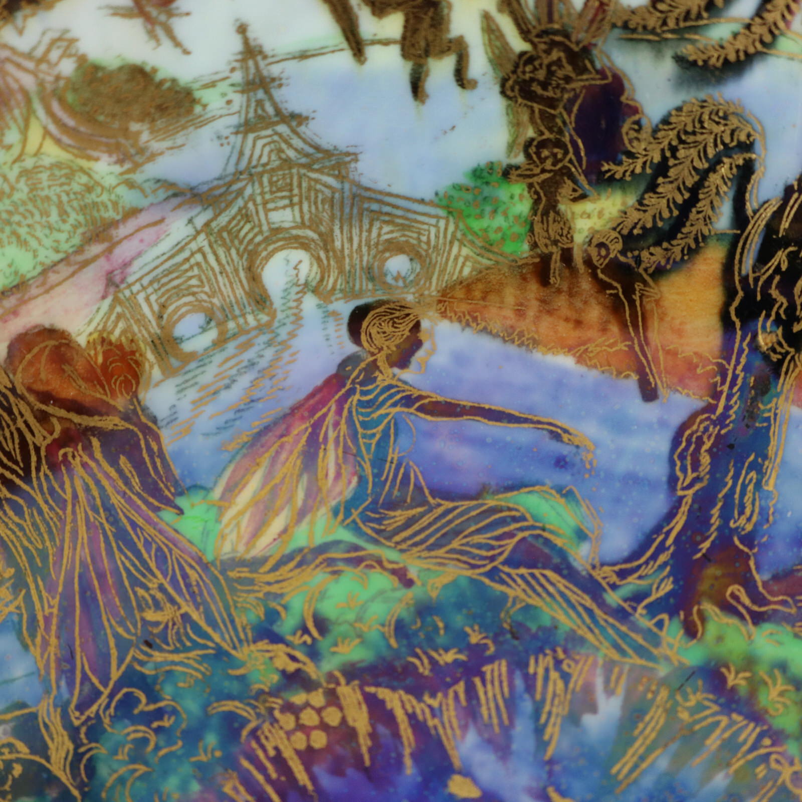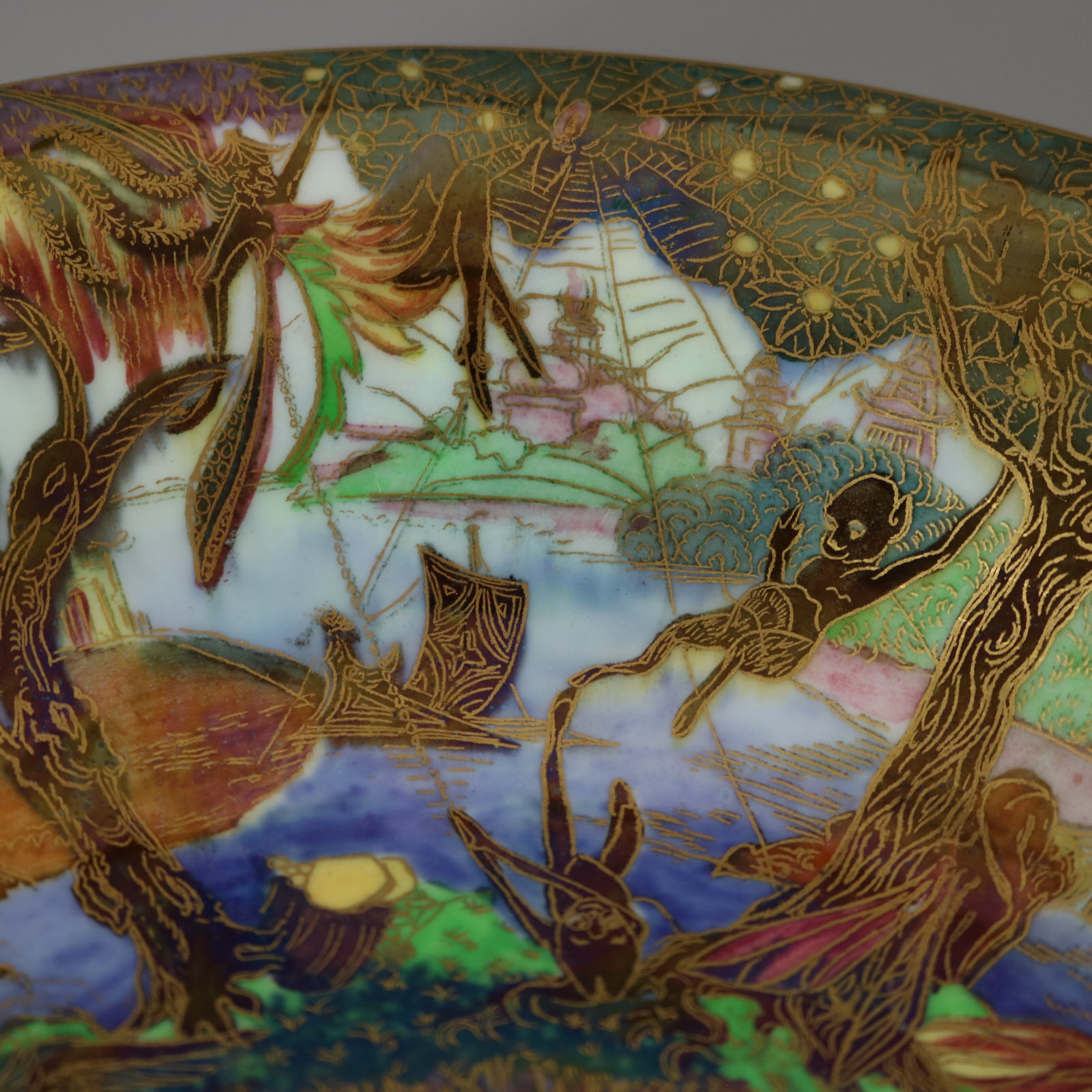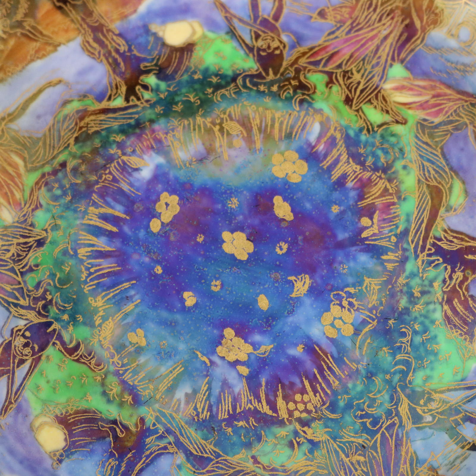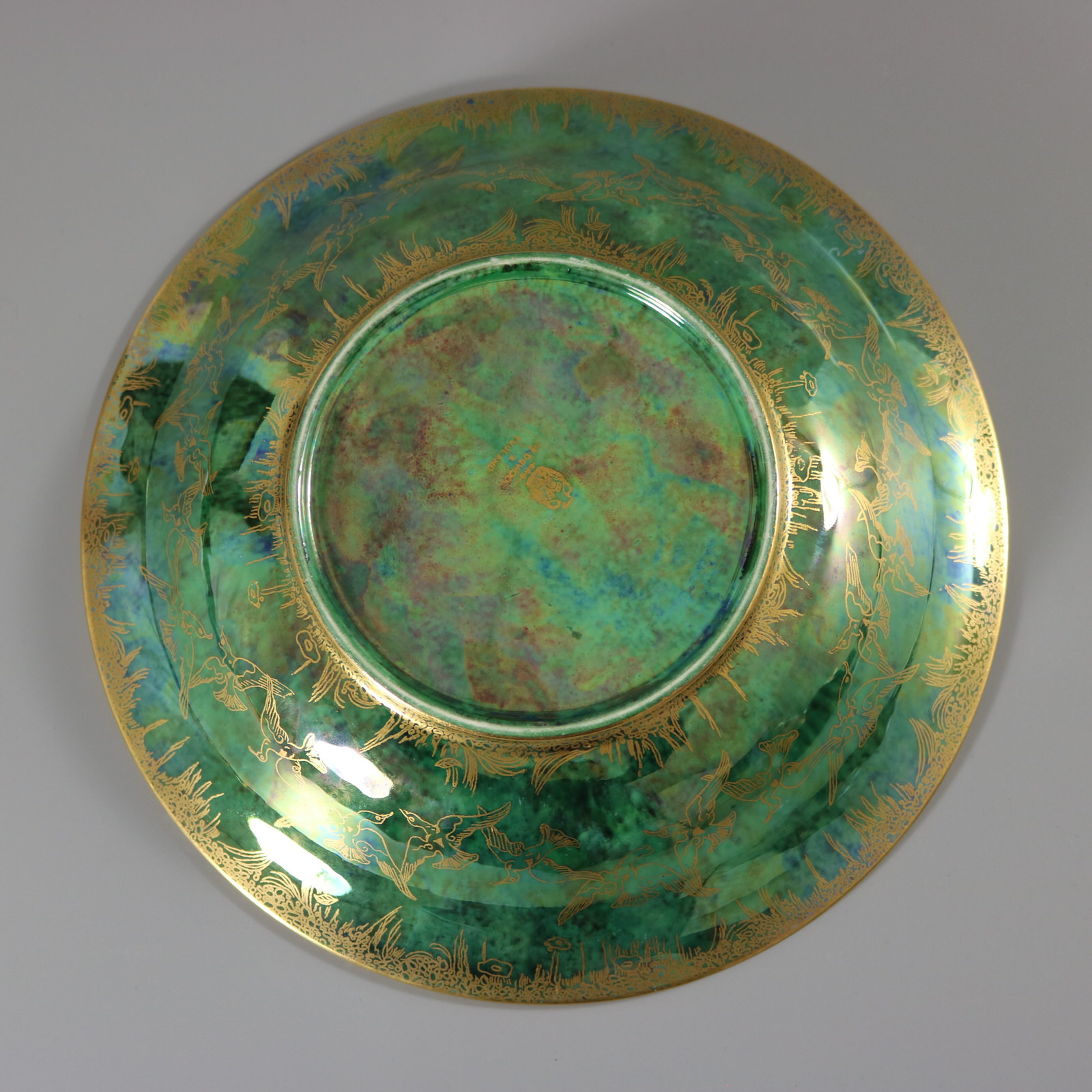 Circa 1920. 1.8ins high, 9.1ins diameter. Wedgwood Fairyland Lustre Lily Tray, shape number 2483. Decorated with 'Jumping Faun' pattern to interior,