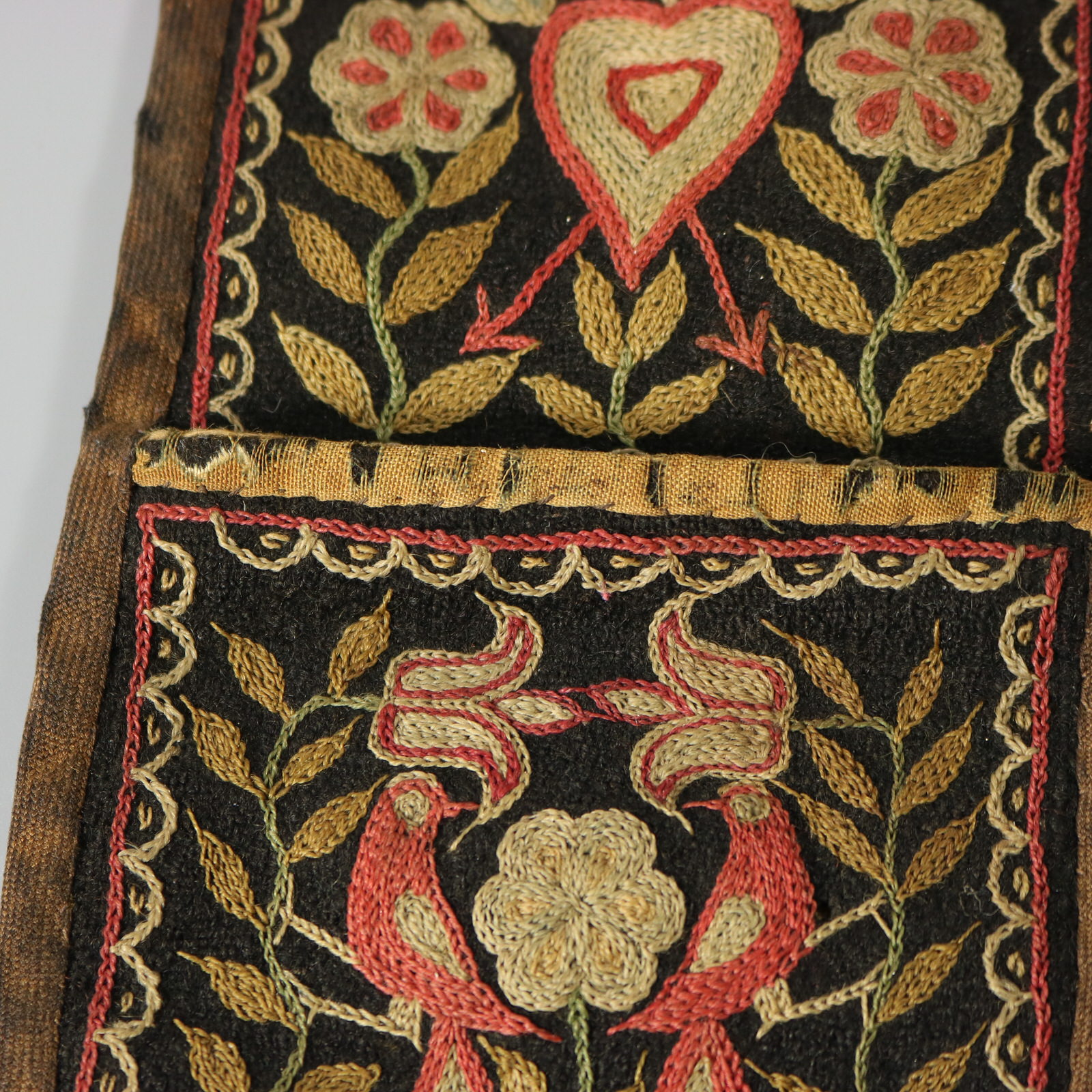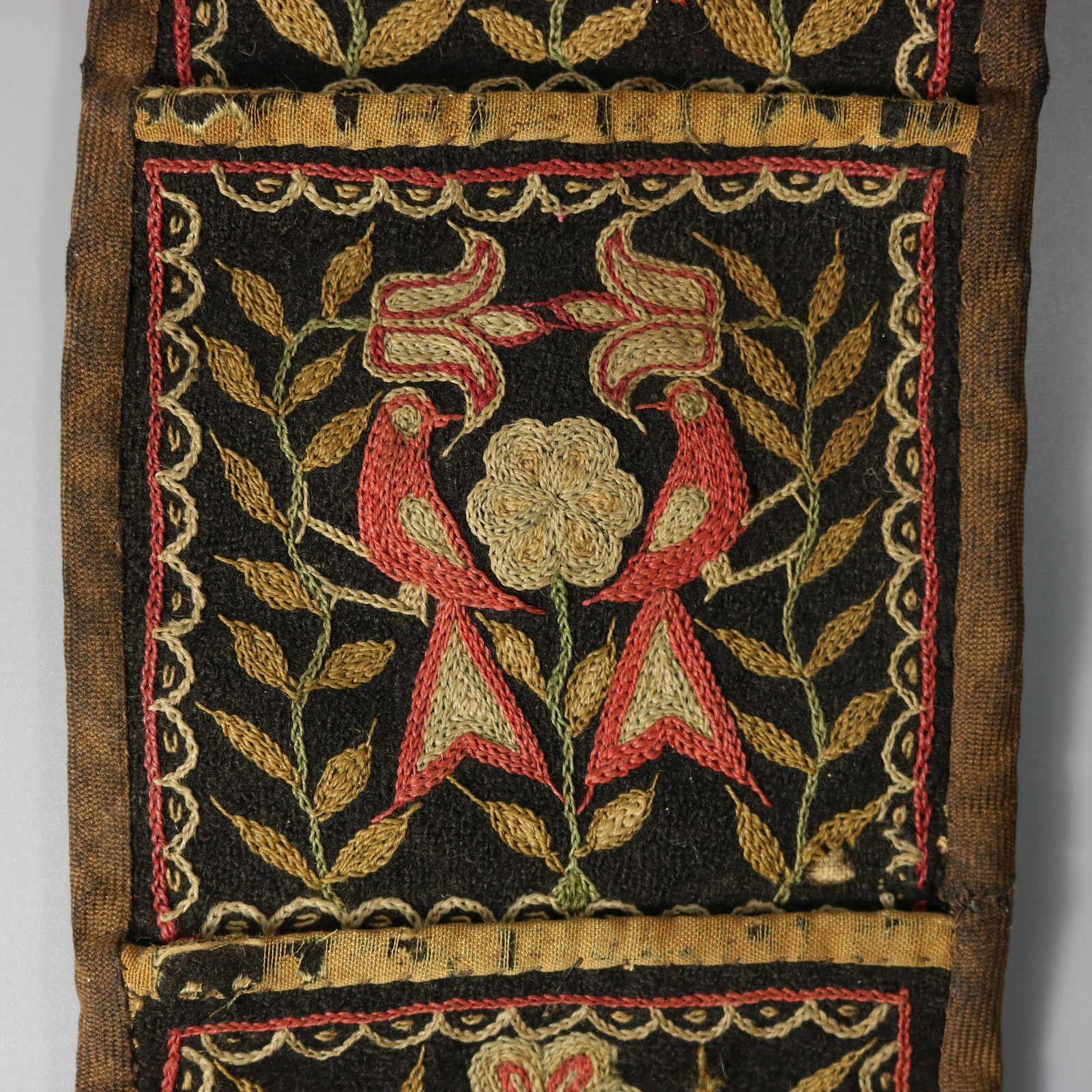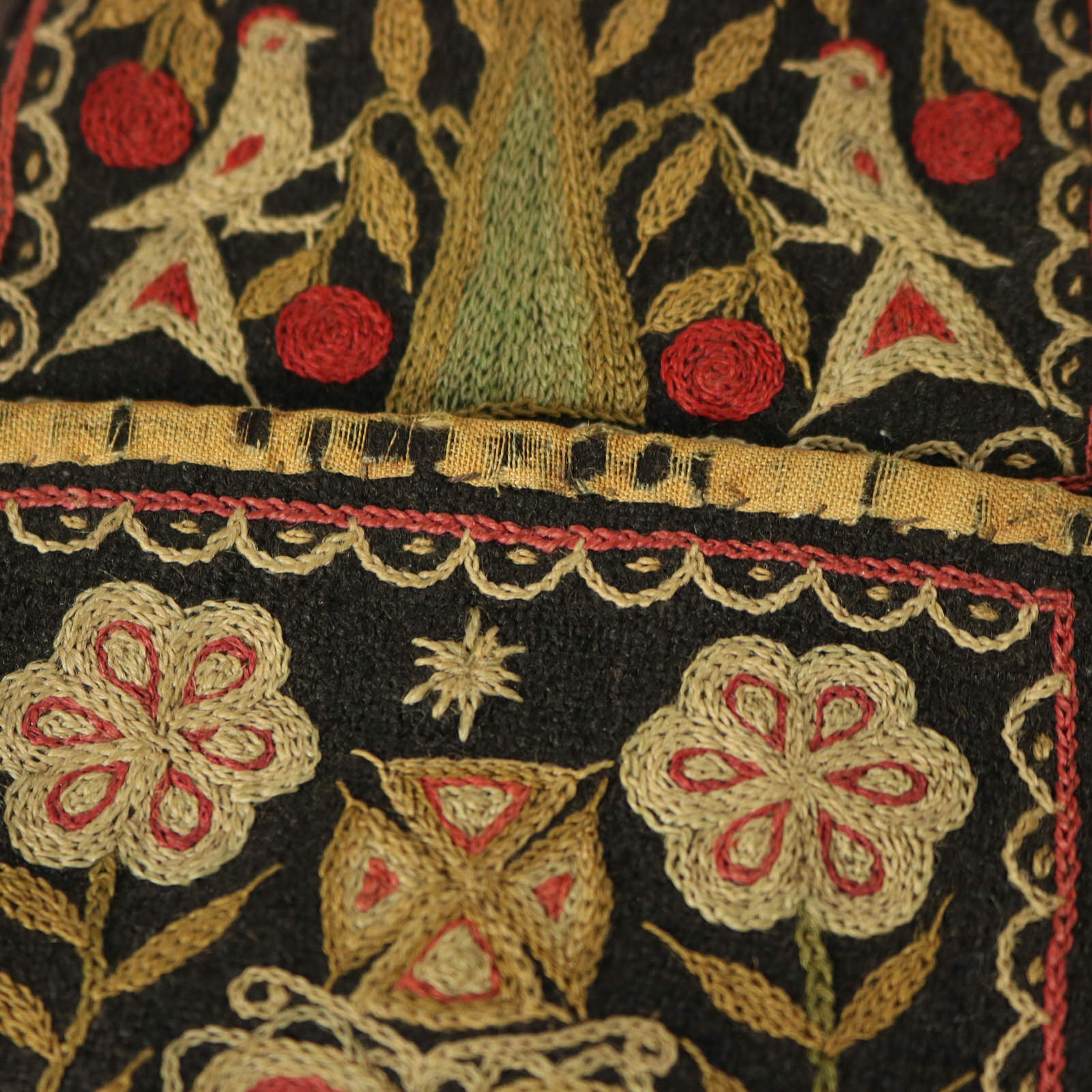 The front features five pockets, each fronted by an individual embroidered panel depicting: birds in a fruit tree;