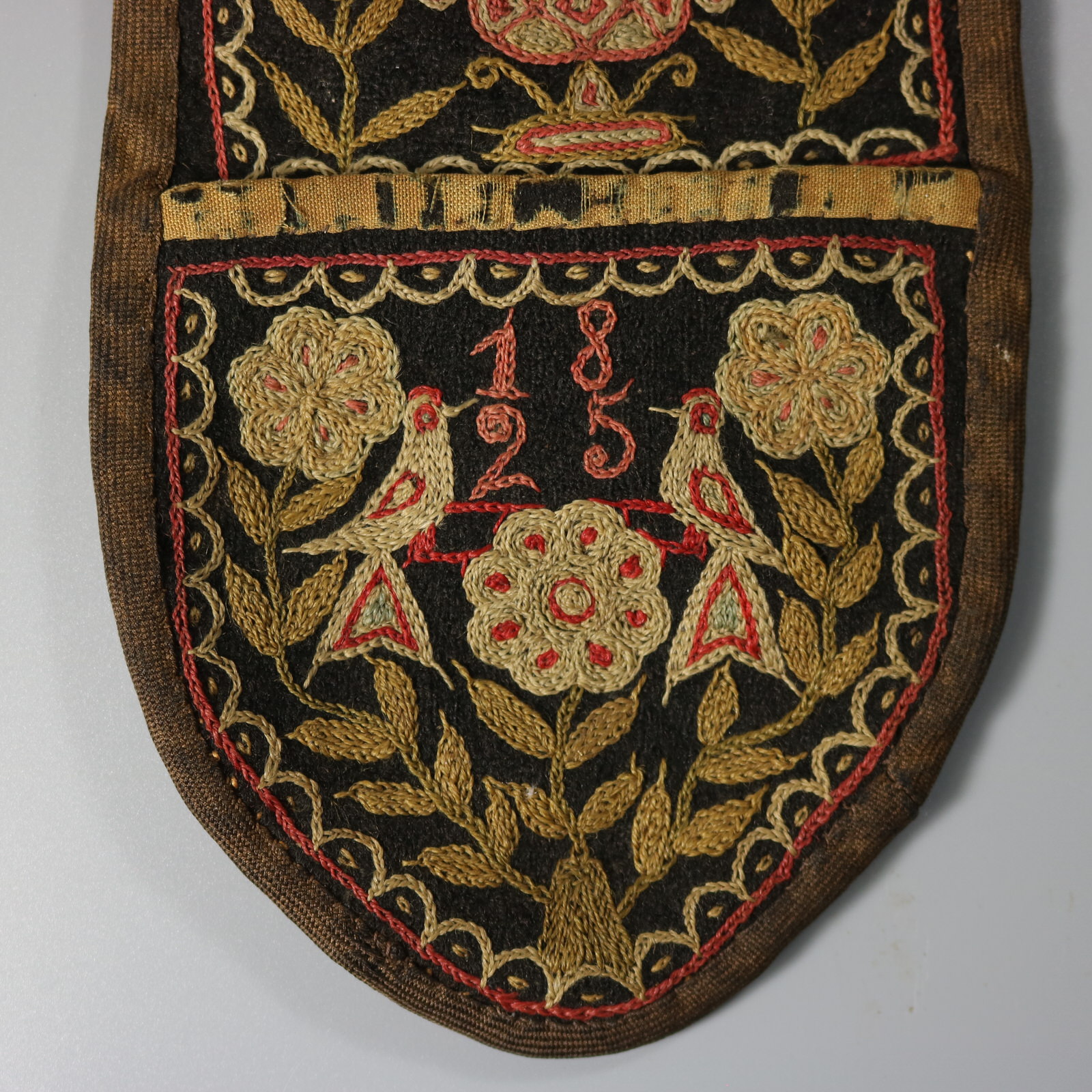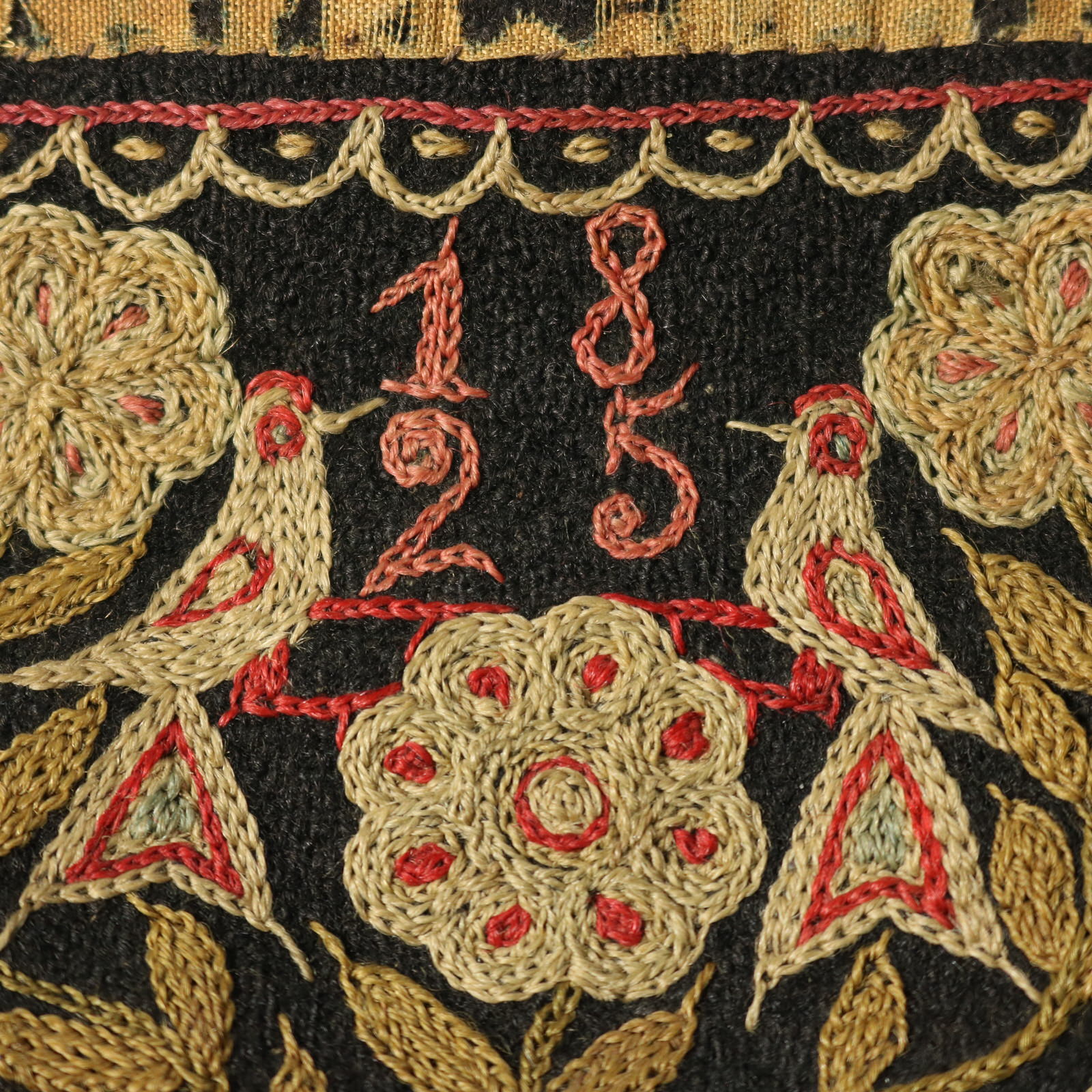 This fine example is worked in silk on linen, in a rich palette of red, gold, blue, silver, pink, black and brown.