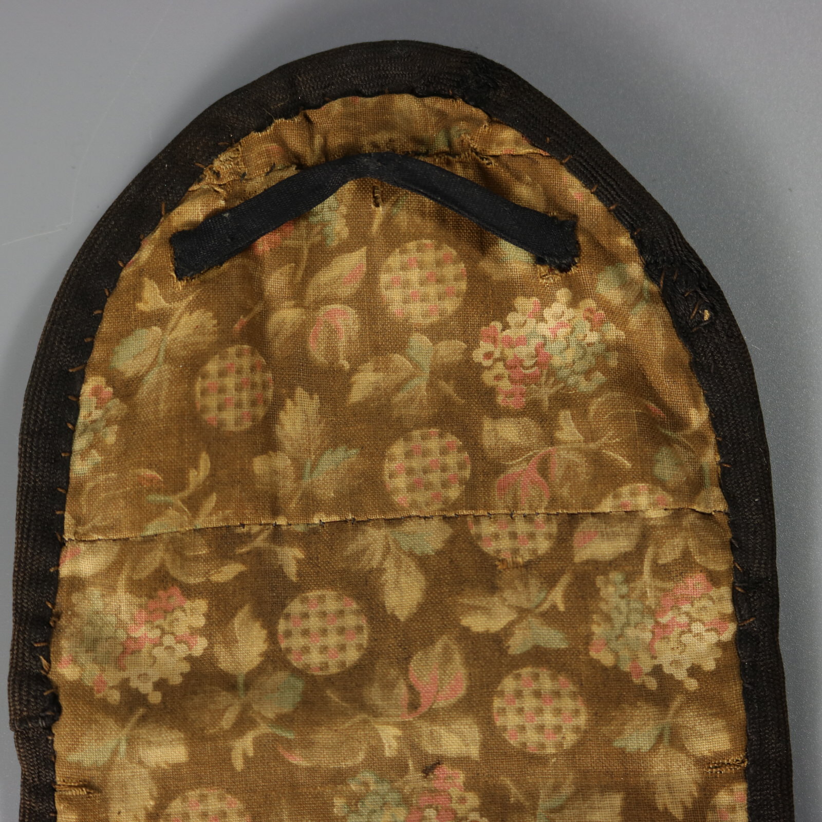 The reverse is covered in silk, finely printed with flowers, leaves and circular motifs.