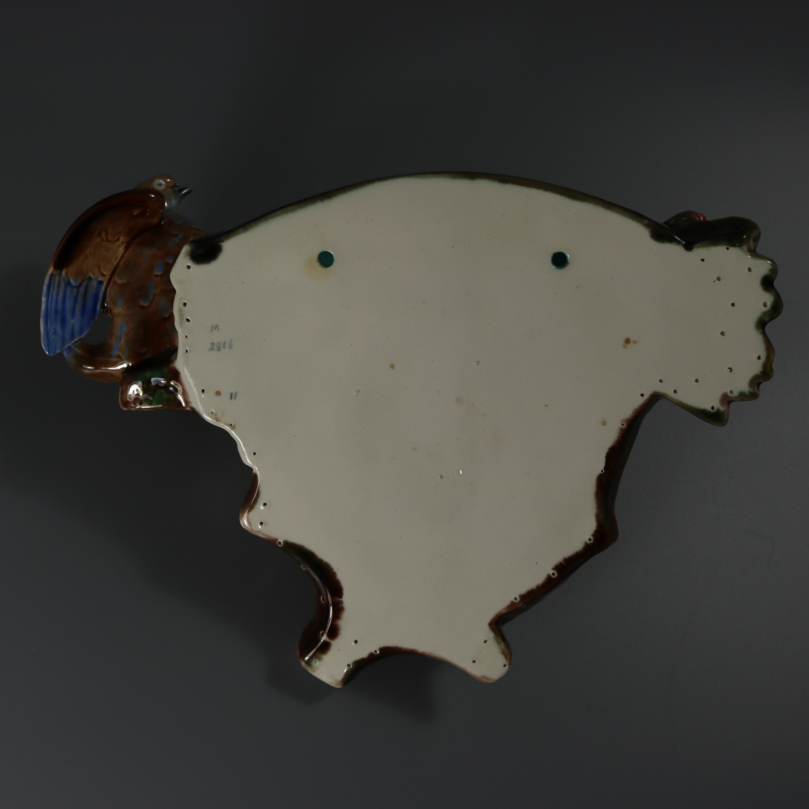 Victorian, circa 1872. 9.1ins high, 12.2ins wide, 4.3ins depth. Wedgwood Argenta Majolica wall pocket which features a bird perched on the edge of a nest amongst oak leaves and branches with acorns.