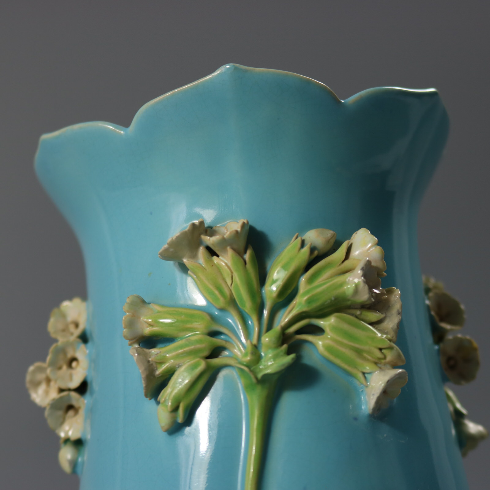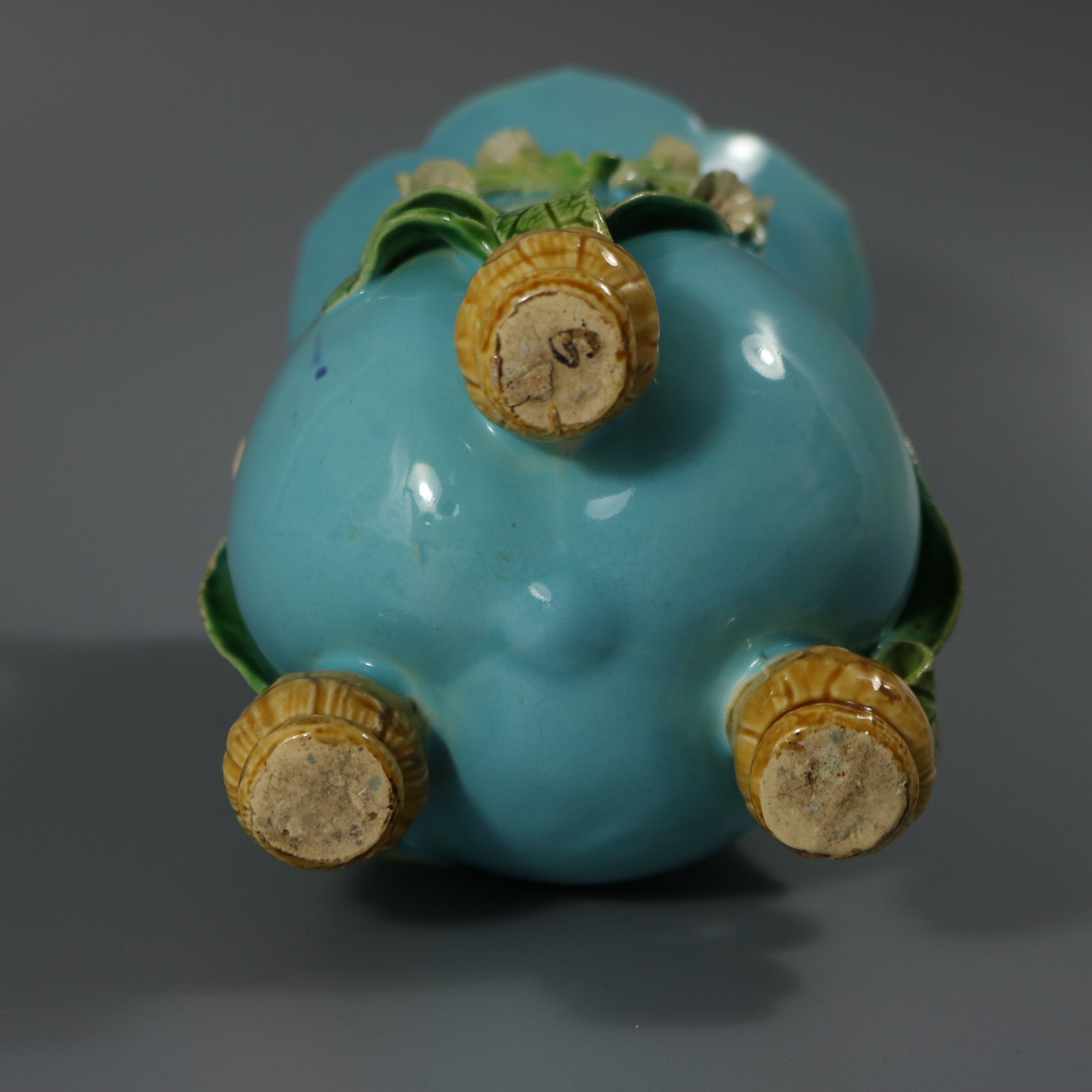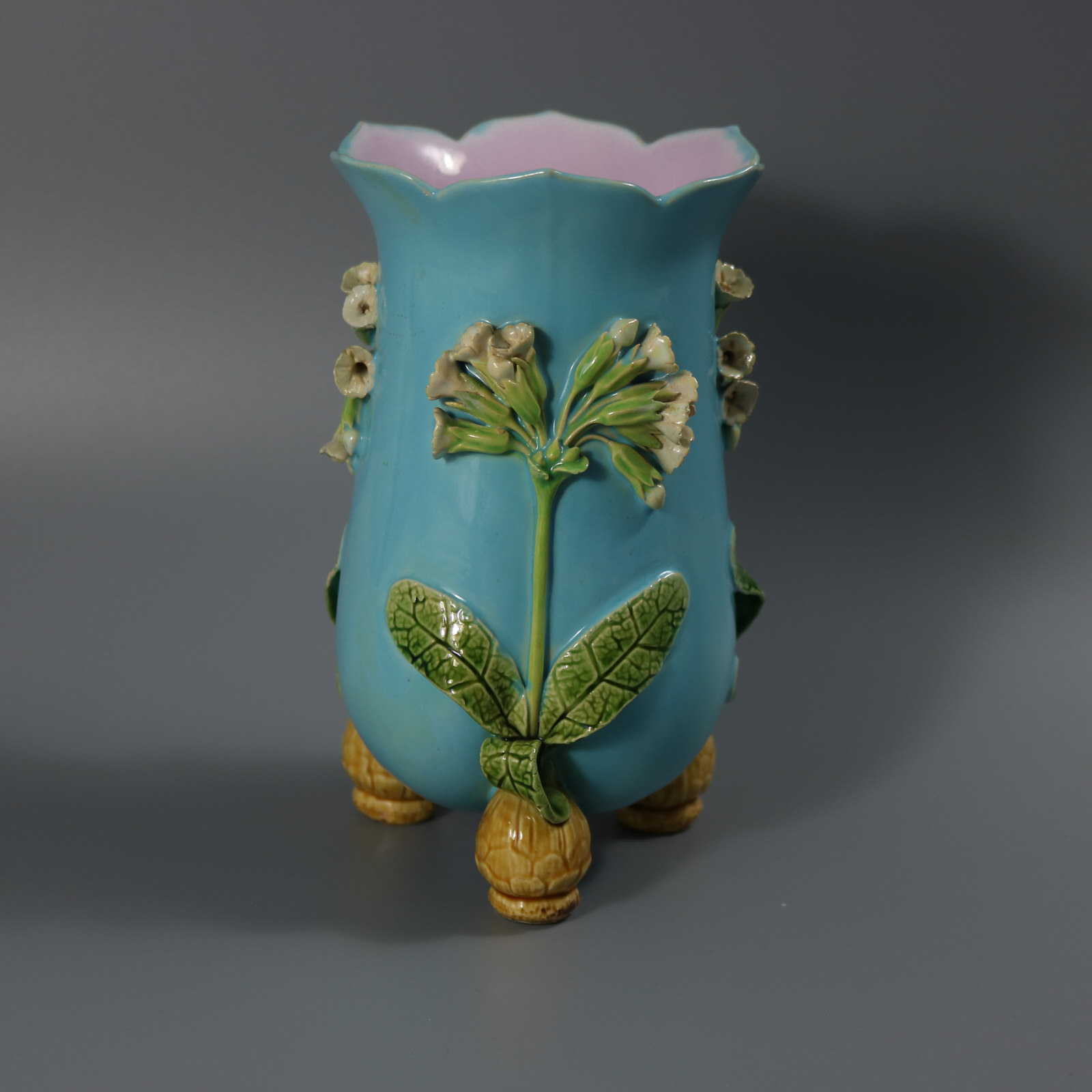 Victorian, circa 1868. 7.1ins high, 4.3ins wide, 4.3ins depth. Minton Majolica vase which features flowers and leaves sprouting from bulb feet.