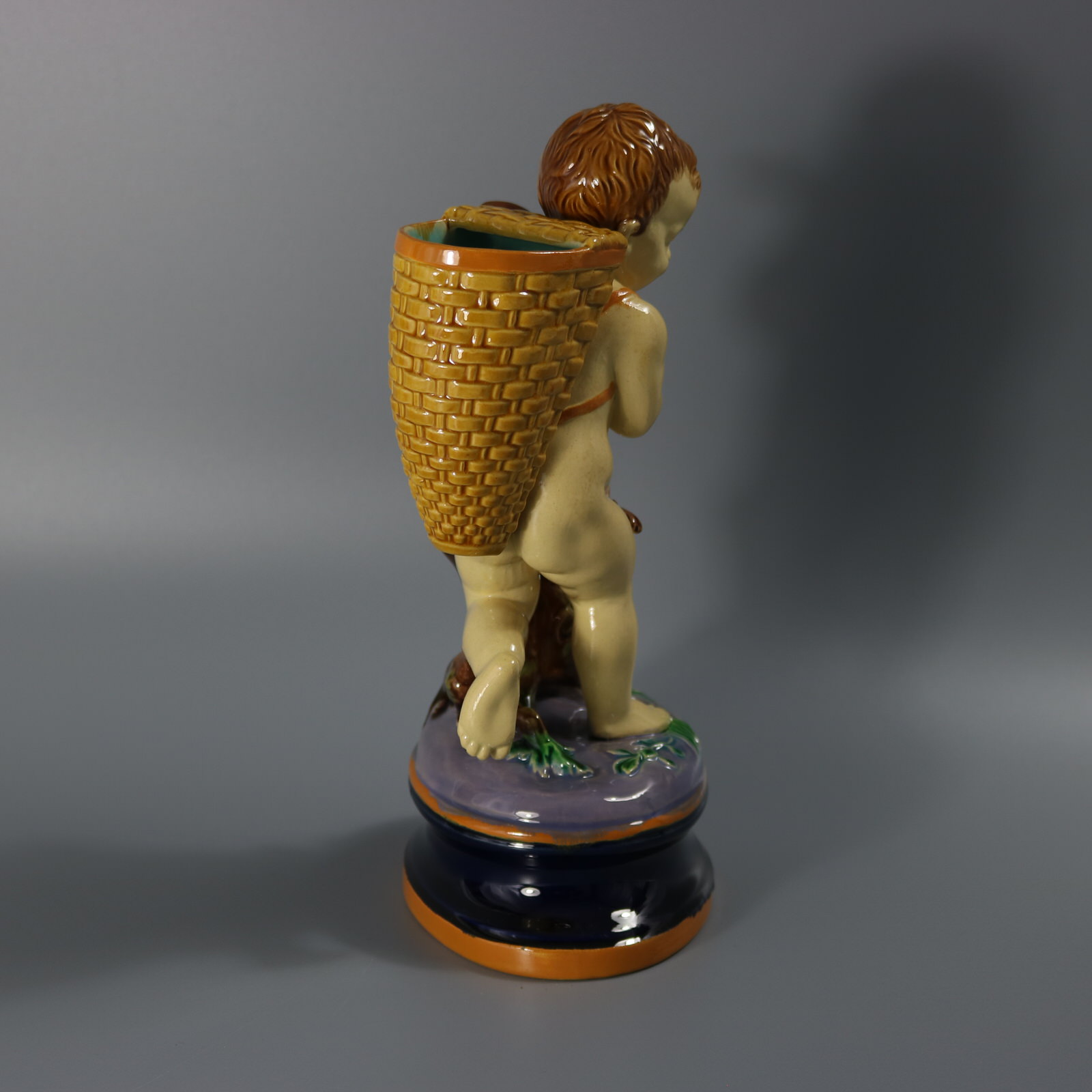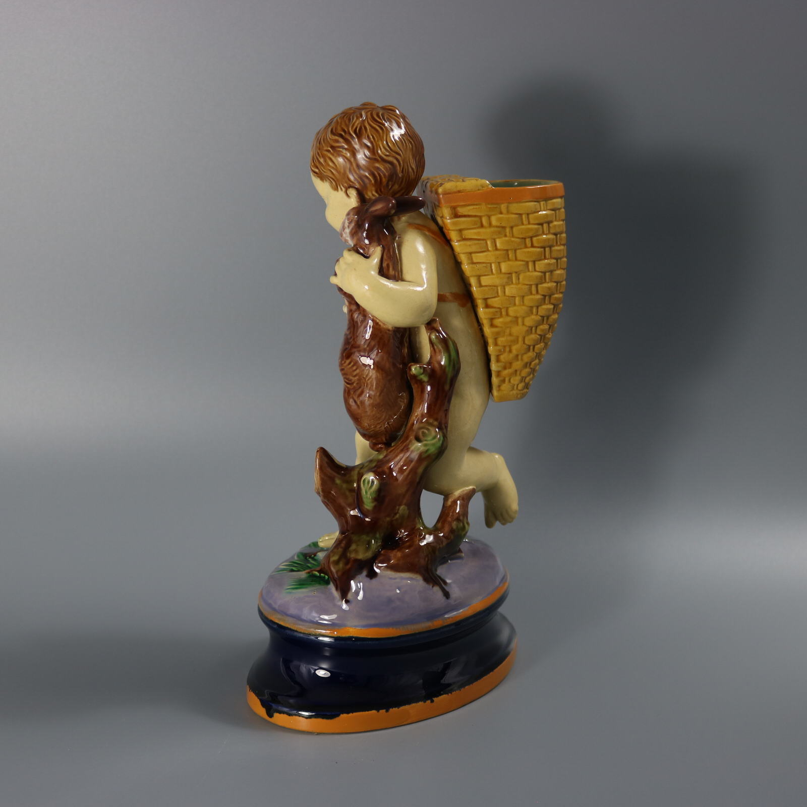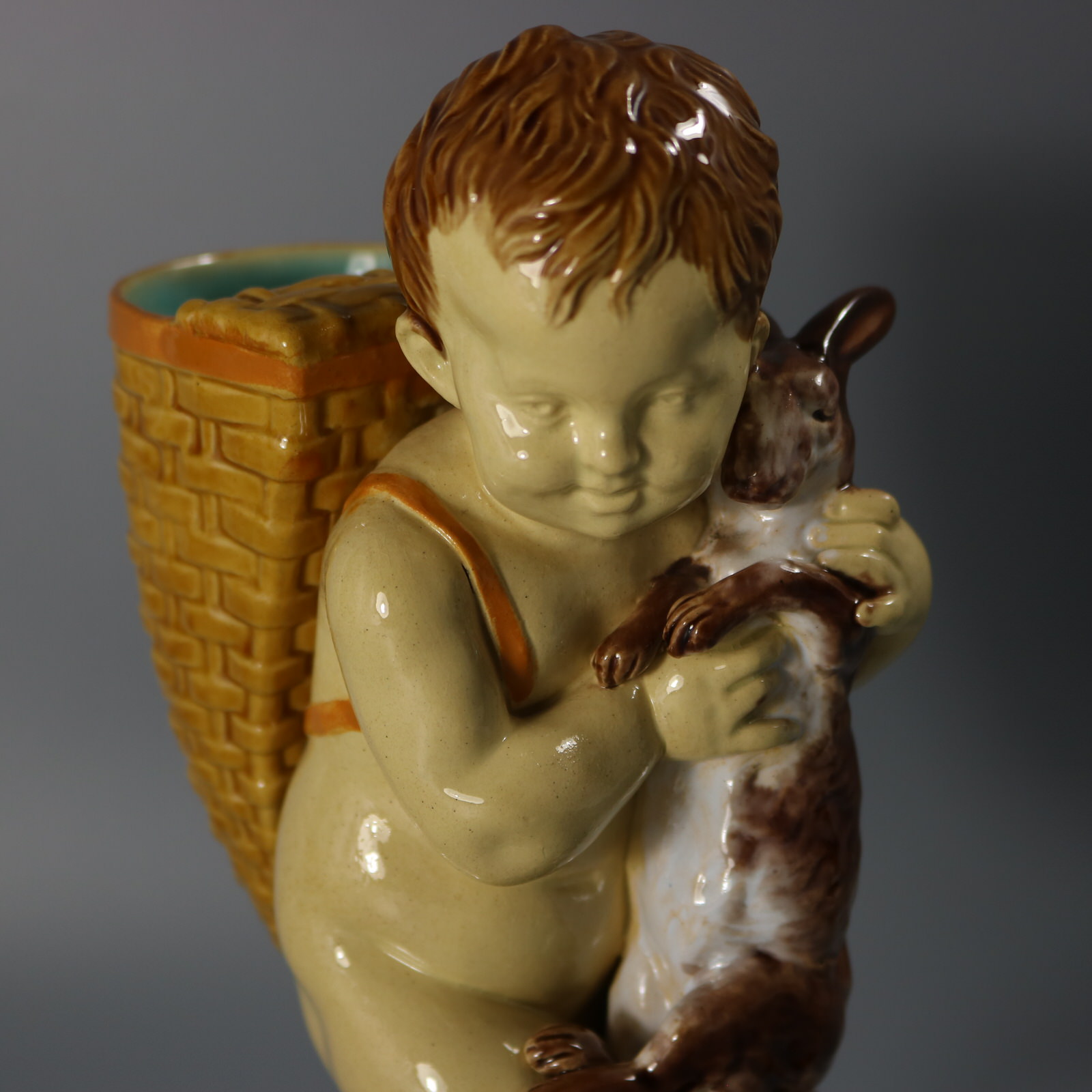 Victorian, circa 1877. 9.6ins high, 5.7ins wide, 3.8ins depth. Brownfield Majolica figural vase which features a boy carrying a basket on his back, holding a rabbit.