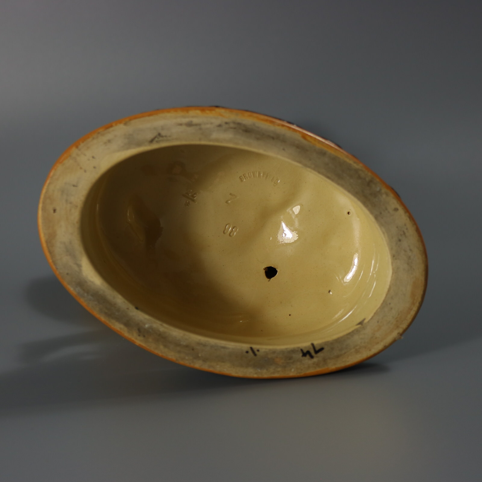 The piece bears maker's marks for the Brownfield pottery. Bears a pattern number, '86 6/77'.
