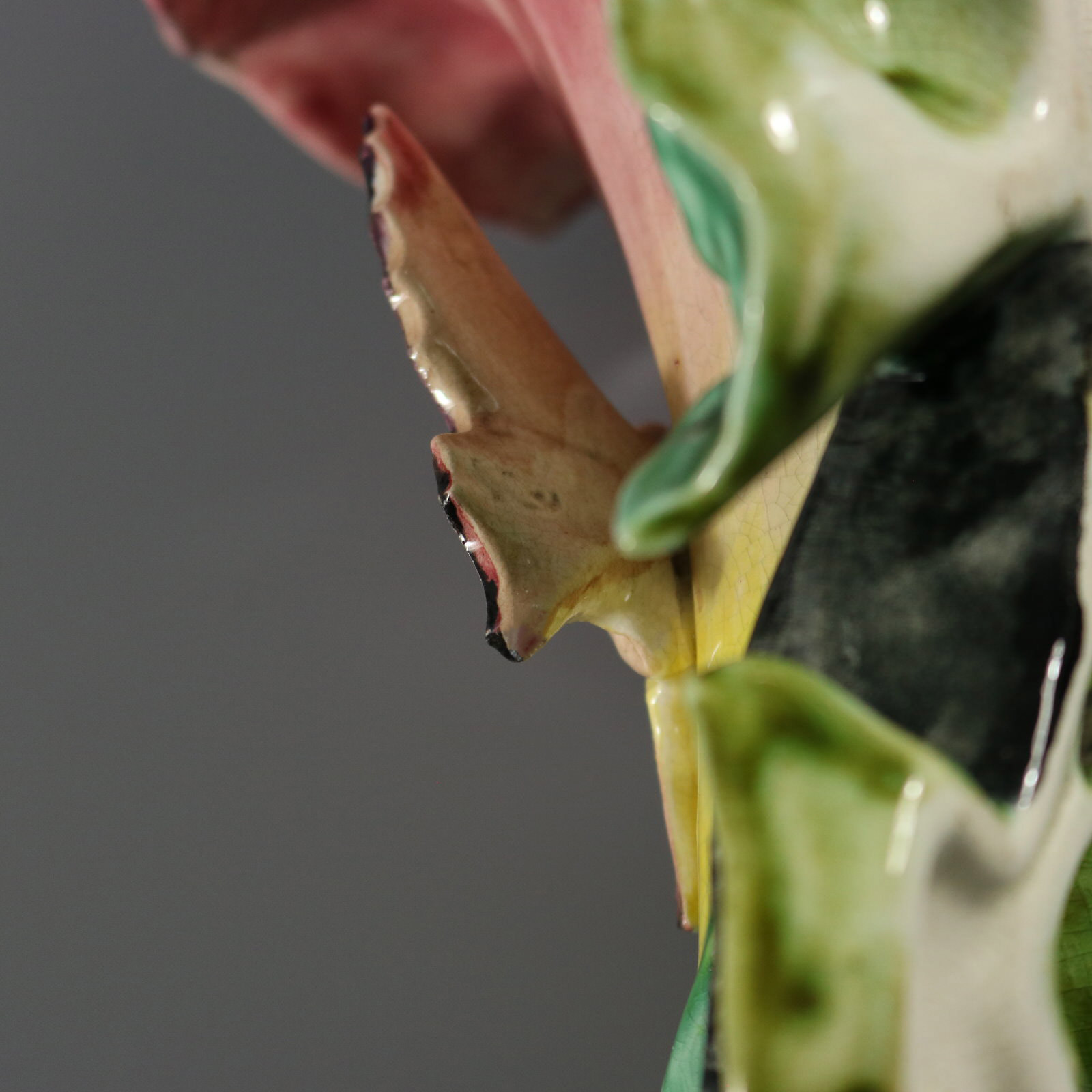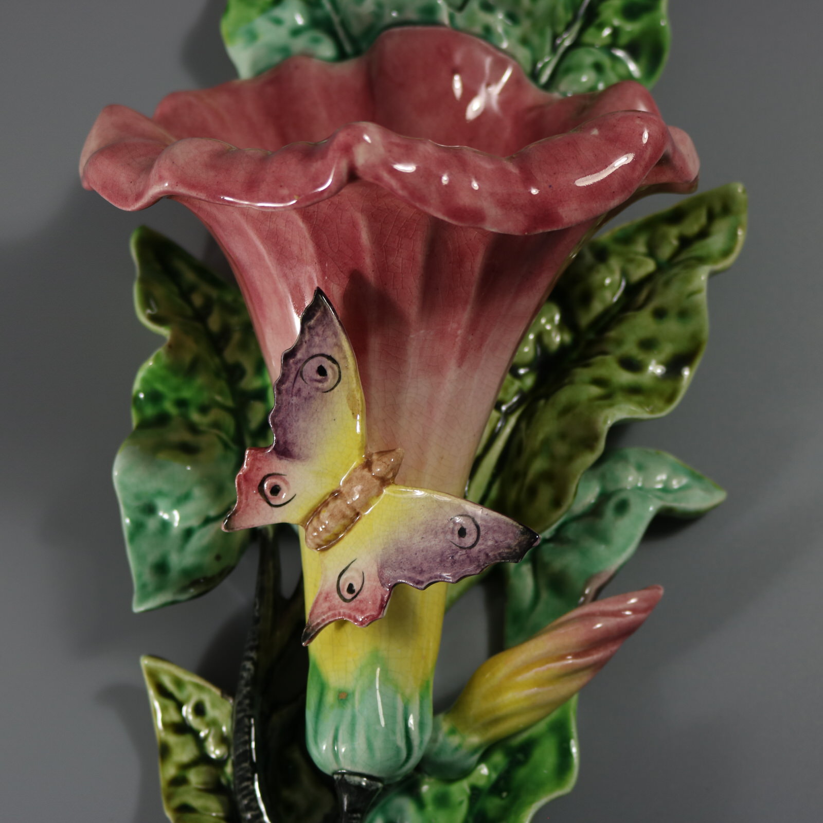 Victorian, circa 1900. Tallest is 14.2ins high, 6.9ins wide, 5.1ins depth. Pair of Fives-Lille French Majolica wall pockets which feature a tall, trumpet-shaped flower emerging from a dense ground of overlapping leaves. A butterfly sits on the flower.
