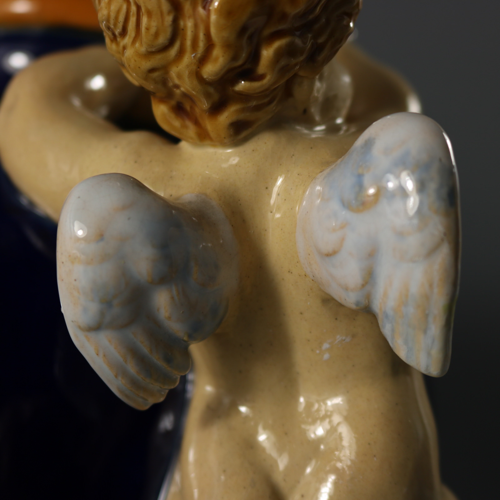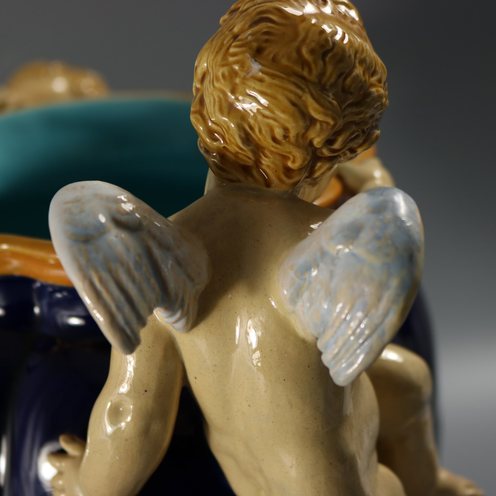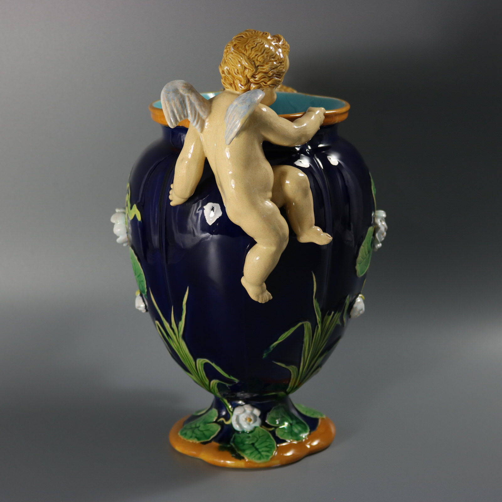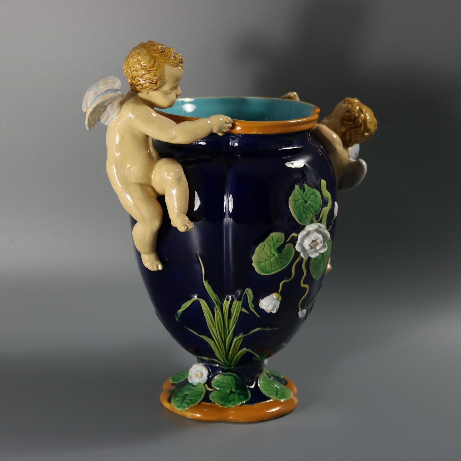 Victorian, circa 1877. 13.4ins high, 12.6ins wide, 8.3ins depth. Minton Majolica vase which features climbing cherubs and water lilies.