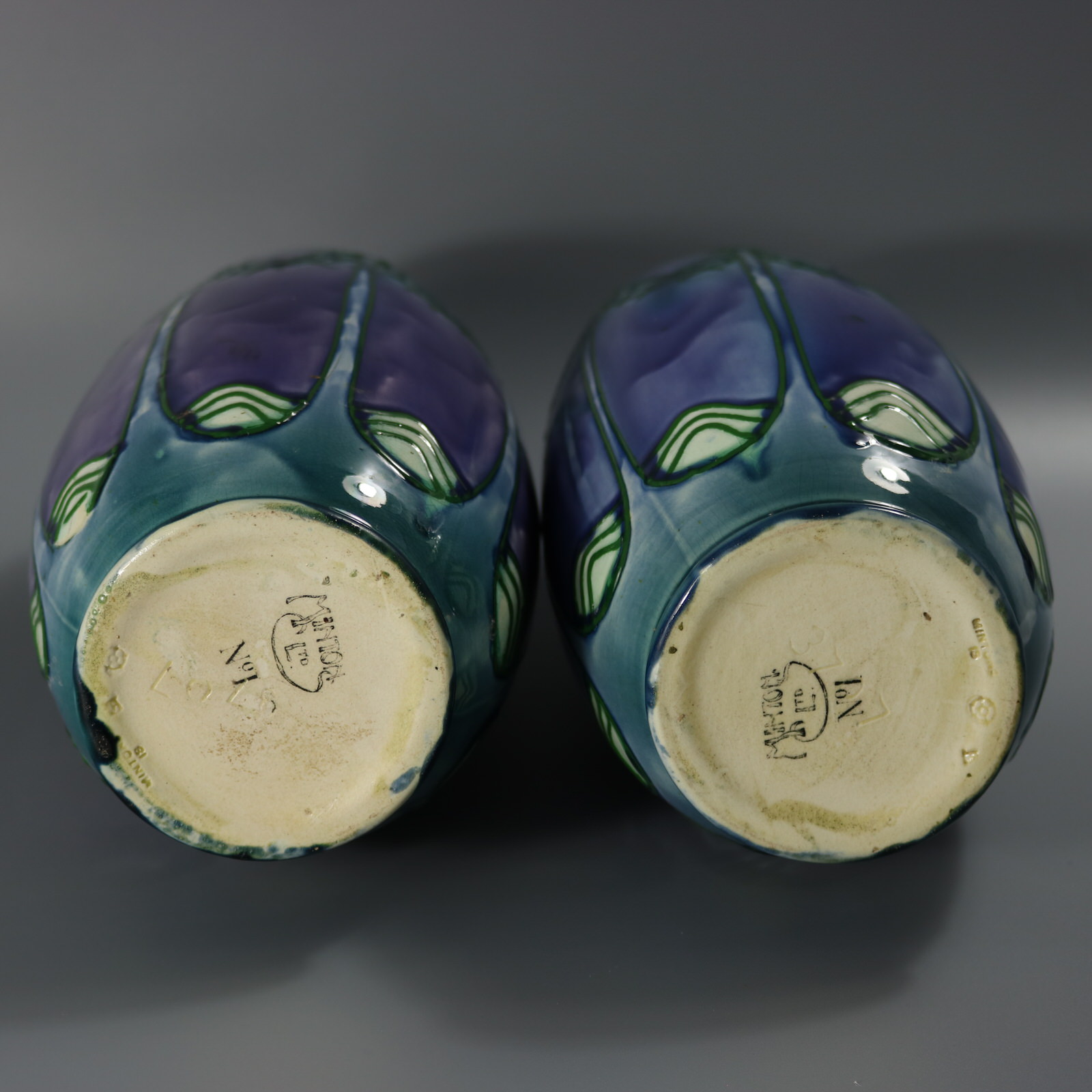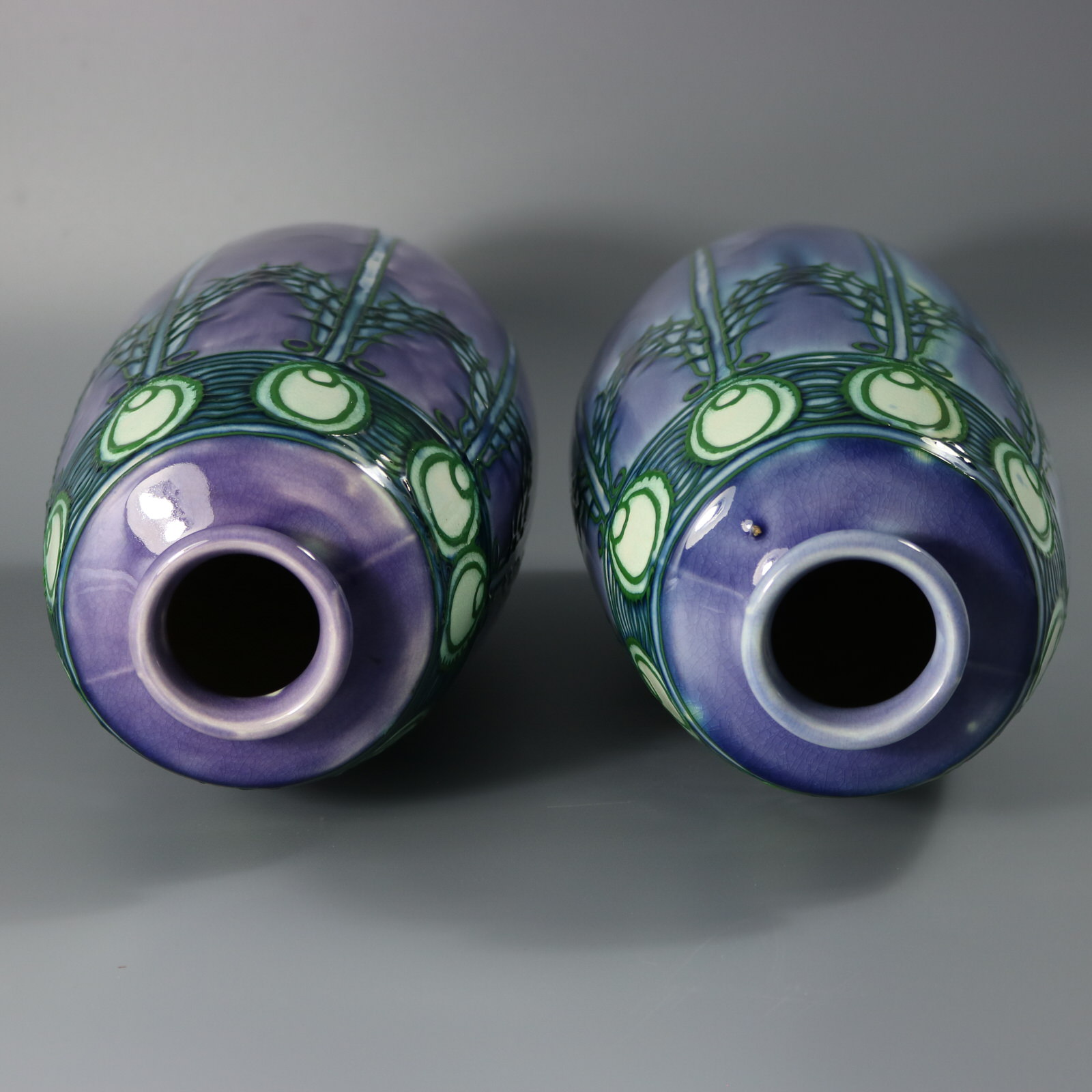 Circa 1918. 12.6ins high, 5.1ins wide, 5.1ins deep. Pair of Minton Secessionist No.1 vases of stretched barrel-like forms. The purple ground is decorated in blue and white slip-trailing, with green tube-lined outlines.