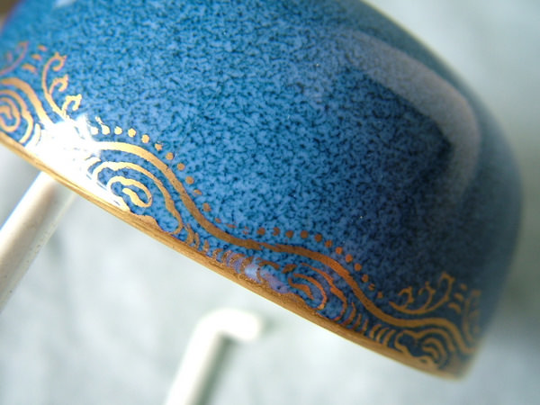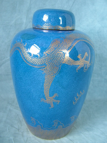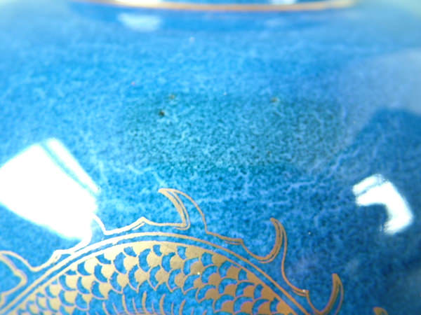 Powder blue exterior. Vase decorated in gilt, with a celestial dragon and sacred pearl with flames motif.