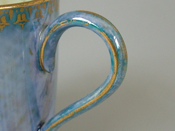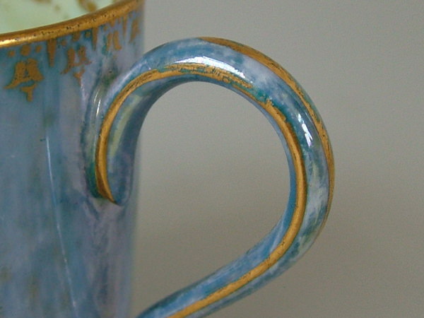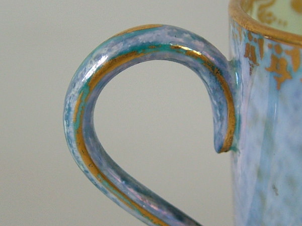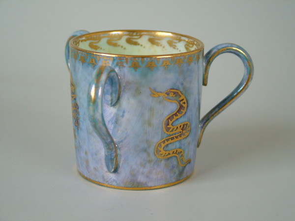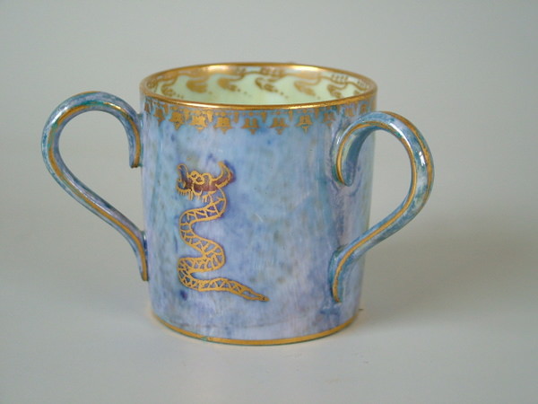 Circa 1910. 2ins high. Small Wedgwood lustre three handled tyg or 'loving cup'. Mottled blue exterior decorated with dragons.