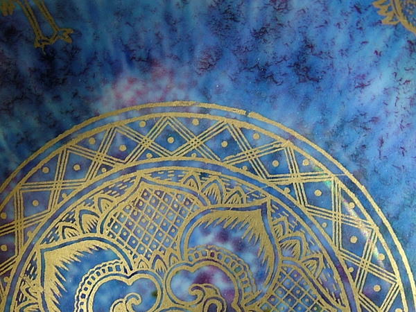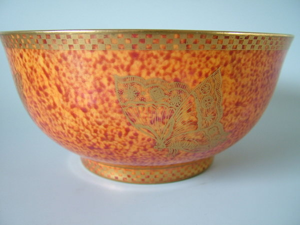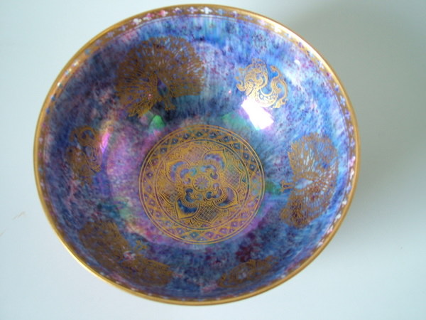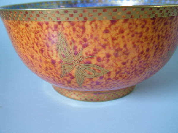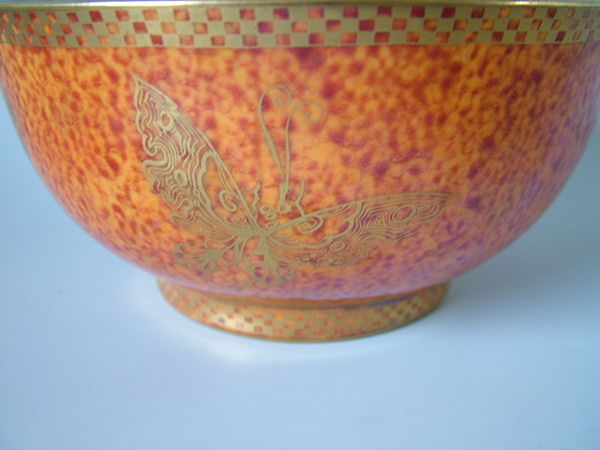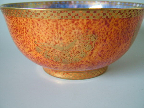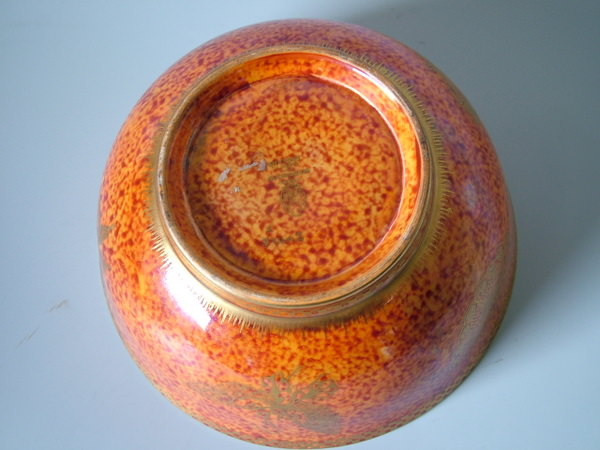 Circa 1920. 6.5ins diameter, 3ins high. Wedgwood orange lustre bowl. Mother of pearl interior with gilt peacock and dragon decorations. Geometric pattern gilt border to inner and outer rims, and foot rim.