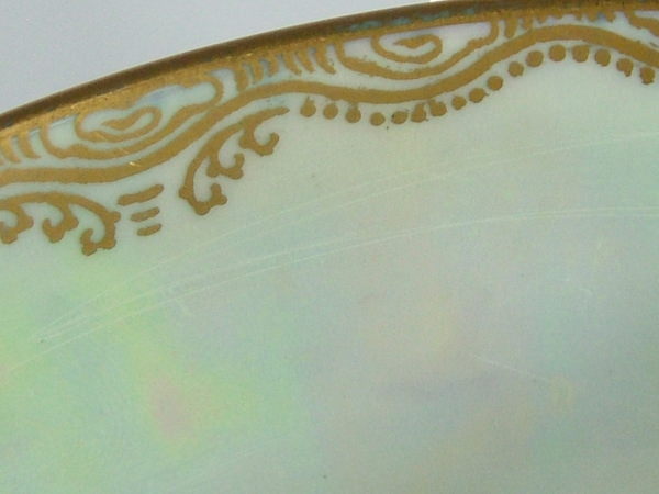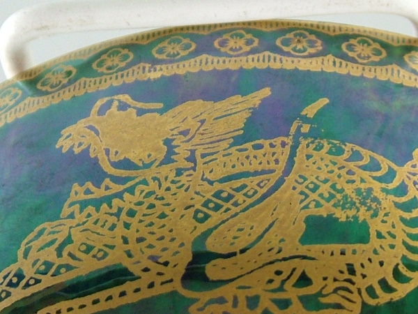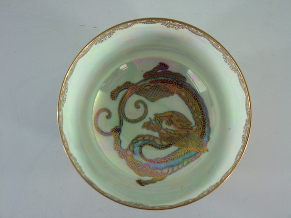 Mother of pearl lustre to interior with central 'Cruel dragon' motif and 'Aquatic bead' border to rim.