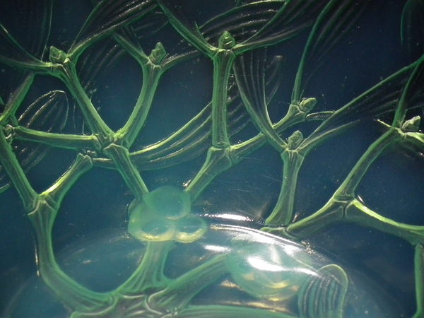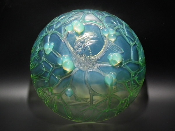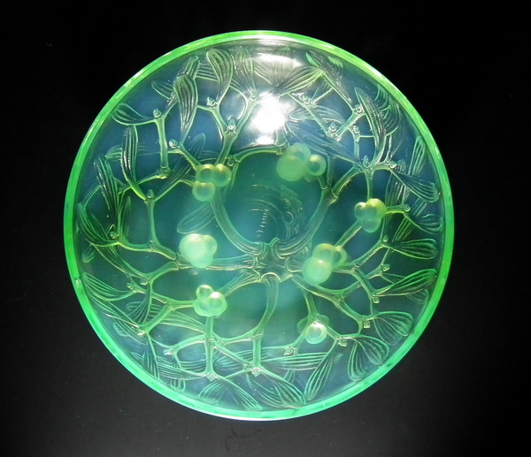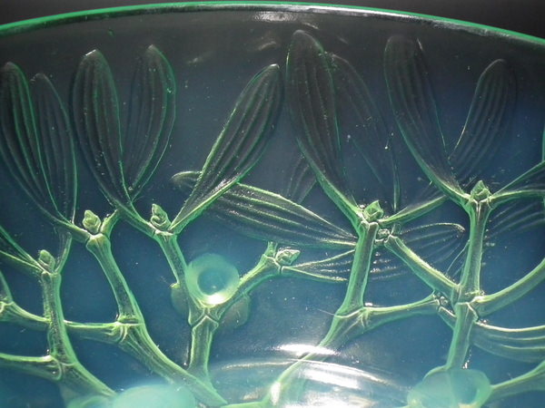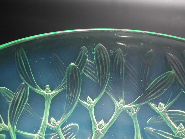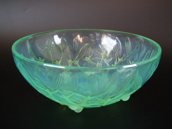 desIntroduced in 1921. Height: 8.7cm (3.25ins). Width: 20.7cm (8.15ins). Depth: 20.7cm (8.15ins). René Lalique Mint/Lime green opalescent Glass 'Gui No2' Bowl. Book reference: Marcilhac 3224.