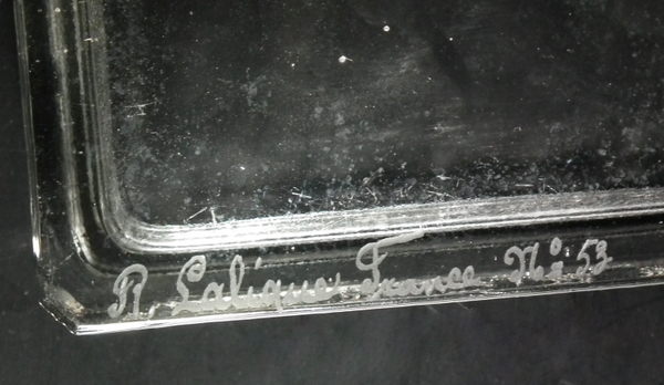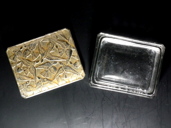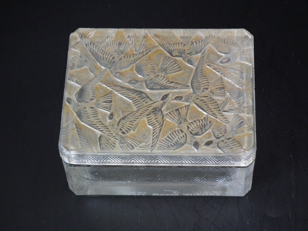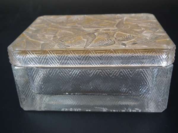 Introduced in 1923. Height: 4.5cm (1.77ins). Width: 10cm (3.94ins). Depth: 8cm (3.15ins).. Rene Lalique Clear and frosted with sepia staining Glass 'Hirondelles' Box . Book reference: Marcilhac 53.