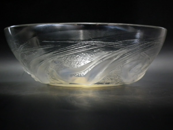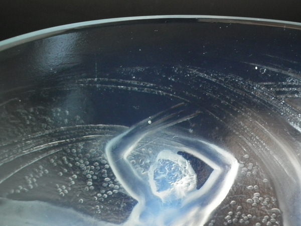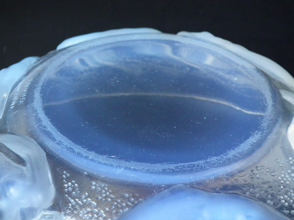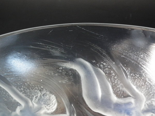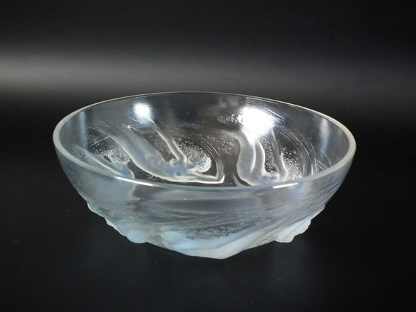 Introduced in 1921. Height: 7cm (2.76ins). Width: 20.8cm (8.19ins). Depth: 20.8cm (8.19ins). René Lalique Opalescent & Clear Glass 'Ondines' Bowl. Book reference: Marcilhac 380.