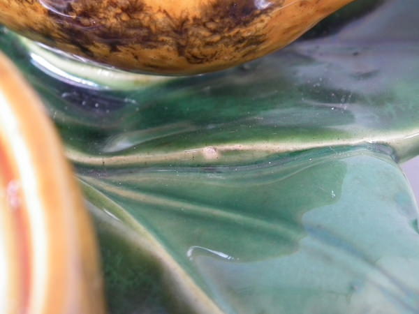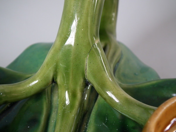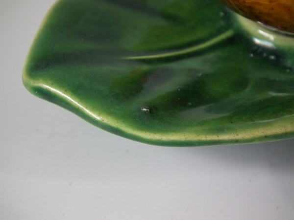 piece of kiln detritus caught in the glaze to central leaf;